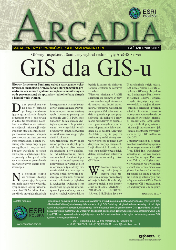 SOFTWARE NEWS MAGAZYN UŻYTKOWNIKÓW OPROGRAMOWANIA ESRI PAŹDZIERNIK 2007 Główny Inspektorat Sanitarny wybrał technologię ArcGIS Server GIS dla GIS-u Główny Inspektorat Sanitarny wdraża rozwiązanie wykorzystujące technologię ArcGIS Server, które pozwoli na prowadzenie – w ramach systemu zarządzania monitoringiem wody przeznaczonej do spożycia – jednolitej bazy danych o jakości wody w kraju. D ane przechowy wa ne będą w formacie geobazy, umożliwia jącym zgromadzenie danych przestrzennych i opisowych w jednolitej strukturze. Doce lowo umożliwi to korzystanie ze spójnych informacji woje wódzkim stacjom epidemiolo giczno-sanitarnym, stacjom powiatowym oraz instytucjom współpracującym, a także wy mianę informacji między po szczególnymi instytucjami. Ponadto wdrażane są także rozwiązania aplikacyjne, któ re pozwolą na bieżącą aktuali zację zasobu oraz prowadzenie zaawansowanych analiz prze strzennych. N a obecnym etapie wdrażania dostęp operacyjny do syste mu mają stacje wojewódzkie, dysponujące oprogramowa niem ArcGIS ArcEditor, które umożliwia przeglądanie, edycję Dodatek redaguje www.esripolska.com.pl i przygotowanie własnych opra cowań analitycznych. Przygo towane opracowania zostaną opublikowane za pomocą roz szerzenia ArcGIS Publisher. Umożliwi to ich szeroką dys trybucję na szczeblu powiato wym i we wszystkich współ pracujących instytucjach, gdzie zainstalowane zostaną przeglą darki ArcReader. Opublikowane mapy mają walor profesjonalnych pro duktów. Są nie tylko ilustra cją graficzną, ale w zależno ści od zdefiniowanej przez autorów funkcjonalności, po zwalają na interaktywne wy korzystanie zawartej w nich informacji, w tym identyfiko wanie obiektów oraz wyszu kiwanie obiektów według za danego kryterium. Szerokie upowszechnienie przeglądar ki ArcReader i związana z tym możliwość oglądania interak tywnych produktów wytworzo nych w stacjach wojewódzkich będzie kluczem do dalszego rozwoju systemu na niższych szczeblach. Właściwa platformie ArcGIS skalowalność zapewni w przy szłości swobodną, dostosowaną do potrzeb i możliwości uczest ników, rozbudowę wdrażanego rozwiązania. Zakładać ona bę dzie włączenie w proces pozy skiwania, aktualizacji i utrzy mania bazy danych co najmniej stacji powiatowych, czy to po przez doposażenie ich w apli kacje klasy desktop (ArcView, ArcEditor), czy to poprzez rozbudowę architektury trój warstwowej obejmującej bazy danych, serwery aplikacji i apli kacji klienckich. Rozwiązania tego typu możliwe będą dzięki dalszej rozbudowie wdrożenia opartego na technologii Arc GIS Server. w drożeniu towarzy szył zakrojony na szeroką skalę pro jekt szkoleniowy, prowadzony od maja do końca lipca br. Wy konawcą projektu było konsor cjum w składzie: AGROTEC POLSKA Sp. z o.o., AGROTEC S.A. oraz ESRI Polska Sp. z o.o. W szkoleniach wzięło udział 120 uczestników rekrutują cych się z Głównego Inspekto ratu Sanitarnego, Państwowe go Zakładu Higieny, Głównego Urzędu Statystycznego oraz wojewódzkich stacji sanitarno-epidemiologicznych. Program szkoleń obejmował zarówno teoretyczne wprowadzenie do zagadnień systemów informa cji geograficznej oraz sateli tarnych technik pozyskiwania informacji przestrzennej, jak i zajęcia praktyczne z wykorzy stania narzędzi GIS i odbiorni ków GPS. Uczestnicy szkoleń mieli możli wość bardzo dokładnego pozna nia oprogramowania ArcGIS firmy ESRI Inc., wdrażanego aktualnie w Głównym Inspek toracie Sanitarnym, Państwo wym Zakładzie Higieny oraz we wszystkich wojewódzkich stacjach sanitarno-epidemiolo gicznych w Polsce. Uczestnicy zapoznali się także gruntow nie z obsługą wdrażanych rów nolegle urządzeń GPS – Mobi le Mapper CE i praktycznym ich wykorzystaniem do pozy dokończenie na s. 38 Firma istnieje na rynku od 1995 roku. Jest wyłącznym dystrybutorem produktów amerykańskiej firmy ESRI, Inc. z Redlands (Kalifornia) – światowego lidera w technologii GIS. Świadczy usługi w dziedzinie: n analizy potrzeb użytkownika dotyczących zakresu funkcjonalnego i informacyjnego tworzonych systemów GIS, n doradztwa w zakresie wykorzystania systemów GIS w różnych dziedzinach zastosowań, n dystrybucji i serwisu oprogramowania GIS firmy ESRI, Inc., n prowadzenia specjalistycznych szkoleń w zakresie tworzenia i wykorzystywania systemów GIS zgodnie z wymaganiami klienta. ESRI Polska Sp. z o.o., 02-595 Warszawa, ul. Puławska 107 tel. (0 22) 326-73-00, faks (0 22) 326-73-01, [email protected] 35 MAGAZYN geoinformacYJNY nr 10 (149) PAŹDZIERNIK 2007 SOFTWARE NEWS Szkolne koła GIS – projekt zakończony sukcesem Wiosną tego roku sukcesem zakończył się pilotażowy projekt edukacyjny skierowany do młodzieży szkolnej z Euroregionu Puszczy Białowieskiej prowadzony przez Stowarzyszenie Dziedzictwo Podlasia (SDP) w partnerstwie z ESRI Polska. P rojekt zakładał powoła nie Szkolnych Kół GIS, w ramach których ucznio wie wspierani przez nauczycieli i specjalistów z SDP zgromadzą informacje o środowisku przy rodniczo-kulturowym swojej gminy, a następnie przetworzą je przy wykorzystaniu technologii systemów informacji przestrzen nej. Projekt pilotażowy poświę cony został gromadzeniu infor macji o toponimach (nazwach miejscowych) wciąż funkcjonu jących wśród mieszkańców gmin Euroregionu Puszczy Białowie skiej wraz z informacją o ich ge nezie słowotwórczej. Przygotowanie badań rozpoczę ło w grudniu 2005 roku semina rium dla nauczycieli. Prace tere nowe realizowane przez uczniów trwały od kwietna do sierpnia 2006 roku, opracowanie wyni ków – do wiosny 2007. Uczniowie i nauczyciele zostali przeszkole ni merytorycznie w zakresie ję zykoznawczym, sposobu prowa dzenia wywiadu i dokumentacji prac terenowych, a także prak tycznie w zakresie obsługi opro gramowania oraz przygotowania i przetwarzania zgromadzonych zasobów informacyjnych. W efekcie powstały lokalne ba zy 