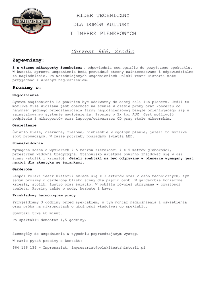 RIDER TECHNICZNY DLA DOMÓW KULTURY I IMPREZ PLENEROWYCH Chrzest 966. Źródło Zapewniamy: 3 x własne mikroporty Sennheiser , odpowiednią scenografię do powyższego spektaklu. W kwestii sprzętu uzgodnienia będą prowadzić strony zainteresowane i odpowiedzialne za nagłośnienie. Po wcześniejszych uzgodnieniach Polski Teatr Historii może przyjechać z własnym nagłośnieniem. Prosimy o: Nagłośnienie System nagłośnienia PA powinien być adekwatny do danej sali lub pleneru. Jeśli to możliwe mile widziana jest obecność na scenie w czasie próby oraz koncertu co najmniej jednego przedstawiciela firmy nagłośnieniowej biegle orientującego się w zainstalowanym systemie nagłośnienia. Prosimy o 2x tor AUX. Jest możliwość podpięcia 3 mikroportów oraz laptopa/odtwarzacz CD przy stole mikserskim. Oświetlenie Światło białe, czerwone, zielone, niebieskie w ogólnym planie, jeżeli to możliwe spot prowadzący. W razie potrzeby posiadamy światła LED. Scena/widownia Wymagana scena o wymiarach 7-5 metrów szerokości i 4-5 metrów głębokości, przestrzeń widowni tradycyjna. Stanowisko akustyka powinno znajdować się w osi sceny (stolik i krzesło). Jeżeli spektakl ma być odgrywany w plenerze wymagany jest namiot dla akustyka ze ściankami. Garderoba Zespół Polski Teatr Historii składa się z 3 aktorów oraz 2 osób technicznych, tym samym prosimy o garderobę blisko sceny dla pięciu osób. W garderobie konieczne krzesła, stolik, lustro oraz światło. W pobliżu również utrzymana w czystości toaleta. Prosimy także o wodę, herbatę i kawę. Przykładowy harmonogram pracy Przyjeżdżamy 3 godziny przed spektaklem, w tym montaż nagłośnienia i oświetlenia oraz próba na mikroportach o głośności właściwej do spektaklu. Spektakl trwa 60 minut. Po spektaklu demontaż 1,5 godziny. Szczegóły do uzgodnienia w tygodniu poprzedzającym występ. W razie pytań prosimy o kontakt: 664 196 136 – Impresariat, [email protected] Ekran kontra kontra k Centralne 1 Proscenium A ux 1 Pulpit 1 Au x Aux 2 Krzyż