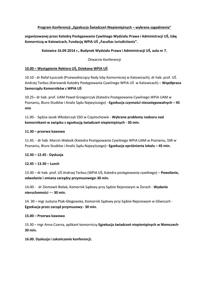 Program Konferencji „Egzekucja Świadczeń Niepieniężnych – wybrane zagadnienia” organizowanej przez Katedrę Postępowania Cywilnego Wydziału Prawa i Administracji UŚ, Izbę Komorniczą w Katowicach, Fundację WPiA UŚ „Facultas Iurisdictionis”. Katowice 16.09.2014 r., Budynek Wydziału Prawa i Administracji UŚ, aula nr 7. Otwarcie Konferencji 10.00 – Wystąpienie Rektora UŚ, Dziekana WPiA UŚ 10.10 - dr Rafał Łyszczek (Przewodniczący Rady Izby Komorniczej w Katowicach), dr hab. prof. UŚ. Andrzej Torbus (Kierownik Katedry Postępowania Cywilnego WPiA UŚ w Katowicach) – Współpraca Samorządu Komorników z WPiA UŚ 10.25– dr hab. prof. UAM Paweł Grzegorczyk (Katedra Postępowania Cywilnego WPiA UAM w Poznaniu, Biuro Studiów i Analiz Sądu Najwyższego) - Egzekucja czynności niezastępowalnych – 45 min 11.00 - Sędzia Jacek Włodarczyk SSO w Częstochowie - Wybrane problemy nadzoru nad komornikami w związku z egzekucją świadczeń niepieniężnych - 30 min. 11.30 – przerwa kawowa 11.45. - dr hab. Marcin Walasik (Katedra Postępowania Cywilnego WPiA UAM w Poznaniu, SSR w Poznaniu, Biuro Studiów i Analiz Sądu Najwyższego)– Egzekucja opróżnienia lokalu – 45 min. 12.30 – 12.45 - Dyskusja 12.45 – 13.30 – Lunch 13.30 – dr hab. prof. UŚ Andrzej Torbus (WPiA UŚ, Katedra postępowania cywilnego) – Powołanie, odwołanie i zmiana zarządcy przymusowego-30 min. 14.00 - dr Ziemowit Bielak, Komornik Sądowy przy Sądzie Rejonowym w Żorach - Wydanie nieruchomości –– 30 min. 14. 30 – mgr Justyna Ptak-Głogowska, Komornik Sądowy przy Sądzie Rejonowym w Gliwicach Egzekucja przez zarząd przymusowy– 30 min. 15.00 – Przerwa kawowa 15.30 – mgr Anna Czarna, aplikant komorniczy Egzekucja świadczeń niepieniężnych w Niemczech30 min. 16.00. Dyskusja i zakończenie konferencji.