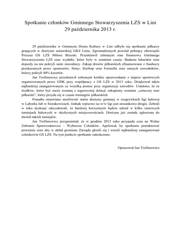 Spotkanie członków Gminnego Stowarzyszenia LZS w Lini 29 października 2013 r. 29 października w Gminnym Domu Kultury w Lini odbyło się spotkanie piłkarzy grających w drużynie seniorskiej GKS Linia. Zgromadzonych powitał pełniący obowiązki Prezesa GS LZS Miłosz Brzeski. Przedstawił zebranym stan finansowy Gminnego Stowarzyszenia LZS oraz wydatki, które były w ostatnim czasie. Badania lekarskie oraz dojazdy na nie pokryli sami zawodnicy. Zakup dresów piłkarskich sfinansowano z funduszy przekazanych przez sponsorów, firmy: Styrhop oraz Formella oraz samych zawodników, którzy pokryli 40% kosztów. Jan Trofimowicz przedstawił zebranym krótkie sprawozdanie z imprez sportowych organizowanych przez GDK przy współpracy z GS LZS w 2013 roku. Dziękował także najbardziej zaangażowanym za wszelką pomoc przy organizacji zawodów. Ustalono, że ze środków, które być może zostaną z tegorocznej dotacji zakupiony zostanie „sztuczny mur piłkarski”, który przyda się w czasie treningów piłkarskich. Ponadto omawiano możliwość startu drużyny gminnej w rozgrywkach ligi halowej w Lęborku lub w Sierakowicach. Jednak wpisowe na w/w ligi jest stosunkowo drogie. Zebrali w toku dyskusji zdecydowali, że bardziej korzystnym będzie udział w kilku zimowych turniejach halowych w okolicznych miejscowościach. Drużyna już została zgłoszona do dwóch takich turniejów. Jan Trofimowicz przypominał, że w grudniu 2013 roku przypada czas na Walne Zebranie Sprawozdawczo – Wyborcze Członków. Apelował, by spotkanie potraktować poważnie oraz aby w skład gremium Zarządu głosili się i weszli najbardziej zaangażowani członkowie GS LZS. Na tym punkcie spotkanie zakończono. Opracował Jan Trofimowicz