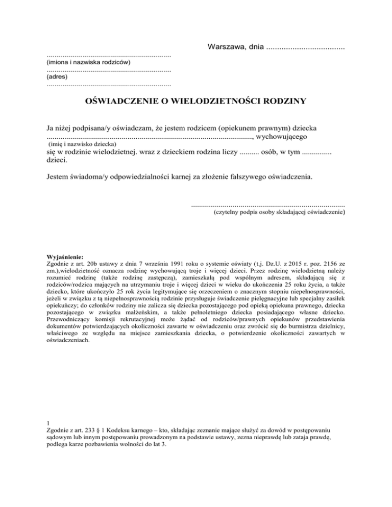 Warszawa, dnia .................................... .............................................................. (imiona i nazwiska rodziców) .............................................................. (adres) .............................................................. OŚWIADCZENIE O WIELODZIETNOŚCI RODZINY Ja niżej podpisana/y oświadczam, że jestem rodzicem (opiekunem prawnym) dziecka ........................................................................................................, wychowującego (imię i nazwisko dziecka) się w rodzinie wielodzietnej. wraz z dzieckiem rodzina liczy .......... osób, w tym ............... dzieci. Jestem świadoma/y odpowiedzialności karnej za złożenie fałszywego oświadczenia. .............................................................................. (czytelny podpis osoby składającej oświadczenie) Wyjaśnienie: Zgodnie z art. 20b ustawy z dnia 7 września 1991 roku o systemie oświaty (t.j. Dz.U. z 2015 r. poz. 2156 ze zm.),wielodzietność oznacza rodzinę wychowującą troje i więcej dzieci. Przez rodzinę wielodzietną należy rozumieć rodzinę (także rodzinę zastępczą), zamieszkałą pod wspólnym adresem, składającą się z rodziców/rodzica mających na utrzymaniu troje i więcej dzieci w wieku do ukończenia 25 roku życia, a także dziecko, które ukończyło 25 rok życia legitymujące się orzeczeniem o znacznym stopniu niepełnosprawności, jeżeli w związku z tą niepełnosprawnością rodzinie przysługuje świadczenie pielęgnacyjne lub specjalny zasiłek opiekuńczy; do członków rodziny nie zalicza się dziecka pozostającego pod opieką opiekuna prawnego, dziecka pozostającego w związku małżeńskim, a także pełnoletniego dziecka posiadającego własne dziecko. Przewodniczący komisji rekrutacyjnej może żądać od rodziców/prawnych opiekunów przedstawienia dokumentów potwierdzających okoliczności zawarte w oświadczeniu oraz zwrócić się do burmistrza dzielnicy, właściwego ze względu na miejsce zamieszkania dziecka, o potwierdzenie okoliczności zawartych w oświadczeniach. 1 Zgodnie z art. 233 § 1 Kodeksu karnego – kto, składając zeznanie mające służyć za dowód w postępowaniu sądowym lub innym postępowaniu prowadzonym na podstawie ustawy, zezna nieprawdę lub zataja prawdę, podlega karze pozbawienia wolności do lat 3. Warszawa, dnia .................................... .............................................................. (imię i nazwisko rodzica) .............................................................. (adres) .............................................................. OŚWIADCZENIE O SAMOTNYM WYCHOWYWANIU DZIECKA Ja niżej podpisana/y oświadczam, że jestem rodzicem (opiekunem prawnym) dziecka ........................................................................................................ . (imię i nazwisko dziecka) Oświadczam, że wyżej wymienione dziecko wychowuję samotnie oraz nie wychowuję żadnego dziecka wspólnie z jego rodzicem. Jestem świadoma/y odpowiedzialności karnej za złożenie fałszywego oświadczenia. .............................................................................. (czytelny podpis osoby składającej oświadczenie) Wyjaśnienie: Zgodnie z art. 20b pkt 2 ustawy z dnia 7 września 1991 r. o systemie oświaty (t.j. Dz.U. z 2015 r. poz. 2156 ze zm.) – samotne wychowywanie dziecka oznacza wychowywanie dziecka przez pannę, kawalera, wdowę, wdowca, osobę pozostającą w separacji orzeczonej prawomocnym wyrokiem sądu, osobę rozwiedzioną, chyba że osoba taka wychowuje wspólnie co najmniej jedno dziecko z jego rodzicem. Przewodniczący komisji rekrutacyjnej może żądać od rodziców/prawnych opiekunów przedstawienia dokumentów potwierdzających okoliczności zawarte w oświadczeniu oraz zwrócić się do burmistrza dzielnicy, właściwego ze względu na miejsce zamieszkania dziecka, o potwierdzenie okoliczności zawartych w oświadczeniach. 1 Zgodnie z art. 233 § 1 Kodeksu karnego – kto, składając zeznanie mające służyć za dowód w postępowaniu sądowym lub innym postępowaniu prowadzonym na podstawie ustawy, zezna nieprawdę lub zataja prawdę, podlega karze pozbawienia wolności do lat 3. Warszawa, dnia .................................... .............................................................. (imię i nazwisko rodzica) .............................................................. (adres) .............................................................. OŚWIADCZENIE O WYSOKOŚCI DOCHODU W RODZINIE Ja niżej podpisana/y oświadczam, że jestem rodzicem (opiekunem prawnym) dziecka ........................................................................................................ . (imię i nazwisko dziecka) Oświadczam, że wraz z wyżej wymienionym dzieckiem rodzina liczy .............. osób, a wysokość dochodu w rodzinie, będącego podstawą obliczenia wysokości dochodu na osobę w rodzinie kandydata wynosi ……….……………. zł. Jestem świadoma/y odpowiedzialności karnej za złożenie fałszywego oświadczenia. .............................................................................. (czytelny podpis osoby składającej oświadczenie) Wyjaśnienie: Zgodnie z art. 20c ust. 9-10 ustawy o systemie oświaty: – przy obliczaniu dochodu członka rodziny bierze się pod uwagę przeciętny miesięczny dochód z 3 miesięcy wybranych spośród ostatnich 6 miesięcy poprzedzających złożenie wniosku, – pod pojęciem dochodu rozumie się dochód, o którym mowa w art. 3 pkt 1 ustawy z dnia 28 listopada 2003 r. o świadczeniach rodzinnych, z tym że w przypadku przychodów podlegających opodatkowaniu na zasadach określonych w art. 27, art. 30b, art. 30c i art. 30e ustawy z dnia 26 lipca 1991 r. o podatku dochodowym od osób fizycznych (Dz. U. z 2012 r. poz. 361, z późn. zm.), pomniejsza się je o koszty uzyskania przychodu, zaliczki na podatek do