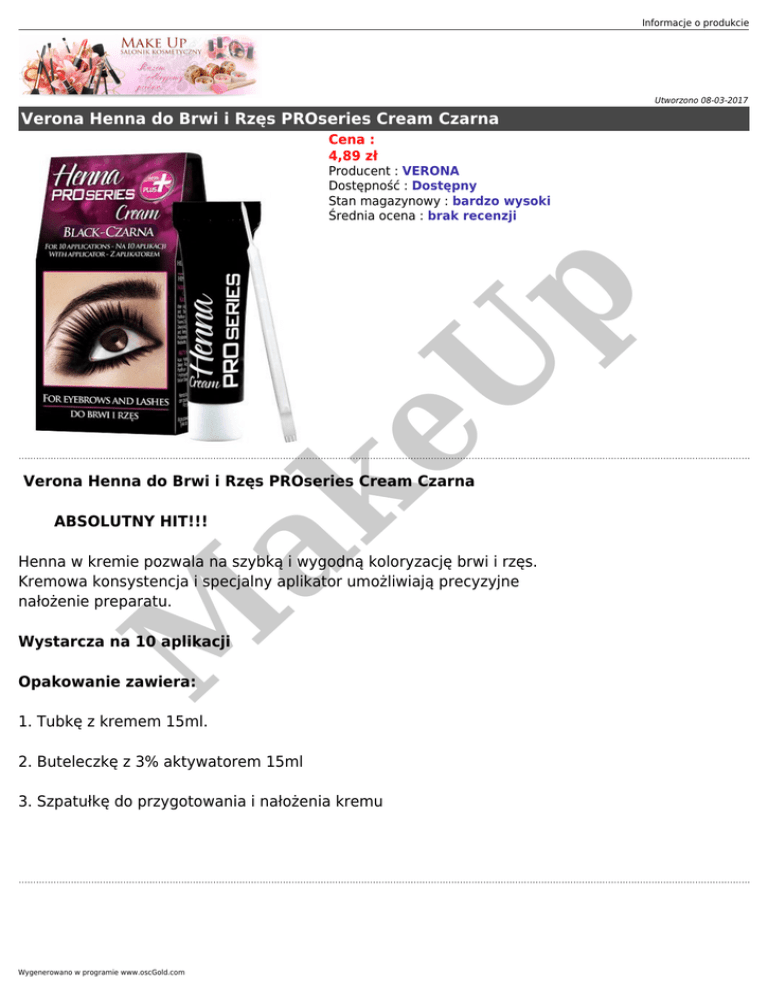 Informacje o produkcie Utworzono 08-03-2017 Verona Henna do Brwi i Rzęs PROseries Cream Czarna Cena : 4,89 zł ak eU p Producent : VERONA Dostępność : Dostępny Stan magazynowy : bardzo wysoki Średnia ocena : brak recenzji Verona Henna do Brwi i Rzęs PROseries Cream Czarna ABSOLUTNY HIT!!! M Henna w kremie pozwala na szybką i wygodną koloryzację brwi i rzęs. Kremowa konsystencja i specjalny aplikator umożliwiają precyzyjne nałożenie preparatu. Wystarcza na 10 aplikacji Opakowanie zawiera: 1. Tubkę z kremem 15ml. 2. Buteleczkę z 3% aktywatorem 15ml 3. Szpatułkę do przygotowania i nałożenia kremu Wygenerowano w programie www.oscGold.com