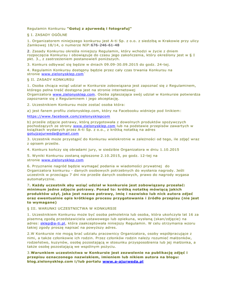 Regulamin Konkursu "Gotuj z ajurwedą i fotografuj" § I. ZASADY OGÓLNE 1. Organizatorem niniejszego konkursu jest A-ti Sp. z o.o. z siedzibą w Krakowie przy ulicy Zamkowej 18/14, o numerze NIP:676-246-61-48 2. Zasady Konkursu określa niniejszy Regulamin, który wchodzi w życie z dniem rozpoczęcia Konkursu i obowiązuje do czasu jego zakończenia, który określony jest w § I pkt. 3., z zastrzeżeniem postanowień poniższych. 3. Konkurs odbywać się będzie w dniach 09.09-30.09.2015 do godz. 24-tej. 4. Regulamin Konkursu dostępny będzie przez cały czas trwania Konkursu na stronie www.zielonysklep.com` § II. ZASADY KONKURSU 1. Osoba chcąca wziąć udział w Konkursie zobowiązana jest zapoznać się z Regulaminem, którego pełna treść dostępna jest na stronie internetowej Organizatora www.zielonysklep.com. Osoba zgłaszająca swój udział w Konkursie potwierdza zapoznanie się z Regulaminem i jego akceptację. 2. Uczestnikiem Konkursu może zostać osoba która: a) jest fanem profilu zielonysklep.com, który na Facebooku widnieje pod linikiem : https://www.facebook.com/zielonysklepcom b) prześle zdjęcie potrawy, którą przygotowała z dowolnych produktów spożywczych pochodzących ze strony www.zielonysklep.com lub na podstawie przepisów zawartych w książkach wydanych przez A-ti Sp. z o.o., z krótką notatką na adres [email protected] 3. Uczestnik może przystąpić do Konkursu wielokrotnie w zależności od tego, ile zdjęć wraz z opisem prześle. 4. Konkurs kończy się obradami jury, w siedzibie Organizatora w dniu 1.10.2015 5. Wyniki Konkursu zostaną ogłoszone 2.10.2015, po godz. 12-tej na stronie www.zielonysklep.com 6. Przyznanie nagród będzie wymagać podania w wiadomości prywatnej do Organizatora konkursu - danych osobowych potrzebnych do wysłania nagrody. Jeśli uczestnik w przeciągu 7 dni nie prześle danych osobowych, prawo do nagrody wygasa automatycznie. 7. Każdy uczestnik aby wziąć udział w konkursie jest zobowiązany przesłać: minimum jedno zdjęcie potrawy. Ponad to: krótką notatkę mówiącą jakich produktów użył, jaka jest nazwa potrawy, imię i nazwisko lub nick autora zdjeć oraz ewentualnie opis krótkiego procesu przygotowania i źródło przepisu (nie jest to wymagane) § III. WARUNKI UCZESTNICTWA W KONKURSIE 1. Uczestnikiem Konkursu może być osoba pełnoletnia lub osoba, która ukończyła lat 16 za pisemną zgodą przedstawiciela ustawowego lub opiekuna, wysłaną (skan/zdjęcie) na adres: [email protected], która zaakceptowała niniejszy Regulamin. W celu otrzymania wzoru takiej zgody proszę napisać na powyższy adres. 2.W Konkursie nie mogą brać udziału pracownicy Organizatora, osoby współpracujące z nimi, a także członkowie ich rodzin. Przez członków rodzin należy rozumieć małżonków, rodzeństwo, kuzynów, osobę pozostającą w stosunku przysposobienia lub jej małżonka, a także osobę pozostającą we wspólnym pożyciu. 3.Warunkiem uczestnictwa w Konkursie jest zezwolenie na publikację zdjęć i przepisu oznaczonego nazwiskiem, imieniem lub nikiem autora na blogu: blog.zielonysklep.com i/lub portalu www.a-ajurweda.pl § IV. DANE OSOBOWE 1. Dane osobowe przekazane Organizatorowi przez uczestników Konkursu będą przez niego przetwarzane w celu: a) realizacji Konkursu b) wyłonienia zwycięzcy Konkursu c) wysłania nagrody konkursowej d) publikacji zdjęcia na blogu, profilu Facebook, portalu a-ajurweda.pl, ze wskazaniem autora zdjęć 2. Każdy uczestnik Konkursu posiada prawo wglądu do swoich danych osobowych, do ich poprawiania oraz usunięcia. Dane osobowe będą przetwarzane przez Organizatora zgodnie z przepisami ustawy z dnia 29 sierpnia 1997r. o ochronie danych osobowych (t.j.: Dz.U. z 2002 r. Nr 101, poz. 926 z pózn. zm.) § V. NAGRODA Zostanie przyznana nagroda główna oraz dwa wyróżnienia wyłonione w drodze obrad jury. Nagroda główna to książka "Gotuj z ajurwedą dla zdrowia" oraz zestaw produktów spożywczych wybranych przez organizatora konkursu. Dwa wyróżnienia to: "Ajurwedyjska książka kucharska" . Nagrody nie mogą zostać zamienione na gotówkę. § VI. POSTANOWIENIE KOŃCOWE 1. Przystąpienie do udziału w Konkursie jest jednoznaczne z przyjęciem warunków niniejszego Regulaminu. 3. Ogłoszenie o wyborze zwycięzcy, stanowiące publikację wyników Konkursu, nastąpi na stronie www.zielonysklep.com 4. Uczestnik Konkursu wyraża zgodę na publikację oraz wykorzystanie informacji, o których mowa w Par. IV.1. 5. O przyznaniu Nagrody każdy z nagrodzonych Uczestników zostanie dodatkowo poinformowany za pośrednictwem wiadomości prywatnej. W razie dodatkowych pytań oraz przesłania zgody dl a osoby niepełnoletniej uprzejmie prosimy o kontakt pod adresem: [email protected]