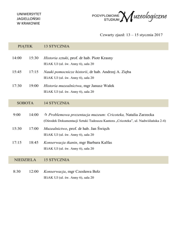 UNIWERSYTET JAGIELLOŃSKI W KRAKOWIE Czwarty zjazd: 13 – 15 stycznia 2017 PIĄTEK 14:00 15:30 13 STYCZNIA Historia sztuki, prof. dr hab. Piotr Krasny IEiAK UJ (ul. św. Anny 6), sala 20 15:45 17:15 Nauki pomocnicze historii, dr hab. Andrzej A. Zięba IEiAK UJ (ul. św. Anny 6), sala 20 17:30 19:00 Historia muzealnictwa, mgr Janusz Wałek IEiAK UJ (ul. św. Anny 6), sala 20 SOBOTA 9:00 14:00 14 STYCZNIA Problemowa prezentacja muzeum: Cricoteka, Natalia Zarzecka (Ośrodek Dokumentacji Sztuki Tadeusza Kantora „Cricoteka”, ul. Nadwiślańska 2-4) 15:30 17:00 Muzealnictwo, prof. dr hab. Jan Święch IEiAK UJ (ul. św. Anny 6), sala 20 17:15 18:45 Konserwacja tkanin, mgr Barbara Kalfas IEiAK UJ (ul. św. Anny 6), sala 20 NIEDZIELA 15 STYCZNIA 8:30 Konserwacja, mgr Czesława Bełz 12:00 IEiAK UJ (ul. św. Anny 6), sala 20
