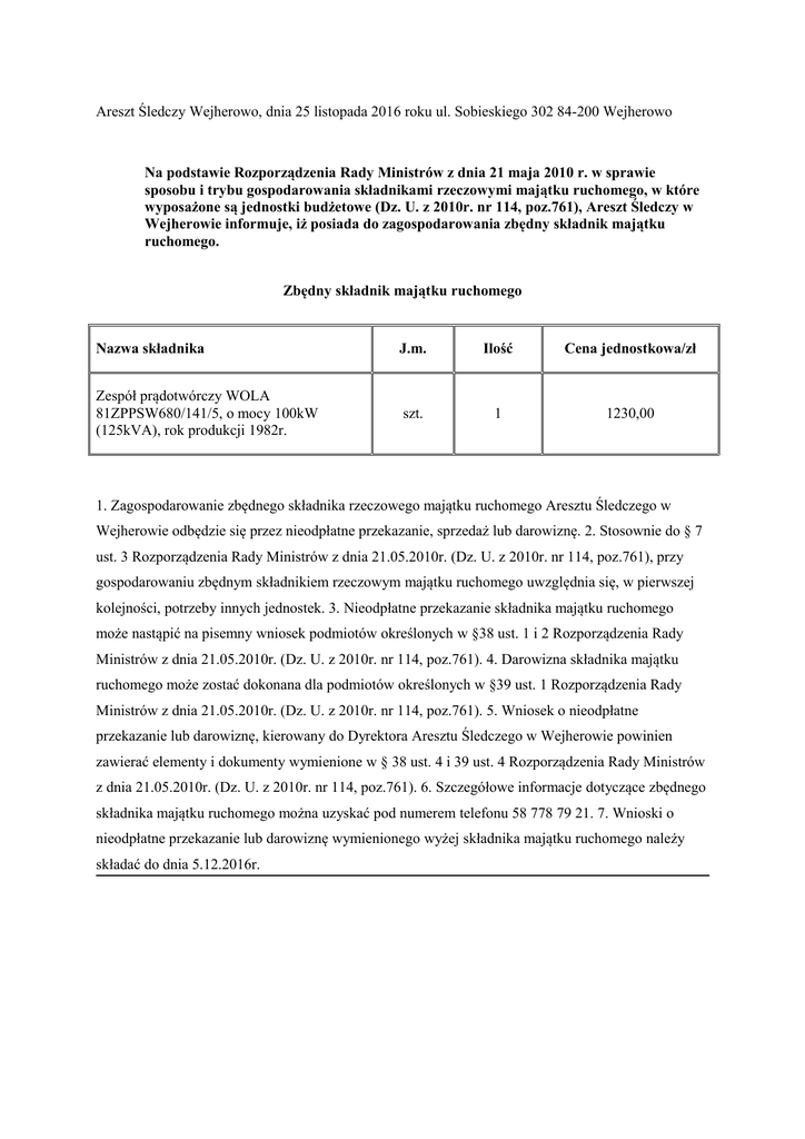 Areszt Śledczy Wejherowo, dnia 25 listopada 2016 roku ul. Sobieskiego 302 84-200 Wejherowo Na podstawie Rozporządzenia Rady Ministrów z dnia 21 maja 2010 r. w sprawie sposobu i trybu gospodarowania składnikami rzeczowymi majątku ruchomego, w które wyposażone są jednostki budżetowe (Dz. U. z 2010r. nr 114, poz.761), Areszt Śledczy w Wejherowie informuje, iż posiada do zagospodarowania zbędny składnik majątku ruchomego. Zbędny składnik majątku ruchomego Nazwa składnika J.m. Ilość Cena jednostkowa/zł Zespół prądotwórczy WOLA 81ZPPSW680/141/5, o mocy 100kW (125kVA), rok produkcji 1982r. szt. 1 1230,00 1. Zagospodarowanie zbędnego składnika rzeczowego majątku ruchomego Aresztu Śledczego w Wejherowie odbędzie się przez nieodpłatne przekazanie, sprzedaż lub darowiznę. 2. Stosownie do § 7 ust. 3 Rozporządzenia Rady Ministrów z dnia 21.05.2010r. (Dz. U. z 2010r. nr 114, poz.761), przy gospodarowaniu zbędnym składnikiem rzeczowym majątku ruchomego uwzględnia się, w pierwszej kolejności, potrzeby innych jednostek. 3. Nieodpłatne przekazanie składnika majątku ruchomego może nastąpić na pisemny wniosek podmiotów określonych w §38 ust. 1 i 2 Rozporządzenia Rady Ministrów z dnia 21.05.2010r. (Dz. U. z 2010r. nr 114, poz.761). 4. Darowizna składnika majątku ruchomego może zostać dokonana dla podmiotów określonych w §39 ust. 1 Rozporządzenia Rady Ministrów z dnia 21.05.2010r. (Dz. U. z 2010r. nr 114, poz.761). 5. Wniosek o nieodpłatne przekazanie lub darowiznę, kierowany do Dyrektora Aresztu Śledczego w Wejherowie powinien zawierać elementy i dokumenty wymienione w § 38 ust. 4 i 39 ust. 4 Rozporządzenia Rady Ministrów z dnia 21.05.2010r. (Dz. U. z 2010r. nr 114, poz.761). 6. Szczegółowe informacje dotyczące zbędnego składnika majątku ruchomego można uzyskać pod numerem telefonu 58 778 79 21. 7. Wnioski o nieodpłatne przekazanie lub darowiznę wymienionego wyżej składnika majątku ruchomego należy składać do dnia 5.12.2016r.