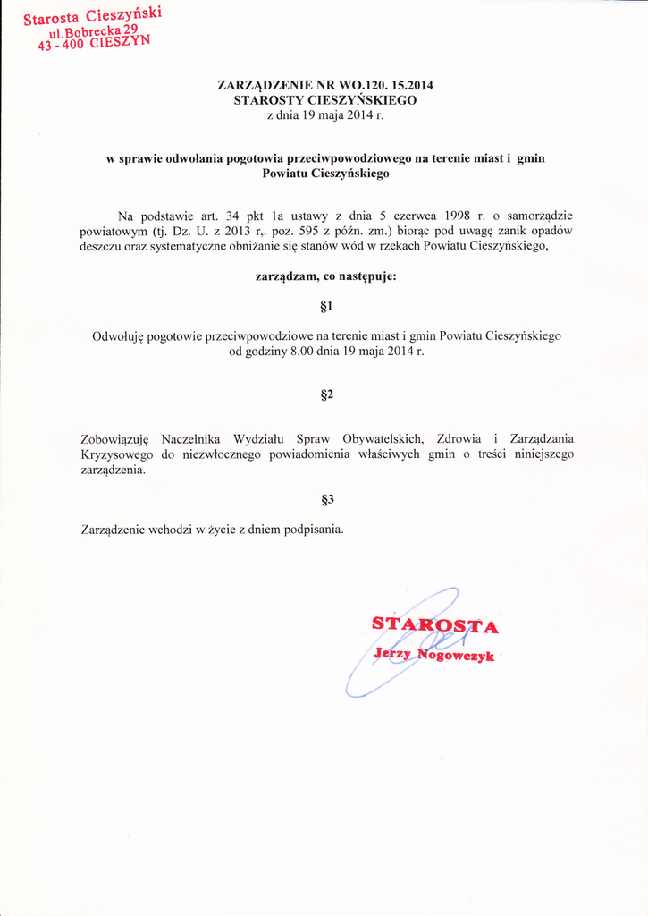 Cieszyński Starosta - -łl."."łtiiśśżł* ZARZĄDZENIE NR wo. 12 0. 15.201,4 STAROSTY CIESZYŃSXrnCO z dnia 19 maja 2014 r. w sprawie odwołania pogotowia przeciwpowodziowego na terenie miast Powiatu Cieszyńskiego i gmin Na podstawie art. 34 pkt la ustawy z dnia 5 czervvca 1998 r. o samorządzie powiatowyrrr (tj. Dz. U. z 2013 r,. poz. 595 z póżn. zm.) biorąc pod uwagę zanlk opadów deszczu oraz systematyczne obniżanie się stanów wód w rzękachPowiatu Cieszyńskiego, zarządzam. co następuj e: §1 Odwołuję pogotowie przeciwpowodziowe na terenie miast i gmin Powiatu Cieszyńskiego od godziny 8.00 dnia 19 mĄa20l4r. §2 Zobowiązuję Naczelnika Wydziału Spraw Obywatelskich, Zdrowia i Zarządzania Kryzysowego do niezwłocznego powiadomienia właściwychgmin o treści niniejszego zarządzenia. §3 Zarządzenie wchodzi w życie z dniem podpisania. §TARo§jTA te(zy rdo.L"vr