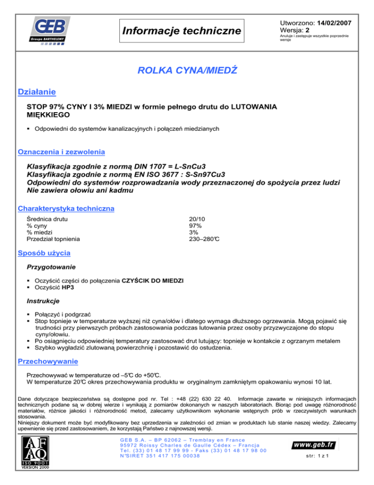 Informacje techniczne Utworzono: 14/02/2007 Wersja: 2 Anuluje i zastępuje wszystkie poprzednie wersje ROLKA CYNA/MIEDŹ Działanie STOP 97% CYNY I 3% MIEDZI w formie pełnego drutu do LUTOWANIA MIĘKKIEGO Odpowiedni do systemów kanalizacyjnych i połączeń miedzianych Oznaczenia i zezwolenia Klasyfikacja zgodnie z normą DIN 1707 = L-SnCu3 Klasyfikacja zgodnie z normą EN ISO 3677 : S-Sn97Cu3 Odpowiedni do systemów rozprowadzania wody przeznaczonej do spożycia przez ludzi Nie zawiera ołowiu ani kadmu Charakterystyka techniczna Średnica drutu % cyny % miedzi Przedział topnienia 20/10 97% 3% 230–280°C Sposób użycia Przygotowanie Oczyścić części do połączenia CZYŚCIK DO MIEDZI Oczyścić HP3 Instrukcje Połączyć i podgrzać Stop topnieje w temperaturze wyższej niż cyna/ołów i dlatego wymaga dłuższego ogrzewania. Mogą pojawić się trudności przy pierwszych próbach zastosowania podczas lutowania przez osoby przyzwyczajone do stopu cyny/ołowiu. Po osiągnięciu odpowiedniej temperatury zastosować drut lutujący: topnieje w kontakcie z ogrzanym metalem Szybko wygładzić zlutowaną powierzchnię i pozostawić do ostudzenia. Przechowywanie Przechowywać w temperaturze od –5°C do +50°C. W temperaturze 20°C okres przechowywania produktu w oryginalnym zamkniętym opakowaniu wynosi 10 lat. Dane dotyczące bezpieczeństwa są dostępne pod nr. Tel : +48 (22) 630 22 40. Informacje zawarte w niniejszych informacjach technicznych podane są w dobrej wierze i wynikają z pomiarów dokonanych w naszych laboratoriach. Biorąc pod uwagę różnorodność materiałów, różnice jakości i różnorodność metod, zalecamy użytkownikom wykonanie wstępnych prób w rzeczywistych warunkach stosowania. Niniejszy dokument może być modyfikowany bez uprzedzenia w zależności od zmian w produktach lub stanie naszej wiedzy. Zalecamy upewnienie się przed zastosowaniem, że korzystają Państwo z najnowszej wersji. GEB S.A. – BP 62062 – Tremblay en France 95972 Roissy Charles de Gaulle Cédex – Francja Tel. (33) 01 48 17 99 99 - Faks (33) 01 48 17 98 00 N °S I R E T 3 5 1 4 1 7 1 7 5 0 0 0 3 8 str: 1 z 1