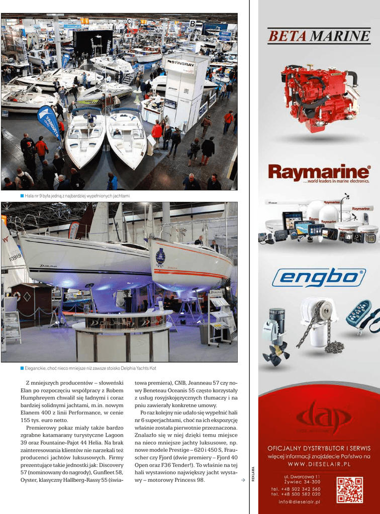 n Hala nr 9 była jedną z najbardziej wypełnionych jachtami Z mniejszych producentów – słoweński Elan po rozpoczęciu współpracy z Robem Humphreyem chwalił się ładnymi i coraz bardziej solidnymi jachtami, m.in. nowym Elanem 400 z linii Performance, w cenie 155 tys. euro netto. Premierowy pokaz miały także bardzo zgrabne katamarany turystyczne Lagoon 39 oraz Fountaine-Pajot 44 Helia. Na brak zainteresowania klientów nie narzekali też producenci jachtów luksusowych. Firmy prezentujące takie jednostki jak: Discovery 57 (nominowany do nagrody), Gunfleet 58, Oyster, klasyczny Hallberg-Rassy 55 (świa- towa premiera), CNB, Jeanneau 57 czy nowy Beneteau Oceanis 55 często korzystały z usług rosyjskojęzycznych tłumaczy i na pniu zawierały konkretne umowy. Po raz kolejny nie udało się wypełnić hali nr 6 superjachtami, choć na ich ekspozycję właśnie została pierwotnie przeznaczona. Znalazło się w niej dzięki temu miejsce na nieco mniejsze jachty luksusowe, np. nowe modele Prestige – 620 i 450 S, Frauscher czy Fjord (dwie premiery – Fjord 40 Open oraz F36 Tender!). To właśnie na tej hali wystawiono największy jacht wystawy – motorowy Princess 98. reklama n Eleganckie, choć nieco mniejsze niż zawsze stoisko Delphia Yachts Kot 43