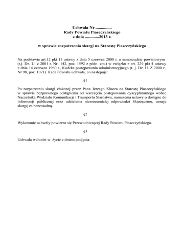 Uchwała Nr ............... Rady Powiatu Piaseczyńskiego z dnia .............2013 r. w sprawie rozpatrzenia skargi na Starostę Piaseczyńskiego Na podstawie art.12 pkt 11 ustawy z dnia 5 czerwca 2008 r. o samorządzie powiatowym (t.j. Dz. U. z 2001 r. Nr 142, poz. 1592 z późn. zm.) w związku z art. 229 pkt 4 ustawy z dnia 14 czerwca 1960 r., Kodeks postępowania administracyjnego (t. j. Dz. U. Z 2000 r., Nr 98, poz. 1071) Rada Powiatu uchwala, co następuje: §1 Po rozpatrzeniu skargi złożonej przez Pana Jerzego Klucza na Starostę Piaseczyńskiego w sprawie bezprawnego odstąpienia od wszczęcia postępowania dyscyplinarnego wobec Naczelnika Wydziału Komunikacji i Transportu Starostwa, naruszenia ustawy o dostępie do informacji publicznej oraz udzielenia niezrozumiałej odpowiedzi Skarżącemu, uznaje skargę za bezzasadną. §2 Wykonanie uchwały powierza się Przewodniczącej Rady Powiatu Piaseczyńskiego. §3 Uchwała wchodzi w życie z dniem podjęcia. Uzasadnienie Pismem z dnia 18.07.2013 r., (data wpływu do urzędu 22.07.2013 r.), Pan Jerzy Klucz złożył skargę do Rady Powiatu Piaseczyńskiego na Starostę Piaseczyńskiego w sprawie bezprawnego odstąpienia od wszczęcia postępowania dyscyplinarnego wobec Naczelnika Wydziału Komunikacji i Transportu Starostwa, naruszenia ustawy o dostępie do informacji publicznej oraz udzielenia niezrozumiałej odpowiedzi Skarżącemu na złożoną skargę. Ponieważ miesięczny termin do rozpatrzenia skargi, określony w art. 237 Kpa upływa w dniu 22.08.2013 r. a nie są planowane w sierpniu z uwagi na okres wakacyjny sesje Rady Powiatu, pismem z dnia 01.08.2013 r., Przewodnicząca Rady zawiadomiła Skarżącego o wydłużeniu terminu niezbędnego do jej rozpatrzenia - do dnia 30 września 2013 r. Stan faktyczny sprawy stanowiącej przedmiot skargi: Na wniosek Burmistrza Gminy Konstancin – Jeziorna z dnia 02.01.2013 r., w sprawie zatrzymania prawa jazdy Skarżącego - Pana J. Klucza z powodu zadłużenia alimentacyjnego, Starosta Piaseczyński wydał w dniu 03.04.2013 r., znak KTR.5430.18A.2013 decyzję o zatrzymaniu prawa jazdy kategorii B. Od tej decyzji Skarżący wniósł odwołanie do Samorządowego Kolegium Odwoławczego w Warszawie podnosząc, iż organ I instancji nie rozpoznał merytorycznie dokumentów dołączonych do akt sprawy przez Skarżącego i wniósł o jej uchylenie. Samorządowe Kolegium Odwoławcze w Warszawie decyzją z dnia 14.05.2013 r., znak: KOA/1695/Ru/13 utrzymało w mocy decyzję Starosty Piaseczyńskiego. Pismem z dnia 07.06.2013 r., Naczelnik Wydziału Komunikacji i Transportu Starostwa z upoważnienia Starosty wezwał Skarżącego do zwrotu prawa jazdy w terminie 7 dni od daty otrzymania korespondencji oraz pouczył, iż uchylenie decyzji o zatrzymaniu uprawnień do kierowania pojazdami może nastąpić w formie decyzji wydanej przez starostę po ustaniu przyczyn, które spowodowały jego zatrzymanie. W odpowiedzi na powyższe pismami z dnia 24.06.2013 r., Skarżący zarzucił bezprawność żądania zwrotu prawa jazdy oraz zażądał wszczęcia postępowania dyscyplinarnego wobec urzędnika działającego z upoważnienia Starosty w tej sprawie. Starosta Piaseczyński odpowiadając na zarzuty podniesione przez Skarżącego pismem z dnia 02.07.2013 r., znak OOK.1510.12.2013 poinformował Skarżącego o motywach wydania decyzji w sprawie konieczności zatrzymania prawa jazdy oraz stwierdził, iż nie znalazł podstaw do wszczęcia postępowania służbowego w stosunku do Naczelnika Wydziału Komunikacji i Transportu Starostwa. W odpowiedzi na pismo Starosty Skarżący złożył skargę na Starostę Piaseczyńskiego do Rady Powiatu. Stan prawny dotyczący przedmiotu skargi: Na podstawie art. 3b ustawy z dnia 7 września 2007 r. o pomocy osobom uprawnionym do alimentów (t. j. Dz. U. Z 2012 r., poz. 1228) jeżeli decyzja o uznaniu dłużnika alimentacyjnego za uchylającego się od zobowiązań alimentacyjnych stanie się ostateczna, organ właściwy dłużnika kieruje wniosek do starosty o zatrzymanie prawa jazdy dłużnika alimentacyjnego, dołączając odpis tej decyzji. Przez „organ właściwy dłużnika” rozumie się zgodnie z art. 2 pkt 9 ustawy – wójta, burmistrza, prezydenta miasta właściwego ze względu na miejsce zamieszkania dłużnika alimentacyjnego. Burmistrz Gminy Konstancin – Jeziorna przedkładając pismem z dnia 02.01.2013 r., wniosek w sprawie zatrzymania prawa jazdy dołączył decyzję w tej sprawie z dnia 04.10. 2012 r., znak OSP.8321.603.12, która stała się ostateczna w dniu 23.10.2012 r. W oparciu o powyższe Starosta Piaseczyński wydał decyzje o zatrzymaniu prawa jazdy dłużnika alimentacyjnego. Badając treść skargi Komisja Zdrowia, Opieki Społecznej, Bezpieczeństwa i Porządku Publicznego Rady Powiatu nie znalazła podstaw do uznania jej za zasadną. Wydanie decyzji o zatrzymaniu prawa jazdy nastąpiło w oparciu o przepis ustawy z dnia 7 września 2007 r. o pomocy osobom uprawnionym do alimentów. W wyniku złożonego przez Skarżącego odwołania Samorządowe Kolegium Odwoławcze w Warszawie utrzymało w mocy decyzję Starosty w przedmiotowej sprawie. Na złożoną w dniu 24.06.2013 r., skargę - żądanie wszczęcia postępowania służbowego wobec Naczelnika Wydziału Starosta udzielił w dniu 02.07.2013 r., wyjaśnień Skarżącemu stwierdzając w konkluzji brak podstaw do wszczęcia postępowania służbowego w stosunku do urzędnika. Odpowiedź Starosty została sformułowana w sposób jasny i zrozumiały dla adresata. Zarzut o naruszeniu ustawy o dostępie do informacji publicznej poprzez niedołączenie tzw. pisemnych wyjaśnień w przedmiotowej sprawie sporządzonych przez Naczelnika Wydziału KTR jest także nietrafny gdyż Skarżący nie złożył stosownego wniosku w tej sprawie na podstawie art. 10 ust. 1 ustawy z dnia 6 września 2001 r., o dostępie do informacji publicznej (Dz. U. Nr 112, poz. 1198 z późn. zm). W związku z powyższym