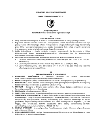 REGULAMIN SKLEPU INTERNETOWEGO WWW.CERAMICZNEOGRODY.PL „Bezpieczny Sklep” Certyfikat wydany przez serwis legalniewsieci.pl 1. 2. 3. 4. 1. 2. 3. 4. 5. 6. 7. 8. 9. §1 POSTANOWIENIA OGÓLNE Sklep www.ceramiczneogrody.pl działa na zasadach określonych w niniejszym Regulaminie. Regulamin określa warunki zawierania i rozwiązywania Umów Sprzedaży Produktu oraz tryb postępowania reklamacyjnego, a także rodzaje i zakres usług świadczonych drogą elektroniczną przez Sklep www.ceramiczneogrody.pl, zasady świadczenia tych usług, warunki zawierania i rozwiązywania umów o świadczenie usług drogą elektroniczną. Każdy Usługobiorca z chwilą podjęcia czynności zmierzających do korzystania z Usług Elektronicznych Sklepu www.ceramiczneogrody.pl, zobowiązany jest do przestrzegania postanowień niniejszego Regulaminu. W sprawach nieuregulowanych w niniejszym Regulaminie mają zastosowanie przepisy: 4.1. Ustawy o świadczeniu usług drogą elektroniczną z dnia 18 lipca 2002 r. (Dz. U. Nr 144, poz. 1204 ze zm.), 4.2. Ustawy o prawach konsumenta z dnia 30 maja 2014 r. (Dz. U. 2014 poz. 827), 4.3. Ustawy Kodeks cywilny z dnia 23 kwietnia 1964 r. (Dz. U. nr 16, poz. 93 ze zm.) oraz inne właściwe przepisy prawa polskiego. §2 DEFINICJE ZAWARTE W REGULAMINIE FORMULARZ ZAMÓWIENIA – formularz dostępny na stronie internetowej www.ceramiczneogrody.pl umożliwiający złożenie Zamówienia. KLIENT – Usługobiorca, który zamierza zawrzeć lub zawarł Umowę Sprzedaży ze Sprzedawcą. KONSUMENT – osoba fizyczna, która dokonuje z przedsiębiorcą czynności prawnej niezwiązanej bezpośrednio z jej działalnością gospodarczą lub zawodową. PRODUKT – dostępna w Sklepie rzecz ruchoma albo usługa, będąca przedmiotem Umowy Sprzedaży między Klientem a Sprzedawcą. REGULAMIN - niniejszy regulamin Sklepu. SKLEP - Sklep internetowy Usługodawcy działający pod adresem www.ceramiczneogrody.pl SPRZEDAWCA, USŁUGODAWCA – Grzegorz Białek wykonujący działalność gospodarczą pod firmą Białek Grzegorz Usługi Transportowe wpisaną do Centralnej Ewidencji i Informacji o Działalności Gospodarczej Rzeczypospolitej Polskiej prowadzonej przez ministra właściwego do spraw gospodarki, miejsce wykonywania działalności oraz adres do doręczeń: ul. Pogodna 12, 46-023 Węgry, NIP: 7541057989, REGON: 160115390, adres poczty elektronicznej (e-mail): [email protected], numer telefonu: +48 728 495 914. UMOWA SPRZEDAŻY – Umowa Sprzedaży Produktu zawarta między Klientem, a Sprzedawcą za pośrednictwem Sklepu. USŁUGA ELEKTRONICZNA – usługa świadczona drogą elektroniczną przez Usługodawcę na rzecz Usługobiorcy za pośrednictwem Sklepu. 10. USŁUGOBIORCA – osoba fizyczna, osoba prawna albo jednostka organizacyjna nieposiadająca osobowości prawnej, której ustawa przyznaje zdolność prawną korzystająca z Usługi Elektronicznej. 11. ZAMÓWIENIE - oświadczenie woli Klienta stanowiące ofertę zawarcia Umowy Sprzedaży Produktu ze Sprzedawcą. 1. 2. 3. 4. 5. 6. 7. 8. 9. 10. 1. 2. 3. 4. 5. 6. §3 INFORMACJE DOTYCZĄCE PRODUKTÓW ORAZ ICH ZAMAWIANIA Sklep www.ceramiczneogrody.pl prowadzi sprzedaż detaliczną Produktów, za pośrednictwem sieci Internet na terenie Polski. Produkty oferowane w Sklepie są nowe, wolne od wad fizycznych i prawnych i zostały legalnie wprowadzone na rynek polski. Informacje znajdujące się na stronach internetowych Sklepu nie stanowią oferty w rozumieniu przepisów prawa. Klient składając Zamówienie, składa ofertę kupna określonego Produktu na warunkach podanych w jego opisie. Cena Produktu uwidoczniona na stronie internetowej Sklepu podana jest w złotych polskich (PLN) i zawiera wszystkie składniki, w tym podatek VAT. Cena nie zawiera kosztów dostawy. Cena Produktu uwidoczniona na stronie Sklepu jest wiążąca w chwili złożenia przez Klienta Zamówienia. Cena ta nie ulegnie zmianie niezależnie od zmian cen w Sklepie, które mogą się pojawić w odniesieniu do poszczególnych Produktów po złożeniu przez Klienta Zamówienia. Zamówienia można składać poprzez witrynę internetową za pomocą Formularza Zamówień (Sklep www.ceramiczneogrody.pl) – 24 godziny na dobę przez cały rok. W celu złożenia Zamówienia, Klient nie ma obowiązku rejestracji Konta w Sklepie. Warunkiem złożenia Zamówienia w Sklepie przez Klienta jest zapoznanie się z Regulaminem i akceptacja jego postanowień w czasie składania Zamówienia. Sklep realizuje Zamówienia złożone od poniedziałku do piątku w godzinach pracy Sklepu tj. od 8 do 16 w dni robocze. Zamówienia złożone w dni robocze po godz. 16, w soboty, niedziele oraz święta, będą rozpatrywane następnego dnia roboczego. Produkty w promocji (wyprzedaży) posiadają limitowaną liczbę sztuk i Zamówienia na nie będą realizowane według kolejności ich wpływania aż do wyczerpania się zapasów danego Produktu. §4 ZAWARCIE UMOWY SPRZEDAŻY Do zawarcia Umowy Sprzedaży, niezbędne jest wcześniejsze złożenie przez Klienta Zamówienia udostępnionymi przez Sprzedawcę sposobami, zgodnie § 3 pkt 6 oraz 8. Po złożeniu Zamówienia Sprzedawca niezwłocznie potwierdza jego otrzymanie. Potwierdzenie przyjęcia Zamówienia do realizacji, powoduje związanie Klienta jego Zamówieniem. Potwierdzenie otrzymania oraz przyjęcie Zamówienia do realizacji następuje poprzez przesłanie wiadomości e-mail. Potwierdzenie przyjęcia Zamówienia do realizacji zawiera: 4.1. potwierdzenie wszystkich istotnych elementów Zamówienia, 4.2. formularz odstąpienia od umowy, 4.3. niniejszy Regulamin zawierający pouczenie o prawie do odstąpienia od umowy. Z chwilą otrzymania przez Klienta wiadomości e-mail, o której mowa w pkt 4 zostaje zawarta Umowa Sprzedaży między Klientem, a Sprzedawcą. Faktura VAT będzie wystawiana na życzenie Klienta. §5 SPOSOBY PŁATNOŚCI 1. Sprzedawca udostępnia następujące sposoby płatności: 1.1. płatność przelewem tradycyjnym na rachunek bankow