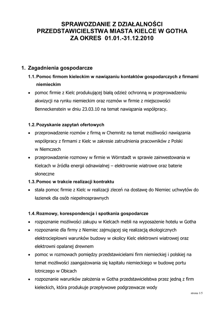 SPRAWOZDANIE Z DZIAŁALNOŚCI PRZEDSTAWICIELSTWA MIASTA KIELCE W GOTHA ZA OKRES 01.01.-31.12.2010 1. Zagadnienia gospodarcze 1.1. Pomoc firmom kieleckim w nawiązaniu kontaktów gospodarczych z firmami niemieckim • pomoc firmie z Kielc produkującej białą odzież ochronną w przeprowadzeniu akwizycji na rynku niemieckim oraz rozmów w firmie z miejscowości Benneckenstein w dniu 23.03.10 na temat nawiązania współpracy. 1.2. Pozyskanie zapytań ofertowych • przeprowadzenie rozmów z firmą w Chemnitz na temat możliwości nawiązania współpracy z firmami z Kielc w zakresie zatrudnienia pracowników z Polski w Niemczech • przeprowadzenie rozmowy w firmie w Wörrstadt w sprawie zainwestowania w Kielcach w źródła energii odnawialnej – elektrownie wiatrowe oraz baterie słoneczne 1.3. Pomoc w trakcie realizacji kontraktu • stała pomoc firmie z Kielc w realizacji zleceń na dostawę do Niemiec uchwytów do łazienek dla osób niepełnosprawnych 1.4. Rozmowy, korespondencja i spotkania gospodarcze • rozpoznanie możliwości zakupu w Kielcach mebli na wyposażenie hotelu w Gotha • rozpoznanie dla firmy z Niemiec zajmującej się realizacją ekologicznych elektrociepłowni warunków budowy w okolicy Kielc elektrowni wiatrowej oraz elektrowni opalanej drewnem • pomoc w rozmowach pomiędzy przedstawicielami firm niemieckiej i polskiej na temat możliwości zaangażowania się kapitału niemieckiego w budowę portu lotniczego w Obicach • rozpoznanie warunków założenia w Gotha przedstawicielstwa przez jedną z firm kieleckich, która produkuje przepływowe podgrzewacze wody strona 1/5 2. Imprezy i spotkania kulturalne, sportowe i edukacyjne 2.1. Uczestniczenie w imprezach i spotkaniach kulturalnych • udział w spotkaniu noworocznym w dniu 6.01.2010 w Gotha - rozmowy z przedstawicielami partii politycznych organizacji samorządowych i szkół • wzięcie udziału w otwarciu wystawy poświęconej zbiorom porcelany w muzeum Schloss Friedenstein i przeprowadzenie rozmów na temat nawiązania współpracy z Muzeum Narodowym w Kielcach • wzięcie udziału w spotkaniu z Egonem Bahr’em w dniu 04.06.2010, byłym ministrem w rządzie Willi Bradt’a ds. kontaktów z krajami Europy Wschodniej i przeprowadzenie z nim krótkiej rozmowy na temat Kielc i mojej funkcji w Gotha, rozmowy z przedstawicielami partii SPD w Thuryndze • wzięcie udziału w uroczystości upamiętniającej 300 rocznicę urodzin księżnej Luisy Dorothea, postaci która wniosła bardzo duży wkład w kulturalny rozwój miasta Gotha – spotkania i rozmowy z przedstawicielami zarządu miasta • wzięcie udziału w spotkaniu organizacji FDP w Turyndze z ambasadorem Kanady Panem Peterem M. Boehm – spotkania i rozmowy z różnymi uczestnikami spotkania na temat działalności Biura Przedstawicielstwa w Gotha. • wzięcie udziału w dniu 28.10.2010 w zebraniu oddziału partii FDP w Gotha i poinformowanie zebranych o rozwoju gospodarczym Kielc oraz sytuacji przedwyborczej w naszym mieście • uczestniczenie w uroczystym spotkaniu z okazji Święta Narodowego Niemiec w dniu 07.10.2010 zorganizowanym przez Konsula Honorowego Niemiec w Kielcach – przeprowadzenie rozmów z Konsulem Generalnym Niemiec w Krakowie na temat możliwości dofinansowania przyjazdu Filharmonii z Gotha do Kielc 2.2. Współorganizowanie imprez kulturalnych i sportowych • przeprowadzenie rozmów na temat przyjazdu do Kielc przedstawicieli Ministerstwa Spraw Zagranicznych Niemiec na uroczystości Święta Jedności Niemiec • prowadzenie uzgodnień z organizatorami imprezy Dni Turyngii, która ma się odbyć w Gotha w lipcu 2011, w celu przygotowania najlepszej oferty artystycznej naszego miasta na tę imprezę • rozmowy z Kieleckim Teatrem Tańca na temat jego udziały w Dniach Turyńskich w Gotha strona 2/5 • pomoc organizatorowi Festiwalu Muzycznego im. Krystyny Jamroz w Busku Zdroju w nawiązaniu kontaktu z Filharmonią z Gotha w związku z planowanym zaproszeniem jej do uczestnictwa w roku 2012 w tej imprezie - wymiana korespondencji, dokonywanie uzgodnień • prowadzenie uzgodnień warunków koncertu Artura Jaronia w Gotha w roku 2012 • spotkanie z prezesem klubu piłki siatkowej z Gotha p. Barthem w celu omówienia możliwości nawiązania współpracy z naszym klubem Fart - pośredniczenie w uzgodnieniach związanych z planowanym wyjazdem do Gotha drużyny siatkarzy Klubu Trakt z Kielc 3. Współpraca szkół i organizacji młodzieżowych • przygotowanie i obsługa delegacji z firmy niemieckiej zarządzającej domami opieki seniorów, która przyjechała do Kielc w celu zapoznania się z systemem opieki nad ludźmi starszymi w naszym mieście, szkoleniem studentów na Uniwersytecie J. Kochanowskiego oraz przeprowadzenie uzgodnień na temat możliwości odbywania praktyk studenckich w placówkach należących do tej firmy. • pomoc Uniwersytetowi J. Kochanowskiego w przeprowadzeniu rozmów i negocjowanie warunków odbywania praktyk zawodowych przez studentów tej uczelni w Niemczech - przygotowanie dokumentów niezbędnych do zalegalizowania w Niemczech praktyk, tłumaczenia dokumentów, przeprowadzenie uzgodnień, zredagowanie umów pomiędzy firmą niemiecką a Uniwersytetem oraz firmą niemiecką a studentem. • przygotowanie i obsługa delegacji z firmy niemieckiej, która przyjechała do Kielc w celu podpisania umowy z Uniwersytetem o realizowaniu praktyk zawodowych dla studentów Wydziału Nauk o Zdrowiu • prowadzenie wymiany korespondencji oraz dokonywanie uzgodnień w związku z rozpoczęcia praktyk przez studentów Uniwersytetu j. Kochanowskiego w Niemczech • współorganizowanie projektu „Zjednoczeni przez trudną historię” - przygotowanie pisma zapraszającego młodzież z Gotha do wzięcia udziału w projekcie, prowadzenie wymiany korespondencji i dokonywanie uzgodnień ze szkołą z Gotha jak również uczestniczenie w samej realizacji przedsięwzięcia i opieka nad młodzieżą z Niemiec s