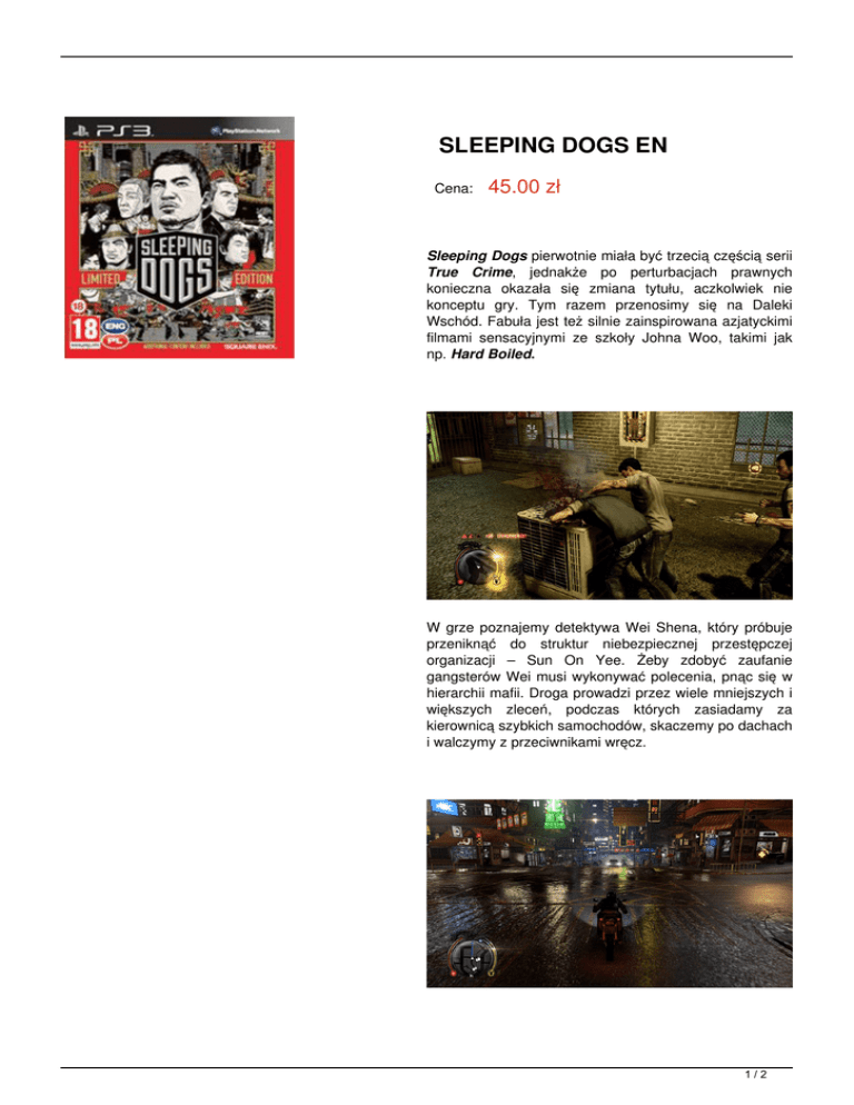 SLEEPING DOGS EN Cena: 45.00 zł Sleeping Dogs pierwotnie miała być trzecią częścią serii True Crime, jednakże po perturbacjach prawnych konieczna okazała się zmiana tytułu, aczkolwiek nie konceptu gry. Tym razem przenosimy się na Daleki Wschód. Fabuła jest też silnie zainspirowana azjatyckimi filmami sensacyjnymi ze szkoły Johna Woo, takimi jak np. Hard Boiled. W grze poznajemy detektywa Wei Shena, który próbuje przeniknąć do struktur niebezpiecznej przestępczej organizacji – Sun On Yee. Żeby zdobyć zaufanie gangsterów Wei musi wykonywać polecenia, pnąc się w hierarchii mafii. Droga prowadzi przez wiele mniejszych i większych zleceń, podczas których zasiadamy za kierownicą szybkich samochodów, skaczemy po dachach i walczymy z przeciwnikami wręcz. 1/2 Wymienione wyżej elementy są główną treścią Sleeping Dogs. Bohater szybko uczy się sztuk walki, korzystania z najróżniejszych broni i wielu innych technik siania destrukcji. Miejscem akcji jest wspominany Hongkong, podzielony na kilka zróżnicowanych dzielnic (od tonącej w przepychu Central HK, aż po biedną Aberdeen). Oczywiście w mieście pojawia się wiele pobocznych zadań i wyzwań, które urozmaicają zabawę. Zobacz wideo: Szczegóły wersja językowa ANGIELSKA 2/2 Powered by TCPDF (www.tcpdf.org)
