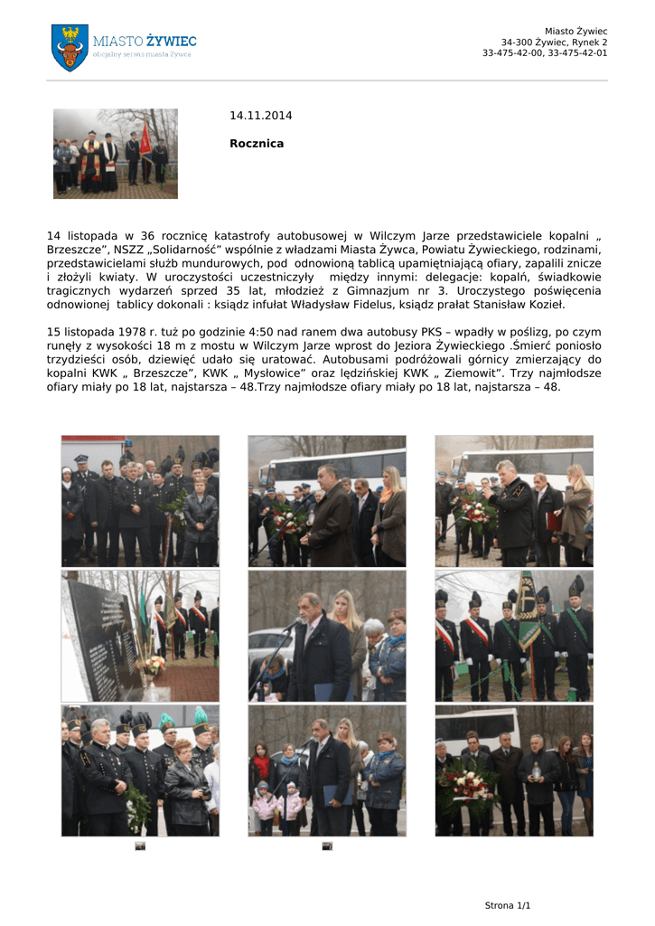 Miasto Żywiec 34-300 Żywiec, Rynek 2 33-475-42-00, 33-475-42-01 14.11.2014 Rocznica 14 listopada w 36 rocznicę katastrofy autobusowej w Wilczym Jarze przedstawiciele kopalni „ Brzeszcze”, NSZZ „Solidarność” wspólnie z władzami Miasta Żywca, Powiatu Żywieckiego, rodzinami, przedstawicielami służb mundurowych, pod odnowioną tablicą upamiętniającą ofiary, zapalili znicze i złożyli kwiaty. W uroczystości uczestniczyły między innymi: delegacje: kopalń, świadkowie tragicznych wydarzeń sprzed 35 lat, młodzież z Gimnazjum nr 3. Uroczystego poświęcenia odnowionej tablicy dokonali : ksiądz infułat Władysław Fidelus, ksiądz prałat Stanisław Kozieł. 15 listopada 1978 r. tuż po godzinie 4:50 nad ranem dwa autobusy PKS – wpadły w poślizg, po czym runęły z wysokości 18 m z mostu w Wilczym Jarze wprost do Jeziora Żywieckiego .Śmierć poniosło trzydzieści osób, dziewięć udało się uratować. Autobusami podróżowali górnicy zmierzający do kopalni KWK „ Brzeszcze”, KWK „ Mysłowice” oraz lędzińskiej KWK „ Ziemowit”. Trzy najmłodsze ofiary miały po 18 lat, najstarsza – 48.Trzy najmłodsze ofiary miały po 18 lat, najstarsza – 48. Strona 1/1 Powered by TCPDF (www.tcpdf.org)