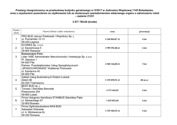 Przetarg nieograniczony na przebudowę budynku garażowego nr 5/3017 w Jednostce Wojskowej 1145 Bolesławiec, wraz z uzyskaniem pozwolenia na użytkowanie lub ze skutecznym zawiadomieniem właściwego organu o zakończeniu robót – zadanie 21231 3 977 700,00 (brutto) Numer oferty 1 2. 3. 4. 5. 6. 7. Nazwa (firma) i adres wykonawcy PRO-BUD Janusz Pawłowski i Wspólnicy Sp. j. ul. Poznańska 12-13 59-220 Legnica ECORES Sp. z o.o. ul. Kaczeńcowa 5 35-604 Rzeszów Konsorcjum Firm: Lider: KMC Administrator Nieruchomości i Inwestycje Sp. z o.o. Pl. Staszica 1 64-920 Piła Partner: Przedsiębiorstwo Usług Specjalistycznych „SPADOCHRONIARZ” Waldemar Piotrowski ul. Kamienna 40 64-920 Piła Zakład Usług Budowlanych Robert Łukasik Zieleń 86 62-240 Trzemeszno BEST-BUD sp. j. Tomasz i Stanisław Bernolak Pisarzowice 204 59-800 Lubań Firma Usługowo-Handlowa STANBUD Stanisław Pięta ul. Głowackiego 67 32-800 Brzesko Firma Ogólnobudowlana MAS-BUD Sebastian Wdowiak ul. A. Mickiewicza 6c 59-330 Ścinawa cena gwarancja 4 160 864,07 zł 6 lat 3 999 591,00 zł 6 lat 4 960 166,08 zł 5 lat 3 155 059,51 zł 48 m-cy 4 373 463,03 6 lat 3 625 851,04 6 lat 3 339 469,35 zł 6 lat 8. 9. 10. 11. 12. 13. 14. 15. 16. Konsorcjum firm: Przedsiębiorstwo Projektowo-Budowlane MACK-INWEST Maciej Kaleta ul. Osobowicka 159/3 51-001 Wrocław Mario-Bud Mariusz Wróbel ul. Roślinna 2/21 54-610 Wrocław Przedsiębiorstwo Budowlane Strykowski Sp. z o.o. Sp. komandytowa Radzimów Dolny 26 59-975 Sulików Control Net Sp. z o.o. ul. Wilkszyńska 60 54-079 Wrocław Przedsiębiorstwo Budowlane INTRABUD Sp. z o.o. ul. Szkolna 2a/10 58-0160 Świebodzice IZERY Bis Sp. z o.o. ul. Al. Wojska Polskiego 1B 59-630 Mirsk Firma Ogólno-Budowlana Marcin Skoczeń ul. Kamienna 29/31 53-307 Wrocław IN-TEL Mirosław Jędra ul. Kościuszki 13 55-140 Żmigród Zakład Remontowo-Budowlany BUDOLEX, Stanisław Oleksy 34-603 Ujanowice 109 Zakład Instalacyjno-Budowlany Stanisław Piekarski ul. Reymonta 6 67-100 Nowa Sól 3 738 000,00 zł 6 lat 3 969 915,38 zł 6 lat 4 120 500,00 zł 6 lat 3 917 527,93 zł 6 lat 4 399 608,38 zł 6 lat 4 566 231,59 zł 6 lat 4 396 123,85 zł 6 lat 4 528 860,00 zł 6 lat 4 258 503,066 zł 6 lat
