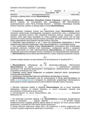 UMOWA Nr …. zawarta w dniu 02 stycznia 2017 r. pomiędzy: firmą …………………………………………… z siedzibą w ………………., …………………….., ………………………. posiadającą NIP ………………………., nr REGON ………………….. reprezentowaną przez ………………………….. - właściciela, zwanego w dalszej treści umowy Zleceniobiorcą, a Gminą Gdańsk - Gdańskim Ośrodkiem Kultury Fizycznej z siedzibą w Gdańsku, 80-314 Gdańsk, Al. Grunwaldzka 244, posiadającym NIP 584-255-98-22, reprezentowanym przez Pana Andrzeja Bociana – Dyrektora Gdańskiego Ośrodka Kultury Fizycznej, zwanym w dalszej części umowy Zleceniodawcą. §1 1. Przedmiotem niniejszej Umowy jest zapewnienie przez Zleceniobiorcę opieki ratownika medycznego posiadającego wymagane uprawnienia wraz z podstawowym sprzętem pierwszej pomocy oraz udzielenie pierwszej pomocy medycznej i opieki osobom, które tego będą wymagały do czasu przejęcia opieki przez inne do tego uprawnione osoby podczas trwania imprezy sportowej, sportowo-rekreacyjnej lub innej, której organizatorem jest Gdański Ośrodek Kultury Fizycznej. 2. Wykonanie usług określonych w ust. 1 winno być każdorazowo potwierdzone w „Karcie ewidencji usług ratownika medycznego”, która stanowi Załącznik nr 1 do niniejszej Umowy. 3. Przy wykonywaniu niniejszej Umowy Zleceniobiorca zobowiązany jest przestrzegać przepisów prawnych, kodeksu etyki zawodowej i postępować zgodnie z zasadami sztuki. Naruszenie ich rodzi odpowiedzialność Zleceniobiorcy za niewykonanie lub nienależyte wykonanie niniejszej Umowy, niezależnie od odpowiedzialności zawodowej. 4. Zleceniobiorca ponosi pełną odpowiedzialność z tytułu realizacji przedmiotu Umowy. §2 Umowa zostaje zawarta na czas określony od 02 stycznia do 31 grudnia 2017 r. §3 1. Zleceniodawca zobowiązuje się do pisemnego-mailowego informowania Zleceniobiorcy na adres: ………………………….. o planowanych imprezach sportowych lub sportowo-rekreacyjnych wymagających zabezpieczenia medycznego w terminie nie krótszym niż 3 dni. 2. Realizacja umowy będzie następować na podstawie odrębnych zleceń, sporządzanych w formie pisemnej-mailowej. 3. Każdorazowo obowiązywać będą ceny jednostkowe obowiązujące w Umowie. 4. Zleceniobiorca zobowiązany jest do potwierdzenia w formie pisemnej-mailowej na adres: [email protected] przyjęcia do wiadomości przesłanego harmonogramu planowanych imprez organizowanych przez Gdański Ośrodek Kultury Fizycznej. §4 1. Zlecenie wykonane będzie w siedzibie Zleceniodawcy lub w innym wcześniej wskazanym miejscu na terenie Gdańska, w innych przypadku zlecenie jest konsultowane indywidualnie przez strony. 2. Koordynatorem od strony Zleceniobiorcy jest ………………………….. (Ratownik Medyczny) Tel. ……………………… §5 1. Za wykonane czynności zgodnie z §1 Zleceniobiorcy przysługuje wynagrodzenie brutto w wysokości ……… zł/godz. (słownie: …………………..i zł 00/100). Usługa świadczona przez niepełną godzinę będzie płatna do każdych 30 minut połowa stawki godzinowej, a powyżej 30 minut pełna stawka godzinowa. 2. Każde zlecenie wykonania usługi które, nie przekroczy 3 godzin zegarowych lub równych 3 godzin zegarowych płatne jest w wysokości ……………… zł brutto (3 godziny zegarowe) 3. Każde nie odwołane zlecenie wykonania usługi (mimo nie odbycia się imprezy) będzie płatne w wysokości ………….. (2 godziny zegarowe). 4. Wynagrodzenie miesięczne stanowić będzie sumę godzin i minut zaewidencjonowanych i zatwierdzonych przez Zleceniodawcę z „Kart ewidencji usług ratownika medycznego” wymienionych w § 1 ust. 3 oraz stawki za 1 godzinę określoną w § 5 ust. 1. 5. Wypłata wynagrodzenia za usługi świadczone przez Zleceniobiorcę będzie dokonywana przez Zleceniodawcę przelewem bankowym raz w miesiącu na konto bankowe nr …………………………………………………… po przedstawieniu przez Zleceniobiorcę rachunku wraz z zestawieniem godzinowym wynikającym z „Kart ewidencji usług ratownika medycznego”. 6. Termin płatności ustala się na 14 dni licząc od dnia dostarczenia do Zleceniodawcy oryginału prawidłowo wystawionej faktury VAT. Dane do faktury VAT: Gminę Miasta Gdańska, ul. Nowe Ogrody 8/12 80-803 Gdańsk NIP 583 00-11-969; jako płatnika i odbiorcę Gdański Ośrodek Kultury Fizycznej. 7. W przypadku nie opłacenia faktury w określonym czasie przez Zleceniodawcę, koordynator ma prawo do odwołania ratownika na kolejne imprezy aż, do uregulowania zaległych płatności. §6 Niepełna realizacja przez Zleceniobiorcę zlecenia/obowiązków zawartych w §1 spowoduje pomniejszenie lub całkowite pozbawienie ustalonego wyżej wynagrodzenia w zależności od stopnia stwierdzonych niedociągnięć. §7 Zleceniobiorca ponosi pełną odpowiedzialność za nie wywiązanie się z powyższej Umowy włącznie z odpowiedzialnością cywilną za nie zapewnienie opieki medycznej. §8 Umowa może zostać rozwiązana w każdym czasie za porozumieniem stron z 30-to dniowym okresem wypowiedzenia, na koniec miesiąca następnego po złożeniu wypowiedzenia w formie pisemnej. §9 Zmiany niniejszej Umowy wymagają formy pisemnej. § 10 Do spraw nieuregulowanych Umową stosuje się przepisy Kodeksu Cywilnego. § 11 1. Spory wynikające ze skutku zawarcia niniejszej Umowy, będą rozstrzygane na drodze mediacji pomiędzy stronami. 2. W przypadku braku ugody strony poddadzą się rozstrzygnięciu sporu przez Sąd właściwy dla Zleceniodawcy. § 12 Niniejsza Umowa nie rodzi żadnych skutków w zakresie uprawnień pracowniczych wynikających ze stosunku pracy. § 13 Umowę sporządzono w dwóch jednobrzmiących egzemplarzach po jednym dla każdej ze stron. ZLECENIOBIORCA: ZLECENIODAWCA: KARTA EWIDENCJI USŁUG RATOWNIKA MEDYCZNEGO nr /2017 NAZWA FIRMY ADRES SIEDZIBY Rodzaj impr