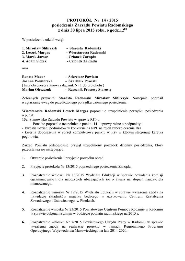 PROTOKÓŁ Nr 14 / 2015 posiedzenia Zarządu Powiatu Radomskiego z dnia 30 lipca 2015 roku, o godz.1200 W posiedzeniu udział wzięli: 1. Mirosław Ślifirczyk 2. Leszek Margas 3. Marek Jarosz 4. Adam Siczek - Starosta Radomski - Wicestarosta Radomski - Członek Zarządu - Członek Zarządu oraz Renata Mazur - Sekretarz Powiatu Joanna Wontorska - Skarbnik Powiatu ( lista obecności stanowi załącznik Nr 1 do protokołu ) Marian Oleszczuk - Rzecznik Prasowy Starosty Zebranych przywitał Starosta Radomski Mirosław Ślifirczyk. Następnie poprosił o zgłaszanie uwag do przedłożonego porządku dziennego posiedzenia. Wicestarosta Radomski Leszek Margas poprosił o uzupełnienie porządku posiedzenia o punkt: 13a. Stanowisko Zarządu Powiatu w sprawie RIT-u. Ponadto poprosił o uzupełnienie punktu 14 – sprawy różne o podpunkty: - kwestia udziału podmiotów w konkursie na NPL na rejon zabezpieczenia Iłża - kwestia doposażenia w sprzęt komputerowy punktu w Iłży w którym stacjonuje karetka pogotowia. Zarząd Powiatu jednogłośnie przyjął uzupełniony porządek dzienny posiedzenia, który przedstawia się następująco: 1. Otwarcie posiedzenia i przyjęcie porządku obrad. 2. Przyjęcie protokołu Nr 13/2015 poprzedniego posiedzenia Zarządu. 3. Rozpatrzenie wniosku Nr 18/2015 Wydziału Edukacji w sprawie powołania komisji egzaminacyjnych dla nauczycieli ubiegających się o awans na stopień nauczyciela mianowanego. 4. Rozpatrzenie wniosku Nr 19/2015 Wydziału Edukacji w sprawie wyrażenia zgody na likwidację składników majątku będącego w użytkowaniu Centrum Kształcenia Zawodowego i Ustawicznego w Pionkach. 5. Rozpatrzenie wniosku Nr 23/2015 Powiatowego Centrum Pomocy Rodzinie w Radomiu w sprawie dokonania zmian w budżecie powiatu radomskiego na 2015 r. 6. Rozpatrzenie wniosku Nr 7/2015 Powiatowego Urzędu Pracy w Radomiu w sprawie wyrażenia zgody na realizację projektu w ramach Regionalnego Programu Operacyjnego Województwa Mazowieckiego na lata 2014-2020. 7. Rozpatrzenie wniosku Nr 8/2015 Powiatowego Urzędu Pracy w Radomiu w sprawie zatwierdzenia projektu „Aktywizacja osób powyżej 30 roku życia pozostających bez pracy w powiecie radomskim i m. Radom (II)” realizowanego w ramach Regionalnego Programu Operacyjnego Województwa Mazowieckiego na lata 2014 – 2020. 8. Rozpatrzenie wniosku Nr 13/2015 Wydziału Zdrowia i Spraw Społecznych w sprawie przeniesienia wydatków pomiędzy rozdziałami i paragrafami w dziale 851 w kwocie 16.581 zł. z przeznaczeniem na dofinansowanie kosztów realizacji badań profilaktycznych w wybranej grupie wiekowej mieszkańców powiatu radomskiego wykonywanych przez SPZZOZ-Szpital w Iłży oraz zwiększenia wydatków w budżecie powiatu na rok 2015 w dziale 851 o kwotę 6.278 zł. na dofinansowanie kosztów realizacji badań profilaktycznych w wybranej grupie wiekowej mieszkańców powiatu radomskiego wykonywanych przez SPZZOZ w Pionkach - 3.060,00 zł. i SPZZOZSzpital w Iłży - 3.218 zł. 9. Rozpatrzenie wniosku Nr 14/2015 Wydziału Zdrowia i Spraw Społecznych w sprawie zwiększenia wydatków w budżecie powiatu na rok 2015 w dziale 851 o kwotę 6.630 zł z przeznaczeniem na zakup wózka oddziałowego do dystrybucji leków wraz z wyposażeniem dla Działu Wewnętrznego - SPZZOZ- Szpitala w Iłży. 10. Rozpatrzenie wniosku Nr 15/2015 Wydziału Zdrowia i Spraw Społecznych w sprawie zwiększenia wydatków w budżecie powiatu na rok 2015 w dziale 851 o kwotę 1.768 zł. z przeznaczeniem na sfinansowanie koncertu zespołu SCENA ARS MARKETING S.C., który wystąpi podczas konkursu na temat szkodliwości uzależnień oraz promowania zdrowego stylu życia zorganizowanego w Publicznym Gimnazjum Gminnym w Iłży. 11. Rozpatrzenie wniosku Nr 3/2015 Wydziału Rolnictwa, Leśnictwa, Ochrony Środowiska i Gospodarki Wodnej w sprawie raportu z wykonania z programu ochrony środowiska dla gminy Gózd obejmujący lata 2012-2013. 12. Rozpatrzenie wniosku Nr 19/2015 Wydziału Promocji i Rozwoju Powiatu w sprawie opinii wniosku o wydanie decyzji o zezwoleniu na realizację inwestycji drogowej pn.: „budowa ulicy Młynarskiej w Skaryszewie”. 13. Podjęcie uchwały Zarządu Powiatu w sprawie zmian w planie dochodów i wydatków budżetu powiatu na 2015 rok i zmian w planie finansowym zadań z zakresu administracji rządowej. 13a. Stanowisko Zarządu Powiatu w sprawie RIT-u. 14. Sprawy różne: - odpowiedź Dyrektora PUP w Radomiu na zalecenia pokontrolne zawarte w piśmie z dnia 3.07.2015r., znak: SK.1711.5.2015. - zawiadomienie Dyrektora PUP w Radomiu w sprawie nieodpłatnego użyczenia na okres jednego roku lokalu znajdującego się w budynku Filii PUP w Pionkach dla potrzeb Gminnego Centrum Informacji. - kwestia udziału podmiotów w konkursie na NPL na rejon zabezpieczenia Iłża -kwestia doposażenia w sprzęt komputerowy punktu w Iłży w którym stacjonuje karetka pogotowia. 2 Przystąpiono do realizacji 2 pktu porządku dziennego posiedzenia – przyjęcie protokołu Nr 13/2015 poprzedniego posiedzenia Zarządu. Protokół Nr 14/2015 poprzedniego posiedzenia Zarządu zostały przyjęty jednogłośnie, bez uwag. Przystąpiono do realizacji 3 pktu porządku dziennego posiedzenia – rozpatrzenie wniosku Nr 18/2015 Wydziału Edukacji w sprawie powołania komisji egzaminacyjnych dla nauczycieli ubiegających się o awans na stopień nauczyciela mianowanego. Wicestarosta Radomski Leszek Margas poinformował, że warunkiem nadania nauczycielowi kolejnego stopnia awansu zawodowego jest odbycie stażu, zakończonego pozytywną oceną dorobku zawodowego, a w przypadku nauczyciela kontraktowego zdanie egzaminu przed komisją egzaminacyjną. Komisje egzaminacyjne dla nauczycieli ubiegających się o awans na stopień nauczyciela mianowanego powołuje Zarząd Powiatu. W skład komisji wchodzą: przedstawiciel organu prowadzącego, jako jej przewodniczący, przedstawiciel organu sprawującego nadzór pedagogiczny, dyrektor szkoły, dwaj eksperci