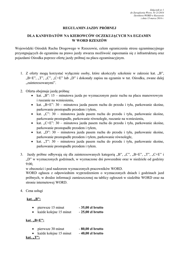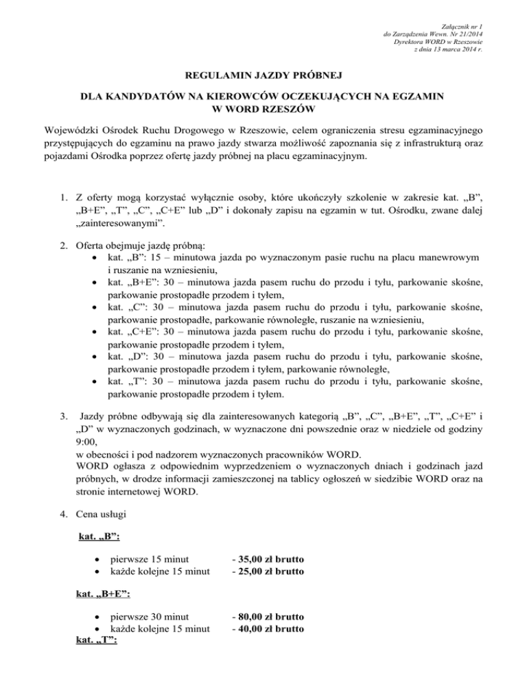 Załącznik nr 1 do Zarządzenia Wewn. Nr 21/2014 Dyrektora WORD w Rzeszowie z dnia 13 marca 2014 r. REGULAMIN JAZDY PRÓBNEJ DLA KANDYDATÓW NA KIEROWCÓW OCZEKUJĄCYCH NA EGZAMIN W WORD RZESZÓW Wojewódzki Ośrodek Ruchu Drogowego w Rzeszowie, celem ograniczenia stresu egzaminacyjnego przystępujących do egzaminu na prawo jazdy stwarza możliwość zapoznania się z infrastrukturą oraz pojazdami Ośrodka poprzez ofertę jazdy próbnej na placu egzaminacyjnym. 1. Z oferty mogą korzystać wyłącznie osoby, które ukończyły szkolenie w zakresie kat. „B”, „B+E”, „T”, „C”, „C+E” lub „D” i dokonały zapisu na egzamin w tut. Ośrodku, zwane dalej „zainteresowanymi”. 2. Oferta obejmuje jazdę próbną: kat. „B”: 15 – minutowa jazda po wyznaczonym pasie ruchu na placu manewrowym i ruszanie na wzniesieniu, kat. „B+E”: 30 – minutowa jazda pasem ruchu do przodu i tyłu, parkowanie skośne, parkowanie prostopadłe przodem i tyłem, kat. „C”: 30 – minutowa jazda pasem ruchu do przodu i tyłu, parkowanie skośne, parkowanie prostopadłe, parkowanie równoległe, ruszanie na wzniesieniu, kat. „C+E”: 30 – minutowa jazda pasem ruchu do przodu i tyłu, parkowanie skośne, parkowanie prostopadłe przodem i tyłem, kat. „D”: 30 – minutowa jazda pasem ruchu do przodu i tyłu, parkowanie skośne, parkowanie prostopadłe przodem i tyłem, parkowanie równoległe, kat. „T”: 30 – minutowa jazda pasem ruchu do przodu i tyłu, parkowanie skośne, parkowanie prostopadłe przodem i tyłem. 3. Jazdy próbne odbywają się dla zainteresowanych kategorią „B”, „C”, „B+E”, „T”, „C+E” i „D” w wyznaczonych godzinach, w wyznaczone dni powszednie oraz w niedziele od godziny 9:00, w obecności i pod nadzorem wyznaczonych pracowników WORD. WORD ogłasza z odpowiednim wyprzedzeniem o wyznaczonych dniach i godzinach jazd próbnych, w drodze informacji zamieszczonej na tablicy ogłoszeń w siedzibie WORD oraz na stronie internetowej WORD. 4. Cena usługi kat. „B”: pierwsze 15 minut każde kolejne 15 minut - 35,00 zł brutto - 25,00 zł brutto kat. „B+E”: pierwsze 30 minut każde kolejne 15 minut kat. „T”: - 80,00 zł brutto - 40,00 zł brutto pierwsze 30 minut każde kolejne 15 minut - 70,00 zł brutto - 35,00 zł brutto kat. „C” : pierwsze 30 minut każde kolejne 15 minut - 85,00 zł brutto - 35,00 zł brutto kat. „C+E” : pierwsze 30 minut każde kolejne 15 minut - 100,00 zł brutto - 50,00 zł brutto kat. „D” : pierwsze 30 minut każde kolejne 15 minut - 100,00 zł brutto - 50,00 zł brutto 5. Opłata za jazdę próbną winna być wpłacona na konto WORD w Rzeszowie z dopiskiem „JP”. 6. Pojazdy udostępniane będą zainteresowanym w terminie zgodnym z wcześniejszym zapisem. 7. Zapisy na jazdę próbną prowadzi Dział Promocji, Szkoleń, BRD i Audytu Wewnętrznego tut. Ośrodka, sporządzając listę osób zakwalifikowanych na dany dzień i godzinę, którą przekazuje do Działu Administracyjno-Technicznego. 8. Warunkiem przyjęcia zgłoszenia zainteresowanego jest: - okazanie zaświadczenia o wyznaczonym terminie egzaminu, - doręczenie oryginału wpłaty za jazdę próbną, - podpisanie oświadczenia o zapoznaniu się z regulaminem jazdy próbnej, - okazanie dokumentu tożsamości. 9. Pracownik WORD, udostępnia zainteresowanemu plac manewrowy i pojazd w wyznaczonym terminie, po okazaniu przez niego dokumentu potwierdzającego tożsamość (dowód osobisty lub paszport). 10. Zainteresowany zobowiązany jest użytkować pojazd z zachowaniem zasad prawidłowej eksploatacji i stosować się do poleceń odpowiedzialnych pracowników WORD. 11. Dopuszcza się, towarzyszenie zainteresowanemu w trakcie jazdy próbnej jednej osoby. 12. Zmiany terminu lub rezygnacji z jazdy próbnej można dokonać najpóźniej do 2 dni przed wyznaczonym terminem. 13. W przypadku nie zgłoszenia się w wyznaczonym terminie opłata nie podlega zwrotowi. 14. W sprawach nie uregulowanych niniejszym Regulaminem mają zastosowanie przepisy kodeku cywilnego.