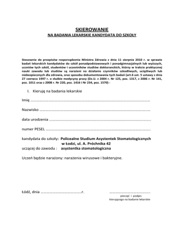 SKIEROWANIE NA BADANIA LEKARSKIE KANDYDATA DO SZKOŁY Stosownie do przepisów rozporządzenia Ministra Zdrowia z dnia 11 sierpnia 2010 r. w sprawie badań lekarskich kandydatów do szkół ponadpodstawowych i ponadgimnazjalnych lub wyższych, uczniów tych szkół, studentów i uczestników studiów doktoranckich, którzy w trakcie praktycznej nauki zawodu lub studiów są narażeni na działanie czynników szkodliwych, uciążliwych lub niebezpiecznych dla zdrowia, oraz sposobu dokumentowania tych badań (art.6 ust. 5 ustawy z dnia 27 czerwca 1997 r. o służbie medycyny pracy (Dz.U. z 2004 r. Nr 125, poz. 1317, z 2006 r. Nr 141, poz. 1011 oraz z 2008 r. Nr 220, poz. 1416 i Nr 234, poz. 1570) - I. Kieruję na badania lekarskie Imię ………………………………………………………………………………………………………… Nazwisko ………………………………………………………………………………………….…..… data urodzenia ………………………………………………………………………………….…….. numer PESEL …………………………………………………………………………………….…….. kandydata do szkoły: Policealne Studium Asystentek Stomatologicznych w Łodzi, ul. A. Próchnika 42 uczącej do zawodu : asystentka stomatologiczna Uczeń będzie narażony: narażenia wirusowe i bakteryjne. Łódź, dnia …………………………………..r. ………………………………….. pieczęć i podpis kierującego na badanie lekarskie