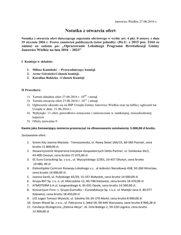 Janowice Wielkie 27.06.2016 r. Notatka z otwarcia ofert Notatka z otwarcia ofert dotyczącego zapytania ofertowego w trybie art. 4 pkt. 8 ustawy z dnia 29 stycznia 2004 r. Prawo zamówień publicznych (tekst jednolity: ( Dz.U. z 2015 poz. 2164 ze zmian) na zadanie pn: „Opracowanie Lokalnego Programu Rewitalizacji Gminy Janowice Wielkie na lata 2016 – 2023” I Komisja w składzie: 1. Miłosz Kamiński – Przewodniczący komisji 2. Artur Górnicki-Członek komisji. 3. Karolina Rokicka –Członek Komisji II Procedura: 1) Termin składnia ofert 27.06 2016 r .1000 i minął. 2) Termin otwarcia ofert 27.06 2016 r .1015 i minął. 3) Ogłoszenie ukazało się na BIP Urzędu Gminy Janowice Wielkie oraz na tablicy ogłoszeń tut. Urzędu w dniu 21.06.2016 r. 4) Wpłynęło: 11 ofert, prawidłowo oznaczone i umieszczone w zamkniętej, nieuszkodzonej kopercie 5) Oferty nieważne 0 Kwota jaka Zamawiający zamierza przeznaczyd na sfinansowanie zamówienia: 5.000,00 zł brutto. Zestawienie ofert: 1. Green Kay Joanna Masiota - Tomaszewska, ul. Nowy Świat 10A/15, 60-583 Poznao, cena brutto 11 800,00 zł. 2. Stowarzyszenie Wspierania Inicjatyw Gospodarczych Delta Partner, ul. Zamkowa 3A/1, 43-400 Cieszyn, cena brutto 27 675,00 zł. 3. EC Euro Consulting Sp. z o.o., ul. Wyszyoskiego 1/201, 10-457 Olsztyn, cena brutto 19 680, 00 zł. 4. Dolnośląskie Centrum Rozwoju Lokalnego s.c, ul Jedności Narodowej 45B, 50-260 Wrocław, cena brutto 14 000,00 zł. 5. Joanna Sanik, ul. Pułaskiego 65/29, 15-337 Białystok, cena brutto 14 000,00 zł. 6. Grupa BST Sp. z o. o. ul. Mieczyków 12, 40-748 Katowice, cena brutto 18 470,00 zł. 7. ATMOTERM S.A ul. Łangowskiego 4, 45-031 Opole, cena brutto 14 500,00 zł. 8. Konsorcjum Firm: 1. Grupa Gumułka – Euroedukacja Sp. z o.o. ul. Matejki Jana 4, 40-077 Katowice, cena brutto 18 450,00 zł. 9. LCE Logos Tomasz Wysocki, ul. Szkolna 59, 05-270 Marki, cena brutto 8 900,00 zł. 10. Green Wood Sp. z o.o., ul. Fabryczna 2, lokal 59, 00-446 Warszawa, cena brutto 8 900,28 zł. 11. Fundacja Ekologiczna „Zielona Akcja”, Al. Orła Białego 2, 59-220 Legnica, cena brutto 12 900,00 zł.