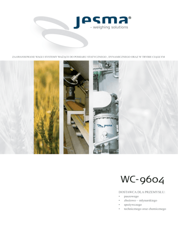 zaawansowane wagi i systemy ważące do pomiaru statycznego , dynamicznego oraz w trybie ciągłym WC-9604 Dostawca dla przemysłu: • paszowego • zbożowo – młynarskiego • spożywczego • technicznego oraz chemicznego Jesma Weightcontrol 9604 Jesma Weightcontrol 9604 to zaawansowany, komputerowy układ sterujący dla wag automatycznych. WC9604 jest przystosowany do procesów wykorzystujących zasilacze przenośnikowe z wbudowaną wagą i systemów automatycznych. WC9604 kontroluje procesy ważenia i dozowania produktów sproszkowanych i kruchych oraz dozowanie płynów. Na bazie wieloletniego doświadczenia w projektowaniu rozwiązań dla przemysłowych procesów technologicznych, WC9604 spełnia współczesne wymogi dotyczące prędkości, niezawodności i precyzji. Najwyższej klasy elektronika w połączeniu z zaawansowaną techniką pomiarową, konwersją danych i silnym mikroprocesorem oferują użytkownikowi zaawansowaną technikę, która zapewnia znakomite działanie przy procesach charakteryzujących się dużą prędkością. Układ WC9604 pracuje w systemach ważących i dozujących w wielu zakresach funkcjonalnych obsługiwanych przez firmę Jesma, a także w wielu nowo opracowywanych procesach automatycznych wymagających niewielkiej interwencji operatora i łatwości obsługi. Sterownik posiada przyjazny dla użytkownika interfejs z wyświetlanymi opisami i przyciskami funkcyjnymi zgodnymi z międzynarodowymi standardami EC. Sprawdzone oprogramowanie oparte na mocnej bazie technicznej i doświadczeniu z wielu implementacji na całym świecie gwarantuje niezawodną kontrolę procesu ważenia. WC9604 posiada elastyczną funkcjonalność odpowiednią do prostych i bardziej skomplikowanych zadań. Funkcje i właściwości • • • • • • • • • • • • • • • • Panel przycisków i procesor są rozdzielone, aby umożliwić oddzielny montaż np. w sterowni, i są połączone kablem światłowodowym Wyświetlacz/panel przycisków z numerycznym 6-cyfrowym wyświetlaniem, wys. 15 mm, 2 linie x 24 znakowy wyświetlacz alfanumeryczny i panel z 16 przyciskami. Automatyczna korekta pooperacyjna przy ważeniu porcji. Automatyczny reset, opcjonalnie. 9 opcjonalnych wersji językowych opisów tekstowych. Pamięć danych typu EE Prom. Certyfikat wg OIML R50. Specjalne oprogramowanie dla jednostek LIW, podajników i wag udarowych. Oprogramowanie uśredniające i linearyzujące dla wag dynamicznych. Kody dostępu do zmiany technicznie zmiennych parametrów. Funkcja drukowania potwierdzeń ważenia i przepływu oraz danych sumatora. Regulacja nastaw, stałego przepływu z regulacją podajnika. Regulacja proporcjonalna - dodatków - sproszkowanych lub ciekłych - regulowana przez WC9604 proporcjonalnie do przepływu innego materiału. Regulacja odwrotnie proporcjonalna - WC9604 reguluje przepływ materiału proporcjonalnie do przepływu innego materiału. Regulacja master-slave – przepływ materiału technologicznego, który nie może być regulowany jest przepływem nadrzędnym (master), wg którego regulowany jest produkt podrzędny (slave) w odpowiednich proporcjach. Proporcje mieszania można ustawić jako produkt końcowy = 100% lub produkt główny =100 % + procentowa wartość dodatku. reliable accuracy Specyfikacja techniczna: Zasilanie: 24 lub 230 VAC, 47-110 Hz Zużycie energii: maks. 30VA Wejście cyfrowe: połączenie przez wyłącznik bezpotencjałowy Obciążenie wyłącznika: 24VDC/10 mA Wyjścia przekaźnika: Bezpotencjałowe wcięcie maks. 48VAC 2A Okres użytkowy: Min. 500.000 operacji przy maks. obciążeniu Wej/wyj analogowe: Galwanicznie rozdzielone 0/4-20 mA (maks. błąd 0,05%) Komunikacja szeregowa: RS422/485 galwanicznie rozdzielone 2- lub 4 –gwintowe złącze. Zakres temperatur: Praca –10 - +40°C / Przechowywanie –40 - +70°C Stopień ochrony: Główny moduł IP20 Przód klawiatury IP65 Zakres ważenia: 1-999 kg/h – t/h – kt/h Podziałka licznika ilości: 0.01-0.1-1-10-100 g/kg/t Podziałka sumatora: 10-100-1000 x licznik ilości Podłączenie CPU i wyświetlacza: Ustawienie parametrów: Poprzez 2 kable optyczne (maks. 30 m). Opcja do 1000 m. Parametry są wprowadzane z klawiatury lub poprzez port szeregowy. Waga przepływowa Waga pasowa Dozownik wagowy Zasilacz ciężarowy WEJŚCIE Ogniwo(a) obciążnikowe • • • • Tacho ο • • • 2 2 2 2 ο ο • • 2 2 2 2 ο ο ο ο • • • • ο ο ο ο • • • • RS422/RS485 ο ο ο ο Profibus DP ο ο ο ο Cyfrowe (programowalne) 1 analogowe do nastawy (4-20mA/0-20mA) Wyjścia Cyfrowe (programowalne) 2 dodatkowe cyfrowe (programowalne) 1 analogowe do natężenia przepływu (4-20mA/0-20mA) 1 analogowe do regulacji (4-20mA/0-20mA) “Watchdog” KOMUNIKACJA • Standard ο Opcja www.jesma.com jesma Jesma GmbH JESMA SP. Z O.O. Helsingørvej 18 Alter Kirchenweg 83 ul. Przemysłowa 48b DK-7100 Vejle D-24983 Handewitt PL-Piła 64-920 Tel.: +45 75 72 11 00 Tel. +45 22 28 54 54 Tel. +48 667 280 900 Fax: +45 75 75 12 22 Fax +45 75 72 12 22 Fax +48 672 153 458 Mail:[email protected] Mail:[email protected] Mail:[email protected] www.jesma.dk www.jesma.com www.jesma.com