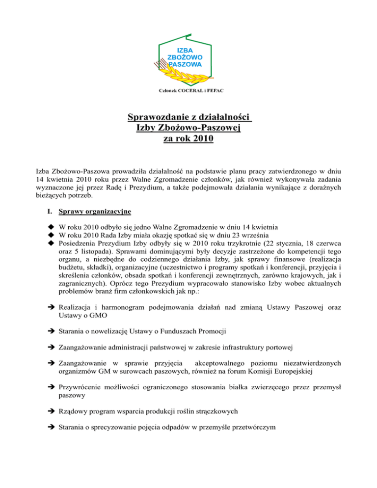 Sprawozdanie z działalności Izby Zbożowo-Paszowej za rok 2010 Izba Zbożowo-Paszowa prowadziła działalność na podstawie planu pracy zatwierdzonego w dniu 14 kwietnia 2010 roku przez Walne Zgromadzenie członków, jak również wykonywała zadania wyznaczone jej przez Radę i Prezydium, a także podejmowała działania wynikające z doraźnych bieżących potrzeb. I. Sprawy organizacyjne W roku 2010 odbyło się jedno Walne Zgromadzenie w dniu 14 kwietnia W roku 2010 Rada Izby miała okazję spotkać się w dniu 23 września Posiedzenia Prezydium Izby odbyły się w 2010 roku trzykrotnie (22 stycznia, 18 czerwca oraz 5 listopada). Sprawami dominującymi były decyzje zastrzeżone do kompetencji tego organu, a niezbędne do codziennego działania Izby, jak sprawy finansowe (realizacja budżetu, składki), organizacyjne (uczestnictwo i programy spotkań i konferencji, przyjęcia i skreślenia członków, obsada spotkań i konferencji zewnętrznych, zarówno krajowych, jak i zagranicznych). Oprócz tego Prezydium wypracowało stanowisko Izby wobec aktualnych problemów branż firm członkowskich jak np.: Î Realizacja i harmonogram podejmowania działań nad zmianą Ustawy Paszowej oraz Ustawy o GMO Î Starania o nowelizację Ustawy o Funduszach Promocji Î Zaangażowanie administracji państwowej w zakresie infrastruktury portowej Î Zaangażowanie w sprawie przyjęcia akceptowalnego poziomu niezatwierdzonych organizmów GM w surowcach paszowych, również na forum Komisji Europejskiej Î Przywrócenie możliwości ograniczonego stosowania białka zwierzęcego przez przemysł paszowy Î Rządowy program wsparcia produkcji roślin strączkowych Î Starania o sprecyzowanie pojęcia odpadów w przemyśle przetwórczym W 2010 roku z członkostwa w Izbie zrezygnowało z zachowaniem wymogów statutowych 6 firm: 9 9 9 9 9 9 Zamojskie Zakłady Zbożowe Agroplon Piła Evialis Polska Polpasz Siedlce FOSS Polska Arysta Life Science Polska Z powodów organizacyjnych (fuzje, przejęcia) z listy członków ubyły 2 podmioty: 9 LNB Polska (członkostwo poprzez Cargill Polska) 9 Elewatory Warmińskie w Dobrym Mieście Z powodu przedłużającego się okresu nie płacenia składek członkowskich skreślono z listy członków 2 firmy: 9 Lorgan S.A. Wejherowo 9 Rolnicze Przedsiębiorstwo Produkcyjno-Handlowe „Ziębice” Sp. z o.o. Z kolei szeregi członków Izby zasiliły następujące firmy: 9 9 9 9 Al.- Samer Sp. z o.o. Skotan S.A. Zbigniew Ohler PHU „Pawrol” - Grzegorz Pawlak Działalność merytoryczna 1) 2) 3) 4) Działalność informacyjno-merytoryczna Działalność interwencyjna Organizacja i udział w konferencjach krajowych i zagranicznych Współpraca z organizacjami krajowymi i zagranicznymi oraz administracją rządową Niezależnie od regularnego rozpowszechniania cotygodniowej Notatki Sygnalnej jak również Notatek Informacyjnych poświęconych nadzwyczajnym wydarzeniom rynkowym, działalność merytoryczną Izby podzielić można na następujące grupy: ad 1 Działalność informacyjno-szkoleniowa Zorganizowane w ubiegłym roku trzykrotnie ogólne spotkania o charakterze statutowym, poświęcone były w obszernej części również sprawom rynkowym. I tak uczestnicy mieli okazję wysłuchać następujących prezentacji: Kwiecień 2010 „Prognozy cen zbóż i nasion oleistych – wpływ czynników makroekonomicznych” - Dariusz Winek Główny Ekonomista BGŻ „Zmiany w zarządzaniu rynkiem zbóż w UE” - Marian Borek MRiRW „Kwestia GMO u LLP w Parlamencie Europejskim a zagrożenia dla unijnej branży paszowohodowlanej” - poseł Jarosław Kalinowski Wrzesień 2010 „Bieżąca sytuacja na rynku zbóż „ - Izabela Dąbrowska-Kasiewicz, Główny Specjalista ds. Analizy Rynków Rolnych BGŻ „Kierunki prac Komitetu Zarządzającego ds. Zbóż Komisji Europejskiej” - dr Marian Borek MRiRW Październik-Listopad 2010 Cykl szkoleń dla producentów rolnych mających na celu podwyższeniu jakości produkowanych zbóż. Prowadzono 12 szkoleń na terenie całej Polski dla blisko 800 rolników. Grudzień 2010 „Możliwości wpływania sektora zbożowo-paszowego na opinię publiczną i decyzje rządu”- Benno van der Laan – American Soybean Association „Bieżąca sytuacja na rynku zbóż” - Izabela Dąbrowska-Kasiewicz Główny Specjalista ds. Analizy Rynków Rolnych BGŻ „Istotne zagadnienia realizowane w pracach Komitetu Zarządzającego ds. Wspólnej Organizacji Rynków Rolnych – dr M.Borek MriRW „Unijny Katalog Materiałów Paszowych – aktualny status, notyfikacja materiałów paszowych oraz wnioski dla krajowego sektora paszowego” - dr inż. Grażyna Bielecka, dr Jolanta Rubaj Krajowe Laboratorium Pasz (w formie pisemnej) „Zasady zachowań i ograniczenia dla firm i organizacji branżowych wynikające z aktualnych przepisów o ochronie konkurencji” dr Michał Będkowski-Kozioł Kancelaria DeBenedettiMajewski-Szcześniak „Poglądy w ramach Komisji Rolnictwa Sejmu RP odnośnie aktualnych problemów branży paszowej głównie pod względem szans na nowelizację ustawy o paszach” - poseł Leszek Korzeniowski – Przewodniczący Komisji Rolnictwa Sejmu RP. ad 2 Działalność interwencyjna Podejmowana działalność interwencyjna wynikała zarówno z przyjętego planu pracy na 2010 rok, jak też z branżowych potrzeb zgłaszanych przez członków Izby, bądź też aktualnych wyzwań wynikających z bieżącej sytuacji. Niewątpliwie największym wyzwaniem pozostaje zapis w Ustawie paszowej o zakazie stosowania surowców GM przez przemysł paszowy. Wielokrotne próby poważnej dyskusji na ten temat z politykami różnych opcji pokazały, że w atmosferze przedwyborczej, nikt nie chce podejmować tak społecznie wrażliwego tematu. Niemniej jednak udało się zorganizować dwa spotkania (oba w Parlamencie), w czasie których mieliśmy okazję zaprezentować stanowisko branży. Materiały z konferencji marcowej w Sejmie zostały rozesłane do wszystkich par