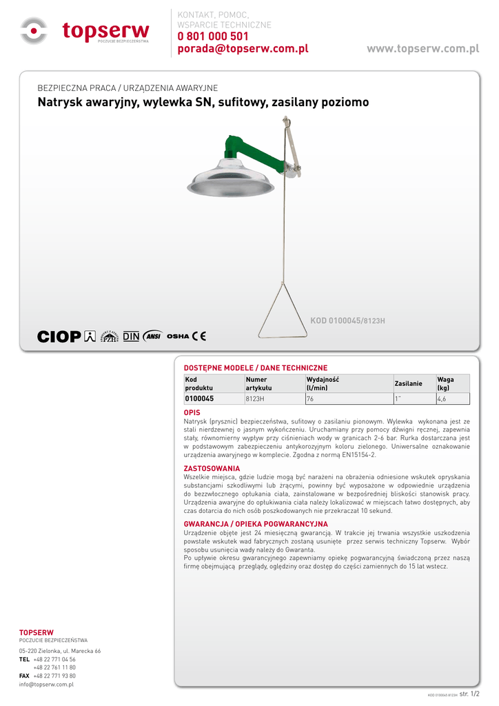 KONTAKT, POMOC, WSPARCIE TECHNICZNE 0 801 000 501 [email protected] www.topserw.com.pl BEZPIECZNA PRACA / URZĄDZENIA AWARYJNE Natrysk awaryjny, wylewka SN, sufitowy, zasilany poziomo KOD 0100045/8123H DOSTĘPNE MODELE / DANE TECHNICZNE Kod produktu Numer artykułu Wydajność (l/min) Zasilanie Waga (kg) 0100045 8123H 76 1” 4,6 OPIS Natrysk (prysznic) bezpieczeństwa, sufitowy o zasilaniu pionowym. Wylewka wykonana jest ze stali nierdzewnej o jasnym wykończeniu. Uruchamiany przy pomocy dźwigni ręcznej, zapewnia stały, równomierny wypływ przy ciśnieniach wody w granicach 2-6 bar. Rurka dostarczana jest w podstawowym zabezpieczeniu antykorozyjnym koloru zielonego. Uniwersalne oznakowanie urządzenia awaryjnego w komplecie. Zgodna z normą EN15154-2. ZASTOSOWANIA Wszelkie miejsca, gdzie ludzie mogą być narażeni na obrażenia odniesione wskutek opryskania substancjami szkodliwymi lub żrącymi, powinny być wyposażone w odpowiednie urządzenia do bezzwłocznego opłukania ciała, zainstalowane w bezpośredniej bliskości stanowisk pracy. Urządzenia awaryjne do opłukiwania ciała należy lokalizować w miejscach łatwo dostępnych, aby czas dotarcia do nich osób poszkodowanych nie przekraczał 10 sekund. GWARANCJA / OPIEKA POGWARANCYJNA Urządzenie objęte jest 24 miesięczną gwarancją. W trakcie jej trwania wszystkie uszkodzenia powstałe wskutek wad fabrycznych zostaną usunięte przez serwis techniczny Topserw. Wybór sposobu usunięcia wady należy do Gwaranta. Po upływie okresu gwarancyjnego zapewniamy opiekę pogwarancyjną świadczoną przez naszą firmę obejmującą przeglądy, oględziny oraz dostęp do części zamiennych do 15 lat wstecz. TOPSERW POCZUCIE BEZPIECZEŃSTWA 05-220 Zielonka, ul. Marecka 66 TEL +48 22 771 04 56 +48 22 761 11 80 FAX +48 22 771 93 80 [email protected] KOD 0100045 8123H str. 1/2 KONTAKT, POMOC, WSPARCIE TECHNICZNE 0 801 000 501 [email protected] www.topserw.com.pl BEZPIECZNA PRACA / URZĄDZENIA AWARYJNE Natrysk awaryjny, wylewka SN, sufitowy, zasilany poziomo 1” IPS F Zasilanie Podłoga WYPOSAŻENIE DODATKOWE TWBSSH - System termostatyczny do mieszania wody o przepływie 95 l/min 9202 - Mieszacz termostatyczny ciepłej i zimnej wody 151 l/min 9021 - Znak informacyjny trójstronny - natrysk awaryjny 9001 - System alarmowy - alarm dźwiękowy i świetlny TOPSERW POCZUCIE BEZPIECZEŃSTWA 05-220 Zielonka, ul. Marecka 66 TEL +48 22 771 04 56 +48 22 761 11 80 FAX +48 22 771 93 80 [email protected] KOD 0100045 8123H str. 2/2