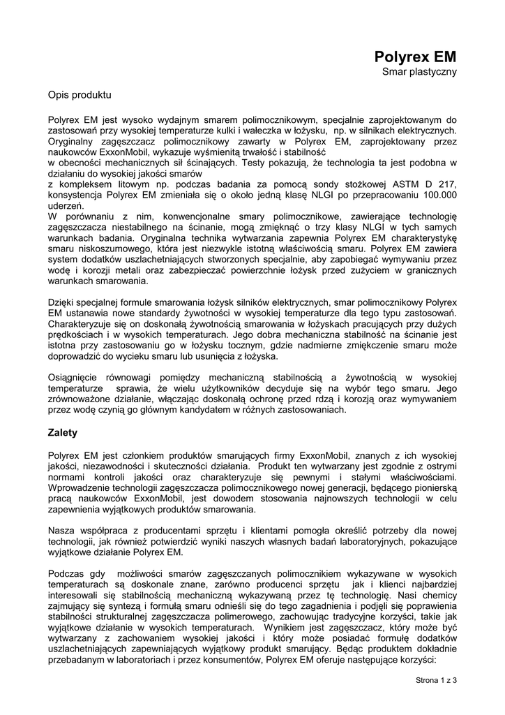 Polyrex EM Smar plastyczny Opis produktu Polyrex EM jest wysoko wydajnym smarem polimocznikowym, specjalnie zaprojektowanym do zastosowań przy wysokiej temperaturze kulki i wałeczka w łożysku, np. w silnikach elektrycznych. Oryginalny zagęszczacz polimocznikowy zawarty w Polyrex EM, zaprojektowany przez naukowców ExxonMobil, wykazuje wyśmienitą trwałość i stabilność w obecności mechanicznych sił ścinających. Testy pokazują, że technologia ta jest podobna w działaniu do wysokiej jakości smarów z kompleksem litowym np. podczas badania za pomocą sondy stożkowej ASTM D 217, konsystencja Polyrex EM zmieniała się o około jedną klasę NLGI po przepracowaniu 100.000 uderzeń. W porównaniu z nim, konwencjonalne smary polimocznikowe, zawierające technologię zagęszczacza niestabilnego na ścinanie, mogą zmięknąć o trzy klasy NLGI w tych samych warunkach badania. Oryginalna technika wytwarzania zapewnia Polyrex EM charakterystykę smaru niskoszumowego, która jest niezwykle istotną właściwością smaru. Polyrex EM zawiera system dodatków uszlachetniających stworzonych specjalnie, aby zapobiegać wymywaniu przez wodę i korozji metali oraz zabezpieczać powierzchnie łożysk przed zużyciem w granicznych warunkach smarowania. Dzięki specjalnej formule smarowania łożysk silników elektrycznych, smar polimocznikowy Polyrex EM ustanawia nowe standardy żywotności w wysokiej temperaturze dla tego typu zastosowań. Charakteryzuje się on doskonałą żywotnością smarowania w łożyskach pracujących przy dużych prędkościach i w wysokich temperaturach. Jego dobra mechaniczna stabilność na ścinanie jest istotna przy zastosowaniu go w łożysku tocznym, gdzie nadmierne zmiękczenie smaru może doprowadzić do wycieku smaru lub usunięcia z łożyska. Osiągnięcie równowagi pomiędzy mechaniczną stabilnością a żywotnością w wysokiej temperaturze sprawia, że wielu użytkowników decyduje się na wybór tego smaru. Jego zrównoważone działanie, włączając doskonałą ochronę przed rdzą i korozją oraz wymywaniem przez wodę czynią go głównym kandydatem w różnych zastosowaniach. Zalety Polyrex EM jest członkiem produktów smarujących firmy ExxonMobil, znanych z ich wysokiej jakości, niezawodności i skuteczności działania. Produkt ten wytwarzany jest zgodnie z ostrymi normami kontroli jakości oraz charakteryzuje się pewnymi i stałymi właściwościami. Wprowadzenie technologii zagęszczacza polimocznikowego nowej generacji, będącego pionierską pracą naukowców ExxonMobil, jest dowodem stosowania najnowszych technologii w celu zapewnienia wyjątkowych produktów smarowania. Nasza współpraca z producentami sprzętu i klientami pomogła określić potrzeby dla nowej technologii, jak również potwierdzić wyniki naszych własnych badań laboratoryjnych, pokazujące wyjątkowe działanie Polyrex EM. Podczas gdy możliwości smarów zagęszczanych polimocznikiem wykazywane w wysokich temperaturach są doskonale znane, zarówno producenci sprzętu jak i klienci najbardziej interesowali się stabilnością mechaniczną wykazywaną przez tę technologię. Nasi chemicy zajmujący się syntezą i formułą smaru odnieśli się do tego zagadnienia i podjęli się poprawienia stabilności strukturalnej zagęszczacza polimerowego, zachowując tradycyjne korzyści, takie jak wyjątkowe działanie w wysokich temperaturach. Wynikiem jest zagęszczacz, który może być wytwarzany z zachowaniem wysokiej jakości i który może posiadać formułę dodatków uszlachetniających zapewniających wyjątkowy produkt smarujący. Będąc produktem dokładnie przebadanym w laboratoriach i przez konsumentów, Polyrex EM oferuje następujące korzyści: Strona 1 z 3 Własności Oryginalna technologia zagęszczacza polimocznikowego stabilnego na ścinanie Doskonała stabilność przy wysokich temperaturach Doskonałe zabezpieczenie przed rdzą i korozją Wysoki poziom zabezpieczenia przeciwzużyciowego Doskonała odporność na wymywanie wodą Niski poziom szumów Zalety Doskonała stabilność mechaniczna zapewnia dłuższą żywotność smaru oraz niski poziom wycieków przy wysokim ścinaniu – szczególnie istotne w przypadku łożysk tocznych Wyjątkowa żywotność smaru w zastosowaniach w wysokich temperaturach Doskonała ochrona łożysk i ich dłuższa żywotność w warunkach wilgoci Dobra ochrona łożysk w wysokich temperaturach i innych sytuacjach, kiedy występuje tylko cienka warstwa ochronna Zachowana struktura smaru i jego działanie w obecności rozpylonej wody Dłuższa żywotność łożyska i jego cichsza praca w zastosowaniach wymagających ograniczonego hałasu Zastosowanie Smar polimocznikowy Polyrex EM ustanawia nowe standardy dłuższego działania w zastosowaniach w wysokich temperaturach, gdzie wymagana jest dobra stabilność mechaniczna i niska separacja oleju. Przykłady zastosowań pokazujących przewagę Polyrex EM nad innymi środkami to: • Łożyska silników elektrycznych. • Łożyska wentylatorów. • Łożyska pomp pracujących w wysokich temperaturach. • Łożyska kulkowe smarowane fabrycznie, niewymagające wymiany środka smarującego. • Łożyska kulkowe lub wałeczkowe pracujące w wysokich temperaturach, gdzie wymagana jest niska separacja oleju. • Łożyska kulkowe i wałeczkowe pracujące w środowisku wymagającym ograniczonego hałasu. Typowa charakterystyka fizykochemiczna Polyrex EM Klasa penetracji NLGI Rodzaj zagęszczacza Kolor Penetracja Robocza w temp.25 ºC, [0.1mm] ASTM D 217 Temperatura kroplenia, [ºC], ASTM D 2265 Lepkość oleju bazowego w temp. 40ºC, [cSt], ASTM D 445 Zmiana penetracji po 100000 cykli - 60, [0.1mm], ISO 217 Własności wysokotemperaturowe, [h], ASTM D 3336, Własności niskotemperaturowe, ASTM D 1478: Moment obr. rozruchowy w temp. -29ºC, [gcm] Moment obr. roboczy w temp. -29º C, [gcm] Emcor Test, ASTM D 6138 Aparat czterokulowy: średnica skazy, [mm], ASTM D 259