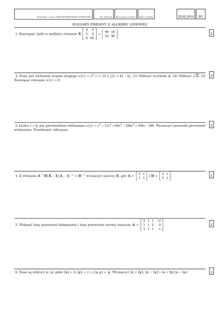 22.02.2014 B1 EGZAMIN PISEMNY Z ALGEBRY LINIOWEJ 1