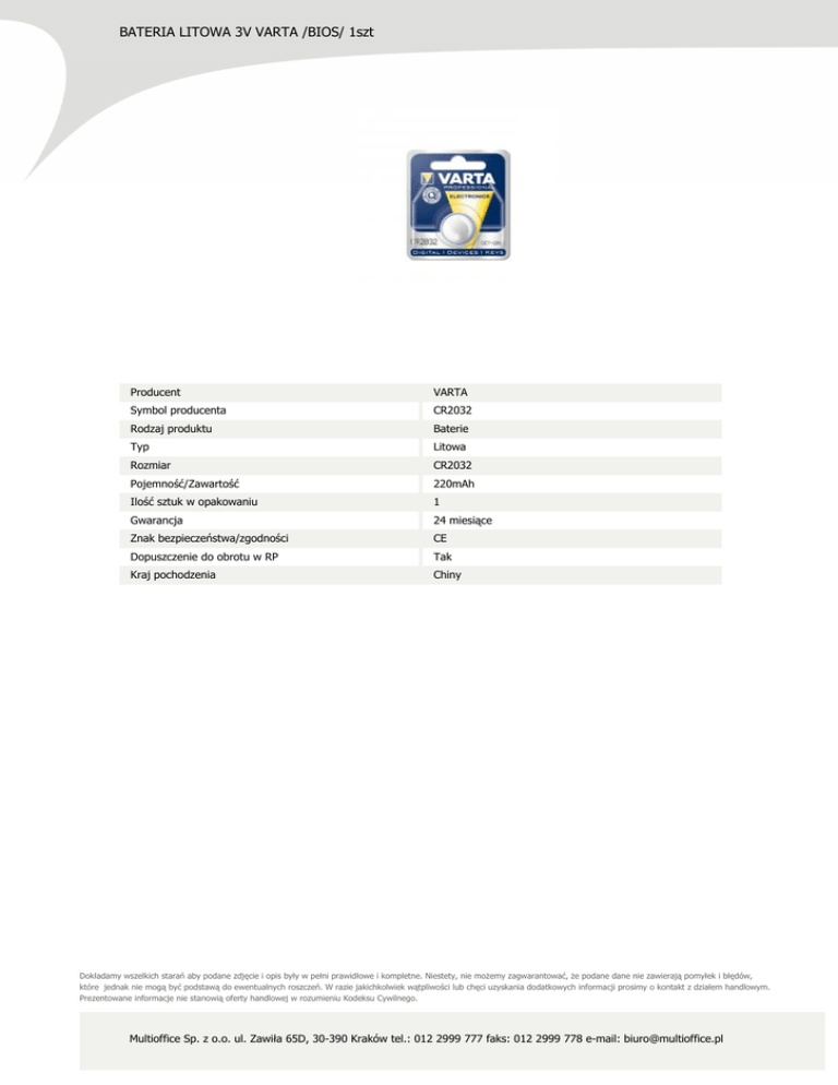 BATERIA LITOWA 3V VARTA /BIOS/ 1szt Producent VARTA Symbol producenta CR2032 Rodzaj produktu Baterie Typ Litowa Rozmiar CR2032 Pojemność/Zawartość 220mAh Ilość sztuk w opakowaniu 1 Gwarancja 24 miesiące Znak bezpieczeństwa/zgodności CE Dopuszczenie do obrotu w RP Tak Kraj pochodzenia Chiny Dokładamy wszelkich starań aby podane zdjęcie i opis były w pełni prawidłowe i kompletne. Niestety, nie możemy zagwarantować, że podane dane nie zawierają pomyłek i błędów, które jednak nie mogą być podstawą do ewentualnych roszczeń. W razie jakichkolwiek wątpliwości lub chęci uzyskania dodatkowych informacji prosimy o kontakt z działem handlowym. Prezentowane informacje nie stanowią oferty handlowej w rozumieniu Kodeksu Cywilnego. Multioffice Sp. z o.o. ul. Zawiła 65D, 30-390 Kraków tel.: 012 2999 777 faks: 012 2999 778 e-mail: [email protected]