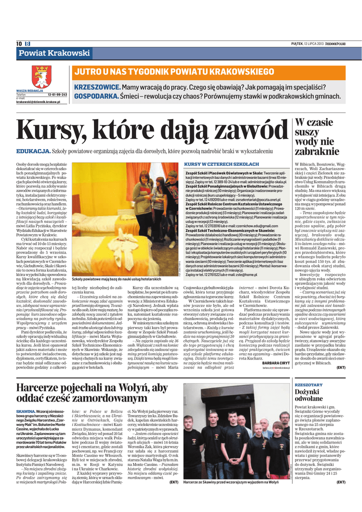 10 B PIĄTEK, 12 LIPCA 2013 Powiat Krakowski JUTRO U NAS TYGODNIK POWIATU KRAKOWSKIEGO WASZA REDAKCJA Telefon 12–61–99–243 e–mail [email protected] KRZESZOWICE. Mamy wracają do pracy. Czego się obawiają? Jak pomagają im specjaliści? GOSPODARKA. Śmieci – rewolucja czy chaos? Porównujemy stawki w podkrakowskich gminach. W czasie suszy wody nie zabraknie Kursy, które dają zawód EDUKACJA. Szkoły powiatowe organizują zajęcia dla dorosłych, które pozwolą nadrobić braki w wykształceniu W Bibicach, Bosutowie, Węgrzcach, Woli Zachariaszowskiej i części Zielonek nie zabraknie już wody. Przedsiębiorstwo Usług Komunalnych uruchomiło w Bibicach drugą studnię. Ma ona nieco większą wydajność niż istniejąca. Z obu ujęć w ciągu godziny urządzenia mogą wypompować ponad 120 m sześc. – Teraz zaspokojone będzie zapotrzebowanie w tym rejonie, gdzie często, zwłaszcza podczas upałów, gdy pobór był znacznie większy niż zazwyczaj, brakowało wody. Mieszkańcy dotkliwie odczuli to latem zeszłego roku – mówi Romuald Zaniewski, prezes przedsiębiorstwa, które z własnego budżetu pokryło koszt ponad 150 tys. zł zbudowania obok starej studni, nowego ujęcia wody. Inwestycję rozpoczęto w ubiegłym roku odwiertem sprawdzajacym jakość wody i wydajność studni. – Czarny scenariusz już się nie powtórzy, chociaż też borykamy się z innymi problemami jak zalewana sieć kanalizacyjna podczas intensywnych opadów deszczu czy awariami w sieci wodociągowej, którą sukcesywnie wymieniamy – dodał prezes Zaniewski. Nowe ujęcie wody jest wyposażone w agregat prądotwórczy, stanowiący awaryjne zasilanie w przypadku braku prądu. Urządzenie okazało się bardzo przydatne, gdy niedawno doszło do awarii sieci energetycznej w Bibicach. (EKT) KURSY W CZTERECH SZKOŁACH FOT. EWA TYRPA Osoby dorosłe mogą bezpłatnie dokształcać się w czterech szkołach ponadgimnazjalnych powiatu krakowskiego. Po wakacjach placówki otwierają kursy, które pozwolą na zdobywanie zawodówzwiązanychzinformatyką, instalacjami elektrycznymi, hotelarstwem, rolnictwem, rachunkowością oraz handlem. – Otwieramy takie kierunki, żeby kształcić ludzi, korzystając z istniejącej bazy szkół i kwalifikacji naszych nauczycieli – mówi Lidia Pycińska, dyrektor WydziałuEdukacjiwStarostwie Powiatowym w Krakwie. Cykl kształcenia na kursach ma trwać od 10 do 13 miesięcy. Nabór się rozpoczął i będzie prowadzony do 5 września. Kursy kwalifikacyjne w szkołach powiatowych w Czernichowie, Giebułtowie, Skale i Skawinie to nowa forma kształcenia, która wypełni lukę spowodowaną likwidacją szkół zawodowych dla dorosłych. – Prowadząc te zajęcia wychodzimy naprzeciw potrzebom osób dorosłych, które chcą się dalej kształcić, doskonalić zawodowo, zdobywać nowe uprawnienia i przekwalifikować się. Proponując kurs zawodowe odpowiadamy na potrzeby rynku. Współpracujemy z urzędem pracy – mówi Pycińska. Pani dyrektor podkreśla, że szkoły opracują indywidualną ścieżkę dla każdego uczestnika kursu. Jeśli ktoś opanował jakiś zakres materiału i może to potwierdzić świadectwem, dyplomem, certyfikatem, to teraz będzie miał odliczane odpowiednie godziny z całkowi- Zespół Szkół i Placówek Oświatowych w Skale: Tworzenieaplikacjiinternetowychbazdanychiadministrowaniebazami(trwa10miesięcy).Zapisynrtel.12389-10-24lube-mail:[email protected] Zespół Szkół Ponadgimnazjalnych w Giebułtowie: Prowadzenieprodukcjirolniczej(10miesięcy);Organizacjainadzorowanieprodukcjirolniczej(kursuzupełniający–5miesięcy). Zapisynrtel.124192019lube-mail:[email protected] Zespół Szkół Rolnicze Centrum Kształcenia Ustawicznego w Czernichowie: Prowadzenierachunkowości(11miesięcy);Prowadzenieprodukcjirolniczej(13miesięcy);Planowanieirealizacjazadań związanychzochronąśrodowiska(12miesięcy);Planowanieirealizacja usługwrecepcji(12miesięcy). Zapisynrtel.122702016lube-mail:[email protected] Zespół Szkół Techniczno-Ekonomicznych w Skawinie: Prowadzeniedziałalnościhandlowej(10miesięcy);Prowadzenierachunkowości(11miesięcy);Rozliczaniewynagrodzeńipodatków(11 miesięcy);Planowanieirealizacjausługwrecepcji(11miesięcy);Obsługagościwobiekcieświadczącymusługihotelarskie(11miesięcy);Montażieksploatacjakomputerówosobistychiurządzeńperyferyjnych(10 miesięcy);Projektowanielokalnychsiecikomputerowychiadministrowaniasieciami(10miesięcy);Tworzenieaplikacjiinternetowychibaz danychorazadministrowaniebazami(10miesięcy);Montażikonserwacjainstalacjielektrycznych(11miesięcy). Zapisynrtel.122761522lube-mail:[email protected] Szkoły powiatowe mają bazę do nauki usług hotelarskich tej liczby niezbędnej do zaliczenia kursu. – Uczestnicy szkoleń na zakończenie mogą zdać egzamin przedkomisjąokręgową.Toważnedlaosób,któremająmaturę,bo zdobędą nowy zawód z tytułem technika.Szkołapotwierdzitoodpowiednimi dokumentami. Jednaktrzebaukończyćdwalubtrzy kursy,zdobyćodpowiedniekwalifikacje – mówi Marta Wojtanowska, wicedyrektor Zespołu Szkół Techniczno-Ekonomicznych w Skawinie. Wskazuje, że dotychczas w jej szkole jest najwięcej chętnych na kursy związane z rachunkowością i obsługą gości w hotelach. Kursy dla uczestników są bezpłatne, bo powiat po ich uruchomieniu ma zapewnioną subwencję z Ministerstwa Edukacji Narodowej. Jednak wpłata nastąpi dopiero od początku roku, natomiast kształcenie rozpoczyna się jesienią. W minionym roku szkolnym pierwszy taki kurs był prowadzony w Zespole Szkół Ponadgimnazjalnych w Giebułtowie. – Na zajęcia zapisało się 36 osób. Większość z nich na koniec zdecydowała się zadawać egzaminy przed komisją państwową. Dzięki temu będąmogli kontynuować naukę na kursie uzupełniającym – mówi Maria Czajowska z giebułtowskiej placówki, która teraz przyjmuje zgłoszenia na tegoroczne kursy. W Czernichowie takich kursów jeszcze nie było, ale od w
