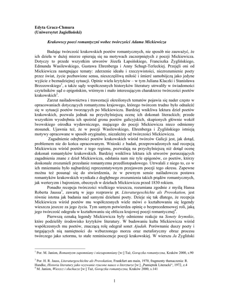 Edyta Gracz-Chmura (Uniwersytet Jagielloński) Krakowscy poeci romantyczni wobec twórczości Adama Mickiewicza Badając twórczość krakowskich poetów romantycznych, nie sposób nie zauważyć, że ich dzieła w dużej mierze opierają się na motywach zaczerpniętych z poezji Mickiewicza. Dotyczy to przede wszystkim utworów Józefa Łapsińskiego, Franciszka Żyglińskiego, Edmunda Wasilewskiego, Gustawa Ehrenberga i Anny Schugt-Terleckiej. Przejęli oni od Mickiewicza następujące tematy: zderzenie ideału i rzeczywistości, niezrozumienie poety przez świat, życie pozbawione sensu, nieszczęśliwą miłość i śmierć samobójczą jako jedyne wyjście z beznadziejnej sytuacji. Opinie wielu krytyków – w tym Juliana Klaczki i Stanisława Brzozowskiego1, a także sądy współczesnych historyków literatury utrwaliły w świadomości czytelników sąd o epigońskim, wtórnym i mało interesującym charakterze twórczości poetów krakowskich2. Zarzut naśladownictwa i trawestacji określonych tematów pojawia się nader często w opracowaniach dotyczących romantyzmu krajowego, którego twórcom trudno było odnaleźć się w sytuacji poetów tworzących po Mickiewiczu. Bardziej wnikliwa lektura dzieł poetów krakowskich, pozwala jednak na przychylniejszą ocenę ich dokonań literackich; przede wszystkim wyodrębnia ich spośród grona poetów galicyjskich, skupionych głównie wokół lwowskiego ośrodka wydawniczego, mającego do poezji Mickiewicza nieco odmienny stosunek. Ujawnia też, że w poezji Wasilewskiego, Ehrenberga i Żyglińskiego istnieją motywy opracowane w sposób oryginalny, niezależny od twórczości Mickiewicza. Zagadnienie odrębności poetów krakowskich wśród twórców Galicji jest, jak dotąd, problemem nie do końca opracowanym. Wnioski z badań, przeprowadzonych nad recepcją Mickiewicza wśród poetów z tego regionu, pozwalają na przychylniejszą niż dotąd ocenę dokonań romantyków krakowskich. Bardziej wnikliwa lektura ich utworów poruszających zagadnienia znane z dzieł Mickiewicza, odsłania nam nie tyle epigonów, co poetów, którzy doskonale zrozumieli przesłanie romantyzmu przedlistopadowego. Utrwalali z niego to, co w ich mniemaniu było najbardziej reprezentatywnym przejawem poezji tego okresu. Zapewne można też posunąć się do stwierdzenia, że w pewnym sensie naśladowcza postawa romantyków krakowskich wynikała z dogłębnego zrozumienia takich prądów romantycznych, jak werteryzm i bajronizm, obecnych w dziełach Mickiewicza przed 1830 rokiem. Ponadto recepcja twórczości wielkiego wieszcza, rozumiana zgodnie z myślą Hansa Roberta Jaussa3, zawartą w jego rozprawie pt. Literaturgeschichte als Provokation, jest równie istotna jak badania nad samymi dziełami poety. Dzieje się tak dlatego, że recepcja Mickiewicza wśród poetów mu współczesnych wiele mówi o kształtowaniu się legendy wieszcza jeszcze za jego życia. Tym samym potwierdza opinię o bezprecedensowej roli, jaką jego twórczość odegrała w kształtowaniu się oblicza krajowej poezji romantycznej4. Pierwszą oznaką legendy Mickiewicza były odmienne reakcje na Sonety krymskie, które podzieliły środowisko krytyków literatury. W budowaniu kultu Mickiewicza wśród współczesnych mu poetów, znaczącą rolę odegrał sonet Ajudah. Porównanie duszy poety i targających nią namiętności do wzburzonego morza oraz metaforyczny obraz procesu twórczego jako sztormu, to stałe reminiscencje poezji krakowskiej. W wierszu Ja Żygliński 1 Por. M. Janion, Romantyzm zapomniany i niezapomniany [w:] Taż, Gorączka romantyczna, Kraków 2000, s.90 3 Por. H. R. Jauss, Literaturgeschichte als Provokation, Frankfurt am main, 1970, fragmenty tłumaczenia: R. Handke, Historia literatury jako wyzwanie rzucone nauce o literzturze [w:] „Pamiętnik Literacki“, 1972, z.4 4 M. Janion, Wieszcz i słuchacze [w:] Taż, Gorączka romantyczna, Kraków 2000, s.141 1 pisze o wewnętrznych sprzecznościach, które targają jego duszą niczym okrętem: „taka w duszy fala, to mnie w raj wznosi, to mię w piekło zwala”. Mickiewicz był pierwszym twórcą w historii literatury polskiej, mogącym cieszyć się kultem wieszcza narodowego, mianem patrona patriotycznie nastawionej młodzieży i poetą genialnym, o którego talencie i polocie pisarskim inni mogli jedynie pomarzyć. Poeci krajowi już nie tylko trawestują poezję Mickiewicza, ale i utożsamiają się z nim, jako z poetą i człowiekiem; powołują się na myśli wieszcza, gdy piszą swe utwory. Umieszczając – jako motto swych wierszy cytaty z dzieł Mickiewicza, szukają u niego poparcia dla własnych tez. Poparcia i akceptacji, których mogłoby zabraknąć, gdyby nie autorytet autora Dziadów. Dla piśmiennictwa krakowskiego, pozostającego jeszcze do lat trzydziestych pod wpływem sentymentalizmu, nowatorski wymiar Ballad i romansów okazał się faktem literackim, który zapoczątkował nową erę poezji. W prasie krakowskiej pojawiają się pierwsze naśladowania utworów Mickiewicza. W 1823 r. w „Muzie Nadwiślańskiej” ukazał się anonimowy plagiat ballady Pani Twardowska, zatytułowany Powieść o Twardowskim, a w „Rozrywkach Przyjemnych i Pożytecznych” elegia Pogrzeb Marysi, wzorowana na Kurhanku Maryli. W Krakowie – mieście wolnym tylko w nigdy niezrealizowanej teorii, gdzie wydawcy objęci byli ścisłym nadzorem państw zaborczych, oczekiwanie na kolejne poezje wieszcza było tak duże, że w 1828 roku miejscowy wydawca Stanisław Gieszkowski przedrukował Konrada Wallenroda bez jakiegokolwiek porozumienia z Mickiewiczem. Jedynym pierwodrukiem utworu Mickiewicza wydanym w Krakowie był wiersz Do matki Polki, opublikowany na łamach „Gońca Krakowskiego” w 1831 r. Dopiero kilka lat później ukazały się utwory Do M***, Do M.S., Rozum i wiara (w „Tygodniku Krakowskim”, 1834), Do M.Ł. w dzień przyjęcia komunii Świętej (w „Zbieraczu Literackim i Politycznym”, 183