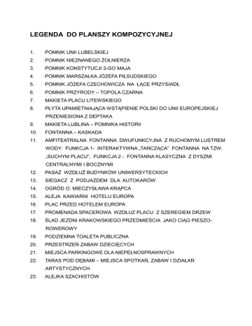 LEGENDA DO PLANSZY KOMPOZYCYJNEJ 1. POMNIK UNII LUBELSKIEJ 2. POMNIK NIEZNANEGO ŻOŁNIERZA 3. POMNIK KONSTYTUCJI 3-GO MAJA 4. POMNIK MARSZAŁKA JÓZEFA PIŁSUDSKIEGO 5. POMNIK JÓZEFA CZECHOWICZA NA ŁĄCE PRZYSIADŁ 6. POMNIK PRZYRODY – TOPOLA CZARNA 7. MAKIETA PLACU LITEWSKIEGO 8. PŁYTA UPAMIETNIAJĄCA WSTĄPIENIE POLSKI DO UNII EUROPEJSKIEJ PRZENIESIONA Z DEPTAKA 9. MAKIETA LUBLINA – POMNIKA HISTORII 10. FONTANNA – KASKADA 11. AMFITEATRALNA FONTANNA DWUFUNKCYJNA Z RUCHOMYM LUSTREM WODY: FUNKCJA 1- INTERAKTYWNA „TAŃCZĄCA” FONTANNA NA TZW. „SUCHYM PLACU”, FUNKCJA 2 - FONTANNA KLASYCZNA Z DYSZMI CENTRALNYMI I BOCZNYMI 12. PASAŻ WZDŁUŻ BUDYNKÓW UNIWERSYTECKICH 13. SIEGACZ Z PODJAZDEM DLA AUTOKARÓW 14. OGRÓD O. MIECZYSŁAWA KRĄPCA 15. ALEJA KAWIARNI HOTELU EUROPA 16. PLAC PRZED HOTELEM EUROPA 17. PROMENADA SPACEROWA WZDŁUZ PLACU Z SZEREGIEM DRZEW 18. ŚLAD JEZDNI KRAKOWSKIEGO PRZEDMIEŚCIA JAKO CIĄG PIESZOROWEROWY 19. PODZIEMNA TOALETA PUBLICZNA 20. PRZESTRZEŃ ZABAW DZIECIĘCYCH 21. MIEJSCA PARKINGOWE DLA NIEPEŁNOSPRAWNYCH 22. TARAS POD DĘBAMI – MIEJSCA SPOTKAŃ, ZABAW I DZIAŁAŃ ARTYSTYCZNYCH 23. ALEJKA SZACHISTÓW