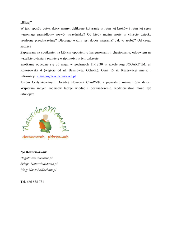 „Bliżej” W jaki sposób dotyk skóry mamy, delikatne kołysanie w rytm jej kroków i rytm jej serca wspomaga prawidłowy rozwój wcześniaka? Od kiedy można nosić w chuście dziecko urodzone przedwcześnie? Dlaczego ważny jest dobór wiązania? Jak to zrobić? Od czego zacząć? Zapraszam na spotkanie, na którym opowiem o kangurowaniu i chustowaniu, odpowiem na wszelkie pytania i rozwieję wątpliwości w tym zakresie. Spotkanie odbędzie się 30 maja, w godzinach 11-12.30 w szkole jogi JOGARYTM, ul. Rokosowska 4 (wejście od ul. Baśniowej, Ochota.). Cena 15 zł. Rezerwacja miejsc i informacje: [email protected] Jestem Certyfikowanym Doradcą Noszenia ClauWi®, a prywatnie mamą trójki dzieci. Wspieram innych rodziców łącząc wiedzę i doświadczenie. Rodzicielstwo może być łatwiejsze. Iza Banach-Kubik PogotowieChustowe.pl Sklep: NaturalnaMama.pl Blog: NoszeBoKocham.pl Tel. 666 538 731