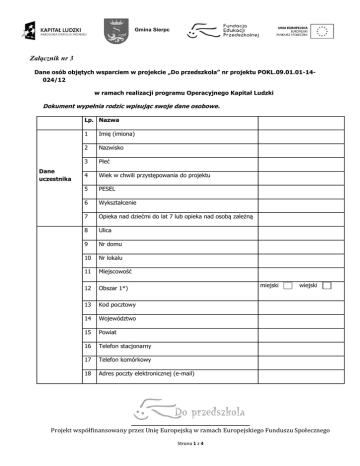 Gmina Sierpc Załącznik nr 3 Dane osób objętych wsparciem w projekcie „Do przedszkola” nr projektu POKL.09.01.01-14024/12 w ramach realizacji programu Operacyjnego Kapitał Ludzki Dokument wypełnia rodzic wpisując swoje dane osobowe. Lp. Nazwa Dane uczestnika 1 Imię (imiona) 2 Nazwisko 3 Płeć 4 Wiek w chwili przystępowania do projektu 5 PESEL 6 Wykształcenie 7 Opieka nad dziećmi do lat 7 lub opieka nad osobą zależną 8 Ulica 9 Nr domu 10 Nr lokalu 11 Miejscowość 12 Obszar 1*) 13 Kod pocztowy 14 Województwo 15 Powiat 16 Telefon stacjonarny 17 Telefon komórkowy 18 Adres poczty elektronicznej (e-mail) miejski wiejski Projekt współfinansowany przez Unię Europejską w ramach Europejskiego Funduszu Społecznego Strona 1 z 4 Gmina Sierpc tak *2) Bezrobotny nie długotrwale bezrobotny tak *3) Dane dodatkowe Nieaktywny zawodowo 19 Status osoby na rynku pracy w chwili przystąpienia do projektu nie osoba ucząca się lub kształcąca w mikroprzedsiębiorstwie małym przedsiębiorstwie średnim przedsiębiorstwie dużym przedsiębiorstwie) *4) Zatrudniony samozatrudniony w administracji publicznej w organizacji pozarządowej rolnik pracownik w gorszym położeniu *5) 20 Rodzaj przyznanego wsparcia 21 Wykorzystanie we wsparciu technik: elearning/blended learning Projekt współfinansowany przez Unię Europejską w ramach Europejskiego Funduszu Społecznego Strona 2 z 4 Gmina Sierpc 22 Data rozpoczęcia udziału w projekcie 23 Data zakończenia udziału w projekcie 24 Zakończenie udziału osoby we wsparciu zgodnie z zaplanowaną dla niej ścieżką uczestnictwa 25 Powód wycofania się z proponowanej formy wsparcia Tak Nie 1*)obszar (teren) miejski obszar położony w granicach administracyjnych miast obszar (teren) wiejski) powinien być rozumiany zgodnie z definicję Głównego Urzędu Statystycznego, która opiera się na podziale jednostek administracyjnych zastosowanym w rejestrze TERYT. Według GUS, obszarami wiejskimi są tereny położone poza granicami administracyjnymi miast - obszary gmin wiejskich oraz część wiejska(leżąca poza miastem) Gminy miejsko –wiejskiej. Wyodrębnienie części wiejskiej w ramach gminy miejsko – wiejskiej możliwe jest dzięki odrębnemu identyfikatorowi terytorialnemu 2*) bezrobotny -oznacza osobę bezrobotną w rozumieniu Ustawy z dnia 20 kwietnia 2004 r. o promocji zatrudnienia i instytucjach rynku pracy (Dz. U. Nr 99 z 2004 r., poz. 1001, z poz. zm.), w szczególności osobę, która jednocześnie jest osobą: - niezatrudnioną i niewykonującą innej pracy zarobkowej, zdolną i gotową do podjęcia zatrudnienia, - nieuczącą się w szkole, z wyjątkiem szkół dla dorosłych lub szkół wyższych w systemie wieczorowym albo zaocznym, - zarejestrowaną we właściwym dla miejsca zameldowania stałego lub czasowego powiatowym urzędzie pracy, - ukończyła 18 lat i nie ukończyła 60 lat w przypadku kobiet lub 65 lat w przypadku mężczyzn 3*)nieaktywny zawodowo- oznacza osobę pozostającą bez zatrudnienia, która jednocześnie nie zalicza się do kategorii bezrobotni osoba ucząca się lub kształcąca - oznacza osobę kształcącą się w ramach kształcenia formalnego i nieformalnego 4*) mikroprzedsiębiorstwo - przedsiębiorstwo zatrudniające od 2 do 9 pracowników małe przedsiębiorstwo – przedsiębiorstwo zatrudniające od 10 do 49 pracowników średnie przedsiębiorstwo - przedsiębiorstwo zatrudniające od 50 do 249 pracowników duże przedsiębiorstwo - przedsiębiorstwo zatrudniające powyżej 249 pracowników samo zatrudniony - oznacza osobę fizyczną prowadzącą działalność gospodarczą, niezatrudniającą pracowników Projekt współfinansowany przez Unię Europejską w ramach Europejskiego Funduszu Społecznego Strona 3 z 4 Gmina Sierpc administracja publiczna – administracja rządowa i samorządowa oraz w ich jednostki organizacyjne organizacje pozarządowe - w rozumieniu ustawy o działalności pożytku publicznego i wolontariacie (Dz. U. z dnia 29 maja 2003 r. z poz. zm.) z uwzględnieniem wolontariuszy działających na rzecz tych instytucji na podstawie podpisanej umowy rolnik – oznacza osobę będącą rolnikiem oraz domownikiem w rozumieniu Ustawy z dnia 20 grudnia 1990 r. o ubezpieczeniu społecznym rolników (Dz. U. z 1991 r. Nr 7, poz. 24, z późn. zm.), w szczególności, osobę, która jednocześnie: - jest pełnoletnia oraz zamieszkująca i prowadzącą na terytorium Rzeczypospolitej Polskiej, osobiście i na własny rachunek, działalność rolniczą w pozostającym w jej posiadaniu gospodarstwie rolnym, - jest ubezpieczona w Kasie Rolniczego Ubezpieczenia Społecznego, a także domownik, czyli w szczególności osoba, która: - ukończyła 16 lat, - pozostająca z rolnikiem we wspólnym gospodarstwie domowym lub zamieszkująca na terenie jego gospodarstwa rolnego albo w bliskim sąsiedztwie, - stale pracująca w tym gospodarstwie rolnym i nie jest związana z rolnikiem stosunkiem pracy 5*) pracownik w gorszym położeniu - (pracownik znajdujący się w szczególnie niekorzystnej sytuacji )należy przez to rozumieć osobę która spełnia co najmniej jeden z następujących warunków: a) pozostawała bez zatrudnienia przez okres co najmniej 6 miesięcy poprzedzających zatrudnienie; b) nie ma wykształcenia ponadgimnazjalnego lub zawodowego zgodnie z Międzynarodową Standardową Klasyfikacją Edukacji (ISCED), na poziomie ISCED 3; c) najpóźniej w dniu poprzedzającym przystąpienie do projektu ukończyła 50. rok życia; d) jest samotną osobą dorosłą wychowującą co najmniej jedno dziecko w rozumieniu art. 6 ust. Ustawy z dnia 26 lipca 1991 r. o podatku dochodowym od osób fizycznych (Dz. U. z 2000 r. Nr 14, poz. 176, z późn. Zm.) lub posiadającą na utrzymaniu osobę zależną; e) Pracuje w sektorze lub zawodzie, w których różnica w poziomie zatrudnienia kobiet i mężczyzn jest co najmniej o 25% wyższa niż przeciętna różnica w poziomie zatrudnienia kobiet i męż