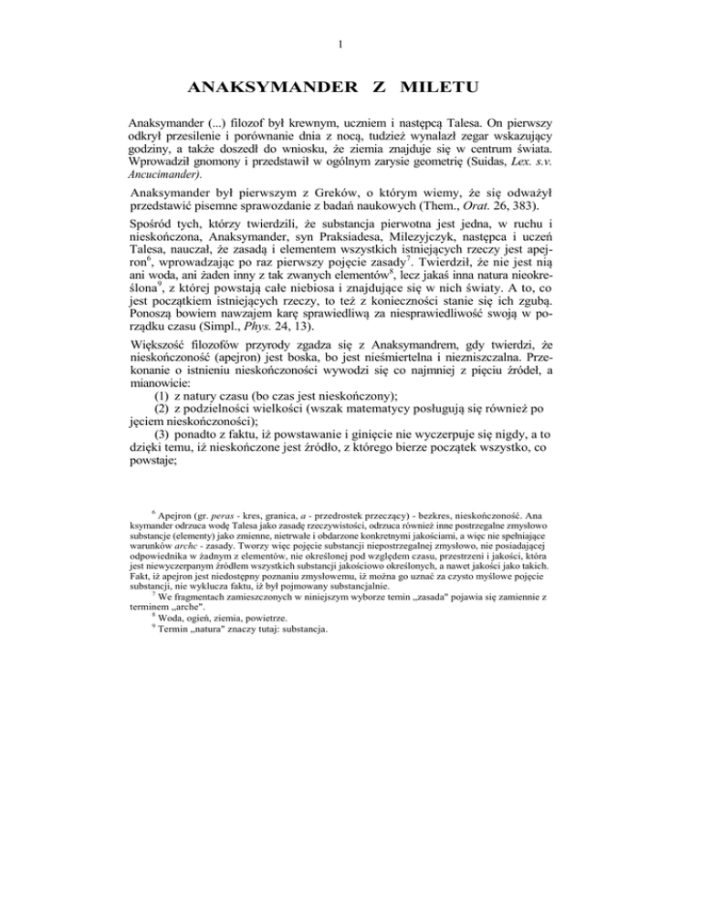 1 ANAKSYMANDER Z MILETU Anaksymander (...) filozof był krewnym, uczniem i następcą Talesa. On pierwszy odkrył przesilenie i porównanie dnia z nocą, tudzież wynalazł zegar wskazujący godziny, a także doszedł do wniosku, że ziemia znajduje się w centrum świata. Wprowadził gnomony i przedstawił w ogólnym zarysie geometrię (Suidas, Lex. s.v. Ancucimander). Anaksymander był pierwszym z Greków, o którym wiemy, że się odważył przedstawić pisemne sprawozdanie z badań naukowych (Them., Orat. 26, 383). Spośród tych, którzy twierdzili, że substancja pierwotna jest jedna, w ruchu i nieskończona, Anaksymander, syn Praksiadesa, Milezyjczyk, następca i uczeń Talesa, nauczał, że zasadą i elementem wszystkich istniejących rzeczy jest apejron6, wprowadzając po raz pierwszy pojęcie zasady7. Twierdził, że nie jest nią ani woda, ani żaden inny z tak zwanych elementów8, lecz jakaś inna natura nieokreślona9, z której powstają całe niebiosa i znajdujące się w nich światy. A to, co jest początkiem istniejących rzeczy, to też z konieczności stanie się ich zgubą. Ponoszą bowiem nawzajem karę sprawiedliwą za niesprawiedliwość swoją w porządku czasu (Simpl., Phys. 24, 13). Większość filozofów przyrody zgadza się z Anaksymandrem, gdy twierdzi, że nieskończoność (apejron) jest boska, bo jest nieśmiertelna i niezniszczalna. Przekonanie o istnieniu nieskończoności wywodzi się co najmniej z pięciu źródeł, a mianowicie: (1) z natury czasu (bo czas jest nieskończony); (2) z podzielności wielkości (wszak matematycy posługują się również po jęciem nieskończoności); (3) ponadto z faktu, iż powstawanie i ginięcie nie wyczerpuje się nigdy, a to dzięki temu, iż nieskończone jest źródło, z którego bierze początek wszystko, co powstaje; 6 Apejron (gr. peras - kres, granica, a - przedrostek przeczący) - bezkres, nieskończoność. Ana ksymander odrzuca wodę Talesa jako zasadę rzeczywistości, odrzuca również inne postrzegalne zmysłowo substancje (elementy) jako zmienne, nietrwałe i obdarzone konkretnymi jakościami, a więc nie spełniające warunków archc - zasady. Tworzy więc pojęcie substancji niepostrzegalnej zmysłowo, nie posiadającej odpowiednika w żadnym z elementów, nie określonej pod względem czasu, przestrzeni i jakości, która jest niewyczerpanym źródłem wszystkich substancji jakościowo określonych, a nawet jakości jako takich. Fakt, iż apejron jest niedostępny poznaniu zmysłowemu, iż można go uznać za czysto myślowe pojęcie substancji, nie wyklucza faktu, iż był pojmowany substancjalnie. 7 We fragmentach zamieszczonych w niniejszym wyborze temin „zasada" pojawia się zamiennie z terminem „arche". 8 Woda, ogień, ziemia, powietrze. 9 Termin „natura" znaczy tutaj: substancja. 2 (4) również z faktu, że ograniczone znajduje swe ograniczenie w innej rzeczy, tak iż nie może istnieć kres, jeśli cokolwiek jest ograniczone przez coś różnego od siebie; (5) wreszcie najważniejsze ze wszystkich źródeł, sprawiające wszystkim wspólny kłopot: zważywszy mianowicie, że w myśleniu nie ma żadnej luki, przy puszcza się, że również liczba i matematyczne wielkości, a także przestrzeń poza niebem są nieskończone (Arist., Phys. III 4, 203b 14). Ci, którzy sądzili, że jest nieskończenie wiele światów, jak zwolennicy Ana ksymandra, Leukippos, Demokryt 10, a później epikurejczycy, sądzili również, że owe światy powstają i giną w nieskończoności11, przy czym pewne z nich zawsze powstają, inne giną: twierdzą też, że ruch jest wieczny (Simpl., Phys. 1121, 5). Powiadają (Anaksymander, Demokryt, Epikur), że przyczyną ciągłego powstawania i zanikania rzeczy jest wieczny ruch. Bez ruchu bowiem nie ma powstawania i zanikania (Simpl., Phys. 1125a). Anaksymander przyjmował powstawanie rzeczy nie na zasadzie jakościowej zmiany pratworzywa, ale w następstwie wyodrębniania się przeciwieństw, wskutek wiecznego ruchu. Przeciwieństwami zaś są: zimne - gorące, suche - mokre i inne (Simpl., Phys. 24, 13). Inni znów głoszą, że przeciwieństwa tkwią w jedności i że z niej się wyłaniają, jak na przykład Anaksymander i ci wszyscy, co twierdzą, że „jedność" jest „wielością" (Arist., Phys. l 4, 187a 20). Jest jasne, że Anaksymander, widząc wzajemną przemianę czterech elementów 12, nie uznał za słuszne uczynić jednego z nich substratem, ale coś innego obok nich; powstawanie natomiast miało być według niego nie następstwem zmiany jakościowej elementu, lecz skutkiem wyłaniania się przeciwieństw dzięki wiecznemu ruchowi (Simpl., Phys. 24, 21) 10 11 12 Leukippos i Demokryt - twórcy atomistycznej koncepcji budowy wszechświata. Nieskończoność w tym fragmencie oznacza apejron. Wody, ognia, ziemi i powietrza.