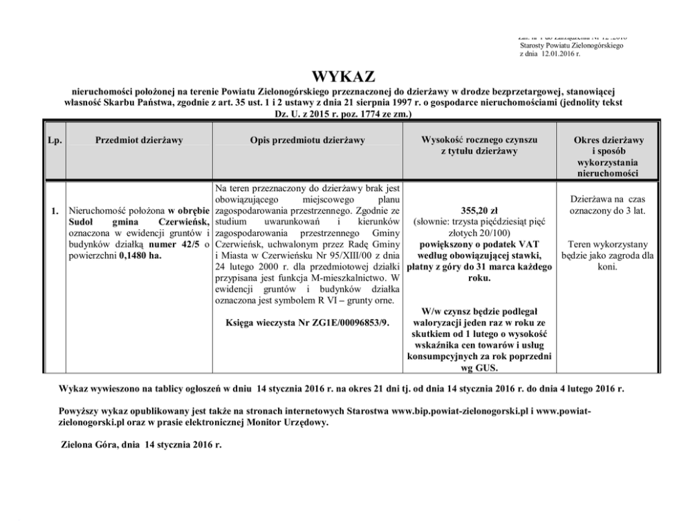 Zał. nr 1 do Zarządzenia Nr 12 .2016 Starosty Powiatu Zielonogórskiego z dnia 12.01.2016 r. WYKAZ nieruchomości położonej na terenie Powiatu Zielonogórskiego przeznaczonej do dzierżawy w drodze bezprzetargowej, stanowiącej własność Skarbu Państwa, zgodnie z art. 35 ust. 1 i 2 ustawy z dnia 21 sierpnia 1997 r. o gospodarce nieruchomościami (jednolity tekst Dz. U. z 2015 r. poz. 1774 ze zm.) Lp. 1. Przedmiot dzierżawy Nieruchomość położona w obrębie Sudoł gmina Czerwieńsk, oznaczona w ewidencji gruntów i budynków działką numer 42/5 o powierzchni 0,1480 ha. Opis przedmiotu dzierżawy Wysokość rocznego czynszu z tytułu dzierżawy Okres dzierżawy i sposób wykorzystania nieruchomości Na teren przeznaczony do dzierżawy brak jest Dzierżawa na czas obowiązującego miejscowego planu oznaczony do 3 lat. zagospodarowania przestrzennego. Zgodnie ze 355,20 zł studium uwarunkowań i kierunków (słownie: trzysta pięćdziesiąt pięć złotych 20/100) zagospodarowania przestrzennego Gminy Teren wykorzystany Czerwieńsk, uchwalonym przez Radę Gminy powiększony o podatek VAT będzie jako zagroda dla i Miasta w Czerwieńsku Nr 95/XIII/00 z dnia według obowiązującej stawki, koni. 24 lutego 2000 r. dla przedmiotowej działki płatny z góry do 31 marca każdego przypisana jest funkcja M-mieszkalnictwo. W roku. ewidencji gruntów i budynków działka oznaczona jest symbolem R VI – grunty orne. W/w czynsz będzie podlegał waloryzacji jeden raz w roku ze Księga wieczysta Nr ZG1E/00096853/9. skutkiem od 1 lutego o wysokość wskaźnika cen towarów i usług konsumpcyjnych za rok poprzedni wg GUS. Wykaz wywieszono na tablicy ogłoszeń w dniu 14 stycznia 2016 r. na okres 21 dni tj. od dnia 14 stycznia 2016 r. do dnia 4 lutego 2016 r. Powyższy wykaz opublikowany jest także na stronach internetowych Starostwa www.bip.powiat-zielonogorski.pl i www.powiatzielonogorski.pl oraz w prasie elektronicznej Monitor Urzędowy. Zielona Góra, dnia 14 stycznia 2016 r.