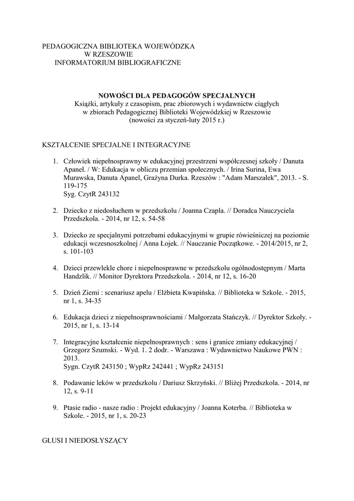 PEDAGOGICZNA BIBLIOTEKA WOJEWÓDZKA W RZESZOWIE INFORMATORIUM BIBLIOGRAFICZNE NOWOŚCI DLA PEDAGOGÓW SPECJALNYCH Książki, artykuły z czasopism, prac zbiorowych i wydawnictw ciągłych w zbiorach Pedagogicznej Biblioteki Wojewódzkiej w Rzeszowie (nowości za styczeń-luty 2015 r.) KSZTAŁCENIE SPECJALNE I INTEGRACYJNE 1. Człowiek niepełnosprawny w edukacyjnej przestrzeni współczesnej szkoły / Danuta Apanel. / W: Edukacja w obliczu przemian społecznych. / Irina Surina, Ewa Murawska, Danuta Apanel, Grażyna Durka. Rzeszów : "Adam Marszałek", 2013. - S. 119-175 Syg. CzytR 243132 2. Dziecko z niedosłuchem w przedszkolu / Joanna Czapla. // Doradca Nauczyciela Przedszkola. - 2014, nr 12, s. 54-58 3. Dziecko ze specjalnymi potrzebami edukacyjnymi w grupie rówieśniczej na poziomie edukacji wczesnoszkolnej / Anna Łojek. // Nauczanie Początkowe. - 2014/2015, nr 2, s. 101-103 4. Dzieci przewlekle chore i niepełnosprawne w przedszkolu ogólnodostępnym / Marta Handzlik. // Monitor Dyrektora Przedszkola. - 2014, nr 12, s. 16-20 5. Dzień Ziemi : scenariusz apelu / Elżbieta Kwapińska. // Biblioteka w Szkole. - 2015, nr 1, s. 34-35 6. Edukacja dzieci z niepełnosprawnościami / Małgorzata Stańczyk. // Dyrektor Szkoły. 2015, nr 1, s. 13-14 7. Integracyjne kształcenie niepełnosprawnych : sens i granice zmiany edukacyjnej / Grzegorz Szumski. - Wyd. 1. 2 dodr. - Warszawa : Wydawnictwo Naukowe PWN : 2013. Sygn. CzytR 243150 ; WypRz 242441 ; WypRz 243151 8. Podawanie leków w przedszkolu / Dariusz Skrzyński. // Bliżej Przedszkola. - 2014, nr 12, s. 9-11 9. Ptasie radio - nasze radio : Projekt edukacyjny / Joanna Koterba. // Biblioteka w Szkole. - 2015, nr 1, s. 20-23 GŁUSI I NIEDOSŁYSZĄCY 10. Gdy dziecko nie słyszy / Anna Wiśniewska. // Psychologia w Szkole. - 2015, nr 1, s. 98-103 NIEPEŁNOSPRAWNOŚĆ RUCHOWA 11. Metody zalecane w rehabilitacji seksualnej osób niepełnosprawnych fizycznie / Marzanna Mziray, Regina Żuralska, Przemysław Domagała. // Niepełnosprawność i Rehabilitacja. - 2014, nr 4, s. 120-131 12. Socjodemograficzne uwarunkowania aspiracji życiowych młodzieży niepełnosprawnej fizycznie z regionu Podkarpacia na przykładzie ich opinii / Katarzyna Sobczak. //W: Myśl i praktyka edukacyjna w obliczu zmian cywilizacyjnych. T. 2, Możliwości i zagrożenia dla rozwoju człowieka w perspektywie europejskiej. Rzeszów : Uniwersytet Rzeszowski, 2012. - S. 222-236 Sygn. CzytR 243163 AUTYZM 13. Wspieranie rozwoju dziecka z zespołem Aspergera i zaburzeniami integracji sensorycznej / Agnieszka Kozdroń. // Bliżej Przedszkola. - 2014, nr 12, s. 24-26 TERAPIA I REHABILITACJA 14. Metody rehabilitacji pacjentów z głęboką niepełnosprawnością intelektualną ze szczególnym uwzględnieniem metody Snoezelen / Aleksandra Jankiewicz, Damian Skrypnik, Katarzyna Skrypnik. // Niepełnosprawność i Rehabilitacja. - 2014, nr 4, s. 98-110 15. Ocena efektów programu kompleksowej aktywizacji społecznej dzieci w wieku 4-16 lat poruszających się na wózku inwalidzkim z zastosowaniem kwalifikatorów Międzynarodowej Klasyfikacji Funkcjonowania Niepełnosprawności i Zdrowia / Witold Rekowski, Alicja Długołęcka. // Niepełnosprawność i Rehabilitacja. - 2014, nr 4, s. 73-89 16. Ocena ryzyka zawodowego na stanowisku fizjoterapeuty z wykorzystaniem metody REBA / Kinga Kulczycka [i in.]. // Niepełnosprawność i Rehabilitacja. - 2014, nr 4, s. 132-140 17. Wpływ ćwiczeń funkcjonalnych z wykorzystaniem powierzchni niestabilnych na równowagę statyczną młodzieży z niepełnosprawnością intelektualną : doniesienie wstępne / Edyta Mikołajczyk, Agnieszka Jankowicz-Szymańska. // Niepełnosprawność i Rehabilitacja. - 2014, nr 4, s. 111-119 18. Wpływ wybranych neurorozwojowych metod rehabilitacji na relację matka-dziecko / Justyna Adler. // Niepełnosprawność i Rehabilitacja. - 2014, nr 4, s. 90-97 19. Współczesne rozwiązania techniczne w życiu osób niepełnosprawnych - wybrane obszary rozwiązań przyszłości / Barbara Grzyb, Gabriela Kowalska. // Niepełnosprawność i Rehabilitacja. - 2014, nr 4, s. 3-15 SPORT I TURYSTYKA NIEPEŁNOSPRAWNYCH 20. Przystosowawcze funkcje turystyki osób z niepełnosprawnością - aspekty psychospołeczne i prawne / Leszek Ćwikła, Stanisława Byra. // Niepełnosprawność i Rehabilitacja. - 2014, nr 4, s. 37-53 NIEPEŁNOSPRAWNI W SPOŁECZEŃSTWIE 21. Dyskryminacja osób niepełnosprawnych w zatrudnieniu / Iwona Szczęsna. // Niepełnosprawność i Rehabilitacja. - 2014, nr 4, s. 54-72 22. Potrzeby edukacyjne w zakresie integracji osób niepełnosprawnych ze środowiskiem społecznym / Grzegorz Błażejewski, Wojciech Błażejewski. // W: Myśl i praktyka edukacyjna w obliczu zmian cywilizacyjnych. T. 2, Możliwości i zagrożenia dla rozwoju człowieka w perspektywie europejskiej. / red. nauk. Zofia Frączek [i in.]. Rzeszów : Uniwersytet Rzeszowski, 2012. - S. 237-250 Sygn. CzytR 243163 23. Wpływ postaw środowiska na twórczą obecność osób starszych z niepełnosprawnością / Leszek Ploch. // Niepełnosprawność i Rehabilitacja. - 2014, nr 4, s. 16-36 24. Zatrudnianie niepełnosprawnych wzmacnia wizerunek pracodawcy / Joanna Kotzian. // Doradca Zawodowy. - 2014, nr 4, s. 32-33 Rzeszów, 02 marca 2015 r. oprac. Irena Niemczak