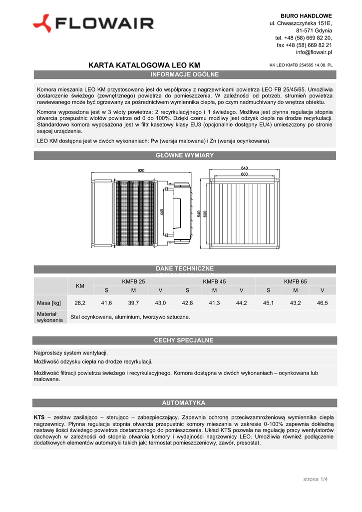 BIURO HANDLOWE ul. Chwaszczyńska 151E, 81-571 Gdynia tel. +48 (58) 669 82 20, fax +48 (58) 669 82 21 [email protected] KARTA KATALOGOWA LEO KM KK LEO KMFB 254565 14.08. PL INFORMACJE OGÓLNE Komora mieszania LEO KM przystosowana jest do współpracy z nagrzewnicami powietrza LEO FB 25/45/65. Umożliwia dostarczenie świeżego (zewnętrznego) powietrza do pomieszczenia. W zależności od potrzeb, strumień powietrza nawiewanego może być ogrzewany za pośrednictwem wymiennika ciepła, po czym nadmuchiwany do wnętrza obiektu. Komora wyposażona jest w 3 wloty powietrza: 2 recyrkulacyjnego i 1 świeżego. Możliwa jest płynna regulacja stopnia otwarcia przepustnic wlotów powietrza od 0 do 100%. Dzięki czemu możliwy jest odzysk ciepła na drodze recyrkulacji. Standardowo komora wyposażona jest w filtr kasetowy klasy EU3 (opcjonalnie dostępny EU4) umieszczony po stronie ssącej urządzenia. LEO KM dostępna jest w dwóch wykonaniach: Pw (wersja malowana) i Zn (wersja ocynkowana). GŁÓWNE WYMIARY DANE TECHNICZNE CECHY SPECJALNE KM Masa [kg] Materiał wykonania 28,2 KMFB 25 KMFB 45 KMFB 65 S M V S M V S M V 41,6 39,7 43,0 42,8 41,3 44,2 45,1 43,2 46,5 Stal ocynkowana, aluminium, tworzywo sztuczne. CECHY SPECJALNE Najprostszy system wentylacji. Możliwość odzysku ciepła na drodze recyrkulacji. Możliwość filtracji powietrza świeżego i recyrkulacyjnego. Komora dostępna w dwóch wykonaniach – ocynkowana lub malowana. AUTOMATYKA KTS – zestaw zasilająco – sterująco – zabezpieczający. Zapewnia ochronę przeciwzamrożeniową wymiennika ciepła nagrzewnicy. Płynna regulacja stopnia otwarcia przepustnic komory mieszania w zakresie 0-100% zapewnia dokładną nastawę ilości świeżego powietrza dostarczanego do pomieszczenia. Układ KTS pozwala na regulację pracy wentylatorów dachowych w zależności od stopnia otwarcia komory i wydajności nagrzewnicy LEO. Umożliwia również podłączenie dodatkowych elementów automatyki takich jak: termostat pomieszczeniowy, zawór, presostat. strona 1/4 ZALECANE ODLEGŁOŚCI MONTAŻOWE TABELE MOCY GRZEWCZYCH LEO KMFB + EU3 W celu uzyskania parametrów pracy urządzeń przy zasilaniu czynnikiem o innych temperaturach niż przedstawione na poniższych stronach, prosimy o kontakt z biurem handlowym. LEO KMFB 25 + EU3 LEO KMFB 45 + EU3 LEO KMFB 65 + EU3 V = 3200m3/h V = 3000m3/h V = 2800m3/h Tw1/Tw2 = 90/70oC Tw1/Tw2 = 90/70oC Tw1/Tw2 = 90/70oC Tp1 PT Qw ∆pw Tp2 Tp1 PT Qw ∆pw Tp2 Tp1 PT Qw ∆pw Tp2 °C kW l/h kPa °C °C kW l/h kPa °C °C kW l/h kPa °C -25 30,0 1322 15,9 -1,5* -25 54,5 2405 23,1 21,0 -25 71,2 3142 35,8 39,0 -22 28,9 1276 14,8 1,0* -22 52,5 2319 21,6 23,0 -22 68,6 3029 33,5 40,0 -20 28,2 1245 14,2 3,0* -20 51,3 2262 20,6 24,0 -20 67,0 2955 32,0 41,0 -15 26,5 1169 12,6 7,0 -15 48,1 2121 18,4 27,0 -15 62,8 2771 28,4 44,0 -10 24,8 1095 11,2 11,0 -10 44,9 1983 16,2 30,0 -10 58,7 2592 25,1 46,0 -5 23,2 1021 9,9 15,0 -5 41,9 1848 14,3 33,0 -5 54,8 2417 22,1 48,0 0 21,5 949 8,6 19,0 0 38,9 1716 12,4 36,0 0 50,9 2246 19,3 50,0 5 19,9 877 7,5 22,5 5 35,9 1586 10,8 39,0 5 47,1 2079 16,8 52,0 10 18,3 807 6,4 26,0 10 33,0 1458 9,2 41,5 10 43,4 1915 14,4 54,0 15 16,7 737 5,4 30,0 15 30,2 1333 7,8 44,0 15 39,8 1755 12,3 56,0 20 15,1 668 4,5 34,0 20 27,4 1209 6,6 47,0 20 36,2 1597 10,4 58,0 *niedozwolone, zbyt niskie temperatury powietrza na wylocie z aparatu V - przepływ powietrza PT - moc grzewcza Tp1 - temperatura powietrza na wlocie do aparatu Tp2 - temperatura powietrza na wylocie z aparatu Tw1 - temperatura wody na zasilaniu wymiennika Tw2 - temperatura wody na powrocie z wymiennika Qw - strumień przepływu wody grzewczej Δpw - spadek ciśnienia wody w wymienniku strona 2/4 TABELE MOCY GRZEWCZYCH LEO KMFB + EU3 LEO KMFB 25 + EU3 LEO KMFB 45 + EU3 3 LEO KMFB 65 + EU3 3 V = 3200m /h V = 2800m3/h V = 3000m /h Tw1/Tw2 = 80/60oC Tw1/Tw2 = 80/60oC Tw1/Tw2 = 80/60oC Tp1 PT Qw ∆pw Tp2 Tp1 PT Qw ∆pw Tp2 Tp1 PT Qw ∆pw Tp2 °C kW l/h kPa °C °C kW l/h kPa °C °C kW l/h kPa °C -25 26,6 1171 13,0 -4,0* -25 48,6 2137 19,1 16,0 -25 63,8 2805 29,8 32,0 -22 25,6 1125 12,1 -2,0* -22 46,7 2053 17,8 18,0 -22 61,3 2695 27,7 33,5 -20 24,9 1095 11,5 0,0* -20 45,5 1997 16,9 19,0 -20 59,7 2622 26,4 35,0 -15 23,2 1021 10,1 4,0* -15 42,3 1860 14,8 22,0 -15 55,6 2443 23,2 37,0 -10 21,6 948 8,8 8,0 -10 39,3 1725 12,9 25,0 -10 51,6 2269 20,2 39,0 -5 19,9 875 7,6 12,0 -5 36,3 1593 11,1 28,0 -5 47,8 2098 17,5 41,0 0 18,3 804 6,5 16,0 0 33,3 1464 9,6 31,0 0 44,0 1931 15,1 43,0 5 16,7 734 5,5 20,0 5 30,4 1336 8,1 33,5 5 40,2 1768 12,8 45,0 10 15,1 665 4,6 23,5 10 27,6 1211 6,8 36,0 10 36,6 1607 10,8 47,0 15 13,6 596 3,8 27,0 15 24,8 1088 5,6 39,0 15 33,0 1450 9,0 49,0 20 12,0 528 3,0 31,0 20 22,0 967 4,5 42,0 20 29,5 1296 7,3 51,0 Tw1/Tw2 = 70/50oC Tw1/Tw2 = 70/50oC Tw1/Tw2 = 70/50oC -25 23,3 1019 10,4 -7,0* -25 42,7 1870 15,4 11,0 -25 56,4 2470 24,3 26,0 -22 22,3 975 9,6 -4,0* -22 40,9 1788 14,2 13,0 -22 54,0 2362 22,4 27,0 -20 21,6 945 9,0 -3,0* -20 39,6 1734 13,4 14,0 -20 52,4 2292 21,2 28,0 -15 19,9 872 7,8 1,0* -15 36,6 1600 11,6 17,0 -15 48,4 2117 18,4 30,0 -10 18,3 800 6,7 5,0* -10 33,6 1468 9,9 20,0 -10 44,5 1947 15,8 32,0 -5 16,7 730 5,6 9,0 -5 30,6 1339 8,4 23,0 -5 40,7 1780 13,4 34,0 0 15,1 659 4,7 13,0 0 27,7 1212 7,0 25,5 0 37,0 1617 11,3 36,5 5 13,5 590 3,8 17,0 5 24,9 1087 5,8 28,0 5 33,3 1457 9,3 38,5 10 11,9 522 3,1 21,0 10 22,1 965 4,6 31,0 10 29,7 1300 7,6 40,0 15 10,4 454 2,4 24,5 15 19,3 844 3,7 34,0 15 26,2 1146 6,1 42,0 20 8,8 387 1,8 28,0 20 16,6 725 2,8 36,0 20 22,7 994 4,7 44,0 *niedozwolone, zbyt niskie temperatury powietrza na wylocie z aparatu V - przepływ powietrza PT - moc grzewcza Tp1 - temperatura powietrza na wlocie do aparatu Tp2 - temperatura powietrza na wylocie z aparatu Tw1 - temperatura wody na zasilaniu wymiennika Tw2 - temperatura wody na powrocie z wymiennika Qw - strumień przepływu wody grzewczej Δpw - spadek ciśnienia wody w wymienniku strona 3/4 TABELE MOCY GRZEWCZYCH LEO KMFB + EU4 LEO KMFB 25