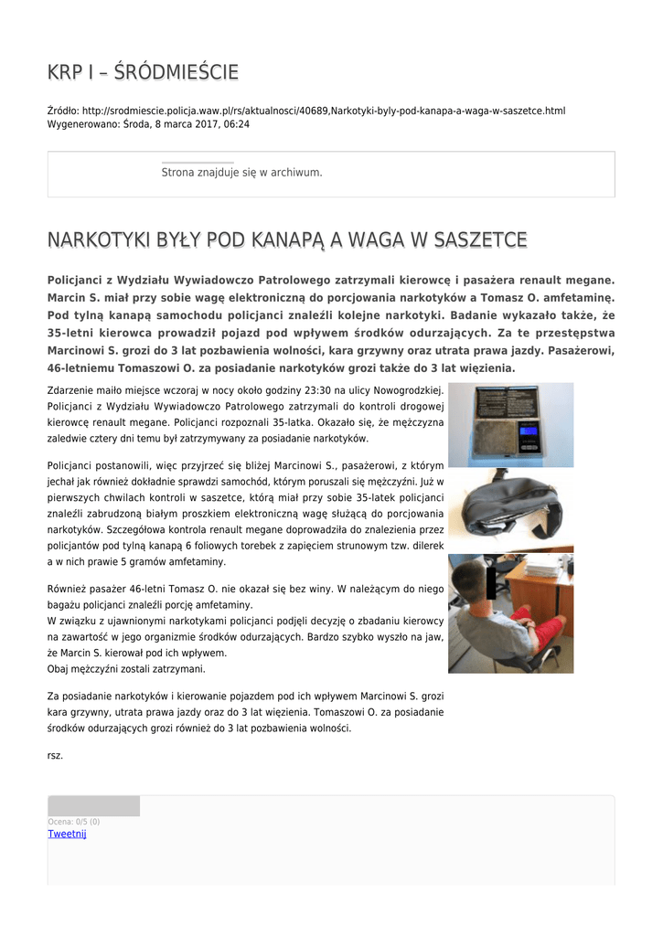 KRP I – ŚRÓDMIEŚCIE Źródło: http://srodmiescie.policja.waw.pl/rs/aktualnosci/40689,Narkotyki-byly-pod-kanapa-a-waga-w-saszetce.html Wygenerowano: Środa, 8 marca 2017, 06:24 Strona znajduje się w archiwum. NARKOTYKI BYŁY POD KANAPĄ A WAGA W SASZETCE Policjanci z Wydziału Wywiadowczo Patrolowego zatrzymali kierowcę i pasażera renault megane. Marcin S. miał przy sobie wagę elektroniczną do porcjowania narkotyków a Tomasz O. amfetaminę. Pod tylną kanapą samochodu policjanci znaleźli kolejne narkotyki. Badanie wykazało także, że 35-letni kierowca prowadził pojazd pod wpływem środków odurzających. Za te przestępstwa Marcinowi S. grozi do 3 lat pozbawienia wolności, kara grzywny oraz utrata prawa jazdy. Pasażerowi, 46-letniemu Tomaszowi O. za posiadanie narkotyków grozi także do 3 lat więzienia. Zdarzenie maiło miejsce wczoraj w nocy około godziny 23:30 na ulicy Nowogrodzkiej. Policjanci z Wydziału Wywiadowczo Patrolowego zatrzymali do kontroli drogowej kierowcę renault megane. Policjanci rozpoznali 35-latka. Okazało się, że mężczyzna zaledwie cztery dni temu był zatrzymywany za posiadanie narkotyków. Policjanci postanowili, więc przyjrzeć się bliżej Marcinowi S., pasażerowi, z którym jechał jak również dokładnie sprawdzi samochód, którym poruszali się mężczyźni. Już w pierwszych chwilach kontroli w saszetce, którą miał przy sobie 35-latek policjanci znaleźli zabrudzoną białym proszkiem elektroniczną wagę służącą do porcjowania narkotyków. Szczegółowa kontrola renault megane doprowadziła do znalezienia przez policjantów pod tylną kanapą 6 foliowych torebek z zapięciem strunowym tzw. dilerek a w nich prawie 5 gramów amfetaminy. Również pasażer 46-letni Tomasz O. nie okazał się bez winy. W należącym do niego bagażu policjanci znaleźli porcję amfetaminy. W związku z ujawnionymi narkotykami policjanci podjęli decyzję o zbadaniu kierowcy na zawartość w jego organizmie środków odurzających. Bardzo szybko wyszło na jaw, że Marcin S. kierował pod ich wpływem. Obaj mężczyźni zostali zatrzymani. Za posiadanie narkotyków i kierowanie pojazdem pod ich wpływem Marcinowi S. grozi kara grzywny, utrata prawa jazdy oraz do 3 lat więzienia. Tomaszowi O. za posiadanie środków odurzających grozi również do 3 lat pozbawienia wolności. rsz. Ocena: 0/5 (0) Tweetnij