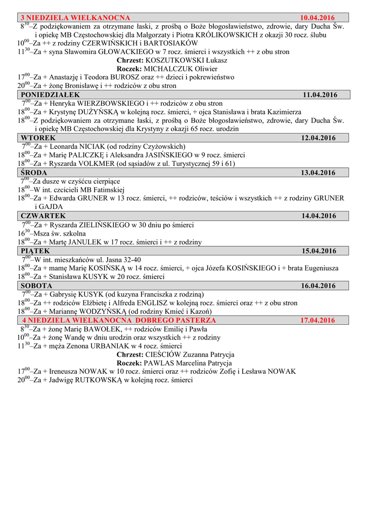 3 NIEDZIELA WIELKANOCNA 10.04.2016 830–Z podziękowaniem za otrzymane łaski, z prośbą o Boże błogosławieństwo, zdrowie, dary Ducha Św. i opiekę MB Częstochowskiej dla Małgorzaty i Piotra KRÓLIKOWSKICH z okazji 30 rocz. ślubu 1000–Za ++ z rodziny CZERWIŃSKICH i BARTOSIAKÓW 1130–Za + syna Sławomira GŁOWACKIEGO w 7 rocz. śmierci i wszystkich ++ z obu stron Chrzest: KOSZUTKOWSKI Łukasz Roczek: MICHALCZUK Oliwier 1700–Za + Anastazję i Teodora BUROSZ oraz ++ dzieci i pokrewieństwo 2000–Za + żonę Bronisławę i ++ rodziców z obu stron PONIEDZIAŁEK 11.04.2016 00 7 –Za + Henryka WIERZBOWSKIEGO i ++ rodziców z obu stron 1800–Za + Krystynę DUŻYŃSKĄ w kolejną rocz. śmierci, + ojca Stanisława i brata Kazimierza 1800–Z podziękowaniem za otrzymane łaski, z prośbą o Boże błogosławieństwo, zdrowie, dary Ducha Św. i opiekę MB Częstochowskiej dla Krystyny z okazji 65 rocz. urodzin WTOREK 12.04.2016 700–Za + Leonarda NICIAK (od rodziny Czyżowskich) 1800–Za + Marię PALICZKĘ i Aleksandra JASIŃSKIEGO w 9 rocz. śmierci 1800–Za + Ryszarda VOLKMER (od sąsiadów z ul. Turystycznej 59 i 61) ŚRODA 13.04.2016 700–Za dusze w czyśćcu cierpiące 1800–W int. czcicieli MB Fatimskiej 1800–Za + Edwarda GRUNER w 13 rocz. śmierci, ++ rodziców, teściów i wszystkich ++ z rodziny GRUNER i GAJDA CZWARTEK 14.04.2016 00 7 –Za + Ryszarda ZIELIŃSKIEGO w 30 dniu po śmierci 1630–Msza św. szkolna 1800–Za + Martę JANULEK w 17 rocz. śmierci i ++ z rodziny PIĄTEK 15.04.2016 700–W int. mieszkańców ul. Jasna 32-40 1800–Za + mamę Marię KOSIŃSKĄ w 14 rocz. śmierci, + ojca Józefa KOSIŃSKIEGO i + brata Eugeniusza 1800–Za + Stanisława KUSYK w 20 rocz. śmierci SOBOTA 16.04.2016 700–Za + Gabrysię KUSYK (od kuzyna Franciszka z rodziną) 1800–Za ++ rodziców Elżbietę i Alfreda ENGLISZ w kolejną rocz. śmierci oraz ++ z obu stron 1800–Za + Mariannę WODZYŃSKĄ (od rodziny Kmieć i Kazoń) 4 NIEDZIELA WIELKANOCNA DOBREGO PASTERZA 17.04.2016 830–Za + żonę Marię BAWOŁEK, ++ rodziców Emilię i Pawła 1000–Za + żonę Wandę w dniu urodzin oraz wszystkich ++ z rodziny 1130–Za + męża Zenona URBANIAK w 4 rocz. śmierci Chrzest: CIEŚCIÓW Zuzanna Patrycja Roczek: PAWLAS Marcelina Patrycja 00 17 –Za + Ireneusza NOWAK w 10 rocz. śmierci oraz ++ rodziców Zofię i Lesława NOWAK 2000–Za + Jadwigę RUTKOWSKĄ w kolejną rocz. śmierci