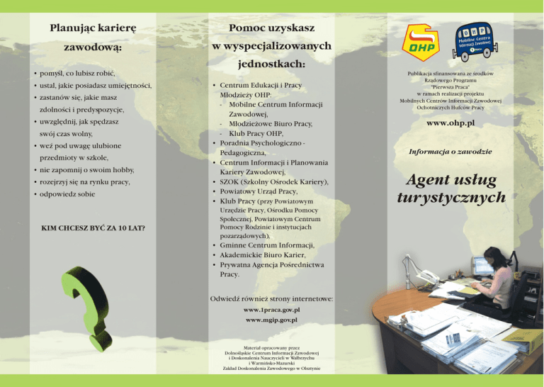 Planuj¹c karierê Pomoc uzyskasz zawodow¹: w wyspecjalizowanych jednostkach: • pomyœl, co lubisz robiæ, • ustal, jakie posiadasz umiejêtnoœci, • zastanów siê, jakie masz zdolnoœci i predyspozycje, • uwzglêdnij, jak spêdzasz swój czas wolny, • weŸ pod uwagê ulubione przedmioty w szkole, • nie zapomnij o swoim hobby, • rozejrzyj siê na rynku pracy, • odpowiedz sobie KIM CHCESZ BYÆ ZA 10 LAT? • Centrum Edukacji i Pracy M³odzie¿y OHP: - Mobilne Centrum Informacji Zawodowej, - M³odzie¿owe Biuro Pracy, - Klub Pracy OHP, • Poradnia Psychologiczno Pedagogiczna, • Centrum Informacji i Planowania Kariery Zawodowej, • SZOK (Szkolny Oœrodek Kariery), • Powiatowy Urz¹d Pracy, • Klub Pracy (przy Powiatowym Urzêdzie Pracy, Oœrodku Pomocy Spo³ecznej, Powiatowym Centrum Pomocy Rodzinie i instytucjach pozarz¹dowych), • Gminne Centrum Informacji, • Akademickie Biuro Karier, • Prywatna Agencja Poœrednictwa Pracy. OdwiedŸ równie¿ strony internetowe: www.1praca.gov.pl www.mgip.gov.pl Materia³ opracowany przez Dolnoœl¹skie Centrum Informacji Zawodowej i Doskonalenia Nauczycieli w Wa³brzychu i Warmiñsko-Mazurski Zak³ad Doskonalenia Zawodowego w Olsztynie Publikacja sfinansowana ze œrodków Rz¹dowego Programu "Pierwsza Praca" w ramach realizacji projektu Mobilnych Centrów Informacji Zawodowej Ochotniczych Hufców Pracy www.ohp.pl Informacja o zawodzie Agent us³ug turystycznych Funkcje i zadania: Predyspozycje do zawodu: • Ustala, koordynuje i nadzoruje realizacjê handlowych i eksploatacyjnych zasad obs³ugi turystycznej, w celu uzyskania maksymalnych efektów finansowych i spo³ecznych firmy, któr¹ reprezentuje; • Praca agenta us³ug turystycznych wymaga kontaktu z ludŸmi, dlatego wa¿ne s¹ jego warunki psychofizyczne. Nale¿¹ do nich: szerokie zainteresowania, cechy intelektualne, uzdolnienia i wiedza, w³aœciwa samoocena; • Bada popyt oraz kreuje poda¿ us³ug turystycznych dla klientów krajowych i zagranicznych; • Analizuje rynek turystyczny i zgodnie z prognozami przekazuje do sprzeda¿y imprezy turystyczne i paraturystyczne; • Zbiera i selekcjonuje oferty us³ugodawców, kieruj¹c je nastêpnie na rynek; • Promuje ró¿ne formy us³ug turystycznych, przygotowuje umowy i kontrakty; • Zleca nadzór nad realizacj¹ imprez pilotom, przewodnikom lub przedstawicielom organizatora; • Zbiera informacje o dostêpnoœci, kosztach, ró¿nych typach transportu i zakwaterowania. • Codziennym elementem jest praca "w œwiecie liczb" i ³¹czy siê z pobieraniem nale¿noœci za us³ugi oraz z przeprowadzaniem kalkulacji; • Wymagany jest dobry stan zdrowia; • Wa¿nym elementem jest praca z komputerem - z edytorami tekstu oraz programami kalkulacyjnymi i ksiêgowymi; • Korzystna jest znajomoœæ podstaw rachunkowoœci, rachunku ekonomicznego, analizy kosztów; • Musi wykazywaæ siê wysok¹ kultur¹ osobist¹ i umiejêtnoœciami w prowadzeniu negocjacji, w przekazywaniu informacji o ofercie turystycznej. Wiêcej szczegó³ów znajdziesz w teczce informacji o zawodzie Mo¿liwoœci zdobycia zawodu: • agentem us³ug turystycznych mo¿e zostaæ osoba z wykszta³ceniem œrednim lub wy¿szym; • do wykonywania zawodu przygotowuj¹ szko³y policealne oraz wy¿sze uczelnie; • mile widziane s¹ ukoñczone kursy specjalistyczne (pilot wycieczek, przewodnik turystyczny, kasjer walutowy, operator rezerwacji walutowych na linie lotnicze, itp.); • niezbêdna w zawodzie jest znajomoœæ jêzyków obcych (angielski, niemiecki, francuski).