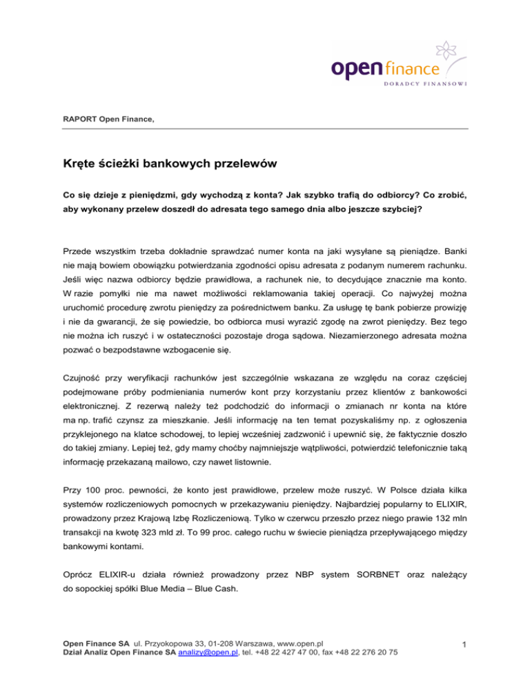 RAPORT Open Finance, Kręte ścieżki bankowych przelewów Co się dzieje z pieniędzmi, gdy wychodzą z konta? Jak szybko trafią do odbiorcy? Co zrobić, aby wykonany przelew doszedł do adresata tego samego dnia albo jeszcze szybciej? Przede wszystkim trzeba dokładnie sprawdzać numer konta na jaki wysyłane są pieniądze. Banki nie mają bowiem obowiązku potwierdzania zgodności opisu adresata z podanym numerem rachunku. Jeśli więc nazwa odbiorcy będzie prawidłowa, a rachunek nie, to decydujące znacznie ma konto. W razie pomyłki nie ma nawet możliwości reklamowania takiej operacji. Co najwyżej można uruchomić procedurę zwrotu pieniędzy za pośrednictwem banku. Za usługę tę bank pobierze prowizję i nie da gwarancji, że się powiedzie, bo odbiorca musi wyrazić zgodę na zwrot pieniędzy. Bez tego nie można ich ruszyć i w ostateczności pozostaje droga sądowa. Niezamierzonego adresata można pozwać o bezpodstawne wzbogacenie się. Czujność przy weryfikacji rachunków jest szczególnie wskazana ze względu na coraz częściej podejmowane próby podmieniania numerów kont przy korzystaniu przez klientów z bankowości elektronicznej. Z rezerwą należy też podchodzić do informacji o zmianach nr konta na które ma np. trafić czynsz za mieszkanie. Jeśli informację na ten temat pozyskaliśmy np. z ogłoszenia przyklejonego na klatce schodowej, to lepiej wcześniej zadzwonić i upewnić się, że faktycznie doszło do takiej zmiany. Lepiej też, gdy mamy choćby najmniejszje wątpliwości, potwierdzić telefonicznie taką informację przekazaną mailowo, czy nawet listownie. Przy 100 proc. pewności, że konto jest prawidłowe, przelew może ruszyć. W Polsce działa kilka systemów rozliczeniowych pomocnych w przekazywaniu pieniędzy. Najbardziej popularny to ELIXIR, prowadzony przez Krajową Izbę Rozliczeniową. Tylko w czerwcu przeszło przez niego prawie 132 mln transakcji na kwotę 323 mld zł. To 99 proc. całego ruchu w świecie pieniądza przepływającego między bankowymi kontami. Oprócz ELIXIR-u działa również prowadzony przez NBP system SORBNET oraz należący do sopockiej spółki Blue Media – Blue Cash. Open Finance SA ul. Przyokopowa 33, 01-208 Warszawa, www.open.pl Dział Analiz Open Finance SA [email protected], tel. +48 22 427 47 00, fax +48 22 276 20 75 1 Trzy szanse w każdym dniu roboczym W ELIXIRZE w każdy dzień roboczy odbywają się trzy sesje rozliczeniowe, podczas których za pośrednictwem KIR banki „wymieniają się” informacjami o przelewach swoich klientów. Godziny sesji są stałe jest to: 9:30, 13.30 oraz 16.00. Sesje rozliczeniowe – harmonogram standardowy Źródło: KIR. Generalnie, jeśli zlecimy przelew rano, mieszcząc się w określonym czasie, to powinien on znaleźć się na koncie docelowym najpóźniej tego samego dnia po południu. Trzeba jednak pamiętać, że konkretny moment przekazania zleceń klientów do realizacji wyznaczają banki. Dlatego też, nie zawsze przelew zlecony o godzinie 9:00 trafi na pierwszą sesję, która zamyka się o godz. 9.30. Informacja o tym, kiedy bank skieruje nasz przelew do realizacji, jest zazwyczaj dostępna na jego stronie internetowej w regulaminie lub na infolinii. W wielu bankach wcale nie jest to jednak łatwo ustalić. Z pomocą idą liczne niezależne strony internetowe, ale zawsze znajduje się tam zastrzeżenie, że publikowane dane mogą być nieaktualne. A reguły są różne. Jak wyjaśnia np. Alior Bank, aby przelew z tego banku został wysłany na I sesję KIR, należy go zlecić do godz. 8:20, na II sesję do godz. 12:20, a na III sesję do godz. 15:10. Są też instytucje, które wymagają złożenia zlecenia na pierwszą sesję do godz. 6.00 rano. W takim przypadku klient, który chce aby odbiorca otrzymał pieniądze około godz. 12 danego dnia, musi go wykonać przed godz. 6.00 albo dzień wcześniej. Skąd te różnice? Przelew po złożeniu rusza w proces przetwarzania. Zaczyna się od jego weryfikacji, poprzez zaksięgowanie i na końcu dołączenie do paczki przelewów wyczekujących do wysłania do KIR. Open Finance SA ul. Przyokopowa 33, 01-208 Warszawa, www.open.pl Dział Analiz Open Finance SA [email protected], tel. +48 22 427 47 00, fax +48 22 276 20 75 2 Banki się spieszą, bo im wcześniej przed sesją rozliczeniową przekażą dane do ELIXIR-u, tym mniej za to zapłacą. Najtaniej jest na co najmniej 2 godz. przed sesją, drożej na 1 godz. przed, a najwyższą stawkę trzeba zapłacić za dane dostarczone na pół godziny przed sesją. KIR za pracę w krótszym czasie pobiera wyższą prowizję. W dwie godziny banki ustalają ile są sobie winne Do KIR i przez KIR nie wędrują jednak pieniądze, a jedynie informacje o zleconych przelewach czy poleceniach zapłaty. Sesja ELIXIR określa ostatecznie ile banki są sobie nawzajem winne, po uwzględnieniu kwot przelewanych przez ich klientów. Po tym, gdy klient banku A przeleje do banku B 500 zł, a klient banku B przelewa do banku A 200 zł, do rozliczenia między bankami pozostaje jedynie 300 zł. Po ustaleniu takich informacji KIR przekazuje je do Narodowego Banku Polskiego i wtedy ostatecznie banki dowiadują się ile pieniędzy powinny sobie wzajemnie przekazać. Od startu sesji do ustalenia wzajemnych zobowiązań mija od 1 do 2 godzin. Następnie, gdy KIR potwierdzi dokonanie rozrachunku przez NBP, zaczyna się przkazywanie pieniędzy na konta odbiorców. W celu uniknięcia pomyłki w przekazywanych sumach, kwoty w przelewach wyrażane są w groszach. Przy takim modelu nie ma ryzyka pomyłki z powodu przesunięcia przecinka. Podobnie dzieje się w innych krajach – mówi Tomasz Jończyk, dyrektor linii biznesowej rozliczenia w Krajowej Izbie Rozliczeniowej Bank odbiorcy też decyduje kiedy przyjdzie przelew A kiedy odbiorca zobaczy pieniądze na swoim koncie? Zależy nie tylko od godziny nadania, ale też od sesji przychodzących ELIXIR-u w jego banku. Banki indywidualnie wyznac