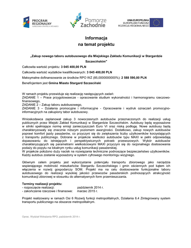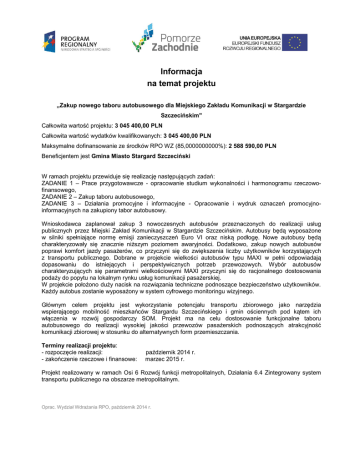 Informacja na temat projektu „Zakup nowego taboru autobusowego dla Miejskiego Zakładu Komunikacji w Stargardzie Szczecińskim" Całkowita wartość projektu: 3 045 400,00 PLN Całkowita wartość wydatków kwalifikowanych: 3 045 400,00 PLN Maksymalne dofinansowanie ze środków RPO WZ (85,0000000000%): 2 588 590,00 PLN Beneficjentem jest Gmina Miasto Stargard Szczeciński W ramach projektu przewiduje się realizację następujących zadań: ZADANIE 1 – Prace przygotowawcze - opracowanie studium wykonalności i harmonogramu rzeczowofinansowego, ZADANIE 2 – Zakup taboru autobusowego, ZADANIE 3 – Działania promocyjne i informacyjne - Opracowanie i wydruk oznaczeń promocyjnoinformacyjnych na zakupiony tabor autobusowy. Wnioskodawca zaplanował zakup 3 nowoczesnych autobusów przeznaczonych do realizacji usług publicznych przez Miejski Zakład Komunikacji w Stargardzie Szczecińskim. Autobusy będą wyposażone w silniki spełniające normę emisji zanieczyszczeń Euro VI oraz niską podłogę. Nowe autobusy będą charakteryzowały się znacznie niższym poziomem awaryjności. Dodatkowo, zakup nowych autobusów poprawi komfort jazdy pasażerów, co przyczyni się do zwiększenia liczby użytkowników korzystających z transportu publicznego. Dobrane w projekcie wielkości autobusów typu MAXI w pełni odpowiadają dopasowaniu do istniejących i perspektywicznych potrzeb przewozowych. Wybór autobusów charakteryzujących się parametrami wielkościowymi MAXI przyczyni się do racjonalnego dostosowania podaży do popytu na lokalnym rynku usług komunikacji pasażerskiej. W projekcie położono duży nacisk na rozwiązania techniczne podnoszące bezpieczeństwo użytkowników. Każdy autobus zostanie wyposażony w system cyfrowego monitoringu wizyjnego. Głównym celem projektu jest wykorzystanie potencjału transportu zbiorowego jako narzędzia wspierającego mobilność mieszkańców Stargardu Szczecińskiego i gmin ościennych pod kątem ich włączenia w rozwój gospodarczy SOM. Projekt ma na celu dostosowanie funkcjonalne taboru autobusowego do realizacji wysokiej jakości przewozów pasażerskich podnoszących atrakcyjność komunikacji zbiorowej w stosunku do alternatywnych form przemieszczania. Terminy realizacji projektu: - rozpoczęcie realizacji: - zakończenie rzeczowe i finansowe: październik 2014 r. marzec 2015 r. Projekt realizowany w ramach Osi 6 Rozwój funkcji metropolitalnych, Działania 6.4 Zintegrowany system transportu publicznego na obszarze metropolitalnym. Oprac. Wydział Wdrażania RPO, październik 2014 r.