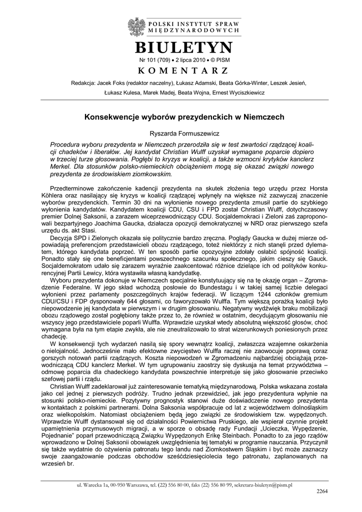 BIULETYN Nr 101 (709) 2 lipca 2010 © PISM K O M E N T A R Z Redakcja: Jacek Foks (redaktor naczelny), Łukasz Adamski, Beata Górka-Winter, Leszek Jesień, Łukasz Kulesa, Marek Madej, Beata Wojna, Ernest Wyciszkiewicz Konsekwencje wyborów prezydenckich w Niemczech Ryszarda Formuszewicz Procedura wyboru prezydenta w Niemczech przerodziła się w test zwartości rządzącej koalicji chadeków i liberałów. Jej kandydat Christian Wulff uzyskał wymagane poparcie dopiero w trzeciej turze głosowania. Pogłębi to kryzys w koalicji, a także wzmocni krytyków kanclerz Merkel. Dla stosunków polsko-niemieckich obciążeniem mogą się okazać związki nowego prezydenta ze środowiskiem ziomkowskim. Przedterminowe zakończenie kadencji prezydenta na skutek złożenia tego urzędu przez Horsta Köhlera oraz nasilający się kryzys w koalicji rządzącej wpłynęły na większe niż zazwyczaj znaczenie wyborów prezydenckich. Termin 30 dni na wyłonienie nowego prezydenta zmusił partie do szybkiego wyłonienia kandydatów. Kandydatem koalicji CDU, CSU i FPD został Christian Wulff, dotychczasowy premier Dolnej Saksonii, a zarazem wiceprzewodniczący CDU. Socjaldemokraci i Zieloni zaś zaproponowali bezpartyjnego Joachima Gaucka, działacza opozycji demokratycznej w NRD oraz pierwszego szefa urzędu ds. akt Stasi. Decyzja SPD i Zielonych okazała się politycznie bardzo zręczna. Poglądy Gaucka w dużej mierze odpowiadają preferencjom przedstawicieli obozu rządzącego, toteż niektórzy z nich stanęli przed dylematem, którego kandydata poprzeć. W ten sposób partie opozycyjne zdołały osłabić spójność koalicji. Ponadto stały się one beneficjentami powszechnego szacunku społecznego, jakim cieszy się Gauck. Socjaldemokratom udało się zarazem wyraźnie zaakcentować różnice dzielące ich od polityków konkurencyjnej Partii Lewicy, która wystawiła własną kandydatkę. Wyboru prezydenta dokonuje w Niemczech specjalnie konstytuujący się na tę okazję organ – Zgromadzenie Federalne. W jego skład wchodzą posłowie do Bundestagu i w takiej samej liczbie delegaci wyłonieni przez parlamenty poszczególnych krajów federacji. W liczącym 1244 członków gremium CDU/CSU i FDP dysponowały 644 głosami, co faworyzowało Wulffa. Tym większą porażką koalicji było niepowodzenie jej kandydata w pierwszym i w drugim głosowaniu. Negatywny wydźwięk braku mobilizacji obozu rządowego został pogłębiony także przez to, że również w ostatnim, decydującym głosowaniu nie wszyscy jego przedstawiciele poparli Wulffa. Wprawdzie uzyskał wtedy absolutną większość głosów, choć wymagana była na tym etapie zwykła, ale nie zneutralizowało to strat wizerunkowych poniesionych przez chadecję. W konsekwencji tych wydarzeń nasilą się spory wewnątrz koalicji, zwłaszcza wzajemne oskarżenia o nielojalność. Jednocześnie mało efektowne zwycięstwo Wulffa raczej nie zaowocuje poprawą coraz gorszych notowań partii rządzących. Koszta niepowodzeń w Zgromadzeniu najbardziej obciążają przewodniczącą CDU kanclerz Merkel. W tym ugrupowaniu zaostrzy się dyskusja na temat przywództwa – odmowę poparcia dla chadeckiego kandydata powszechnie interpretuje się jako głosowanie przeciwko szefowej partii i rządu. Christian Wulff zadeklarował już zainteresowanie tematyką międzynarodową. Polska wskazana została jako cel jednej z pierwszych podróży. Trudno jednak przewidzieć, jak jego prezydentura wpłynie na stosunki polsko-niemieckie. Pozytywny prognostyk stanowi duże doświadczenie nowego prezydenta w kontaktach z polskimi partnerami. Dolna Saksonia współpracuje od lat z województwem dolnośląskim oraz wielkopolskim. Natomiast obciążeniem będą jego związki ze środowiskiem tzw. wypędzonych. Wprawdzie Wulff dystansował się od działalności Powiernictwa Pruskiego, ale wspierał czynnie projekt upamiętnienia przymusowych migracji, a w sporze o obsadę rady Fundacji „Ucieczka, Wypędzenie, Pojednanie” poparł przewodniczącą Związku Wypędzonych Erikę Steinbach. Ponadto to za jego rządów wprowadzono w Dolnej Saksonii obowiązek uwzględnienia tej tematyki w programie nauczania. Przyczynił się także wydatnie do ożywienia patronatu tego landu nad Ziomkostwem Śląskim i być może zaznaczy swoje zaangażowanie podczas obchodów sześćdziesięciolecia tego patronatu, zaplanowanych na wrzesień br. ul. Warecka 1a, 00-950 Warszawa, tel. (22) 556 80 00, faks (22) 556 80 99, [email protected] 2264