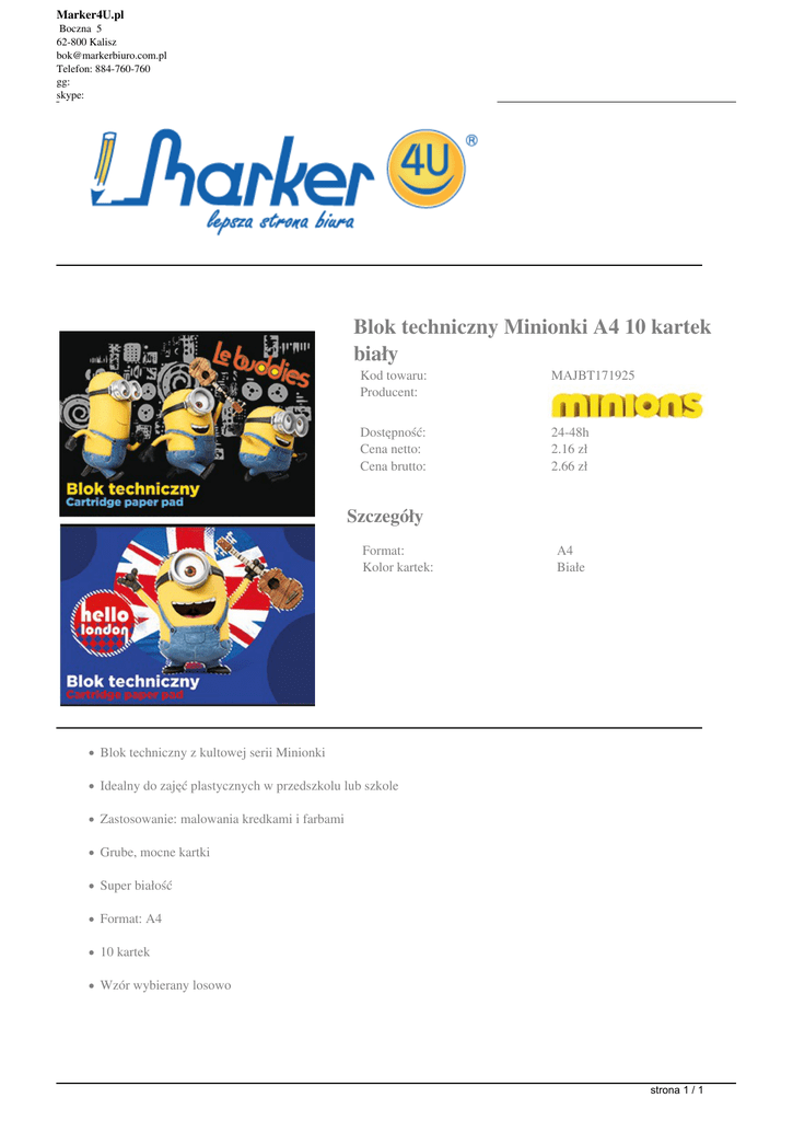 Marker4U.pl Boczna 5 62-800 Kalisz [email protected] Telefon: 884-760-760 gg: skype: Blok techniczny Minionki A4 10 kartek biały Kod towaru: Producent: MAJBT171925 Dostępność: Cena netto: Cena brutto: 24-48h 2.16 zł 2.66 zł Szczegóły Format: Kolor kartek: A4 Białe Blok techniczny z kultowej serii Minionki Idealny do zajęć plastycznych w przedszkolu lub szkole Zastosowanie: malowania kredkami i farbami Grube, mocne kartki Super białość Format: A4 10 kartek Wzór wybierany losowo strona 1 / 1 Powered by TCPDF (www.tcpdf.org)