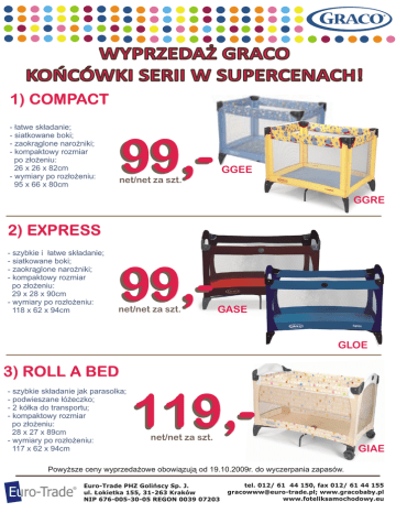 WYPRZEDAŻ GRACO KOŃCÓWKI SERII W SUPERCENACH! 1) COMPACT - łatwe składanie; - siatkowane boki; - zaokrąglone narożniki; - kompaktowy rozmiar po złożeniu: 26 x 26 x 82cm - wymiary po rozłożeniu: 95 x 66 x 80cm 99,- GGEE net/net za szt. GGRE 2) EXPRESS - szybkie i łatwe składanie; - siatkowane boki; - zaokrąglone narożniki; - kompaktowy rozmiar po złożeniu: 29 x 28 x 90cm - wymiary po rozłożeniu: 118 x 62 x 94cm 99,net/net za szt. GASE GLOE 3) ROLL A BED - szybkie składanie jak parasolka; - podwieszane łóżeczko; - 2 kółka do transportu; - kompaktowy rozmiar po złożeniu: 28 x 27 x 89cm - wymiary po rozłożeniu: 117 x 62 x 94cm 119,net/net za szt. GIAE Powyższe ceny wyprzedażowe obowiązują od 19.10.2009r. do wyczerpania zapasów. Euro-Trade PHZ Golińscy Sp. J. ul. Łokietka 155, 31-263 Kraków NIP 676-005-30-05 REGON 0039 07203 tel. 012/ 61 44 150, fax 012/ 61 44 155 [email protected]; www.gracobaby.pl www.foteliksamochodowy.eu