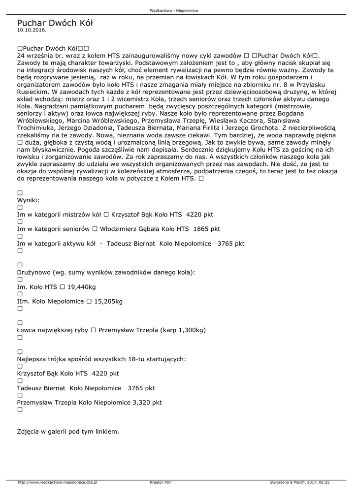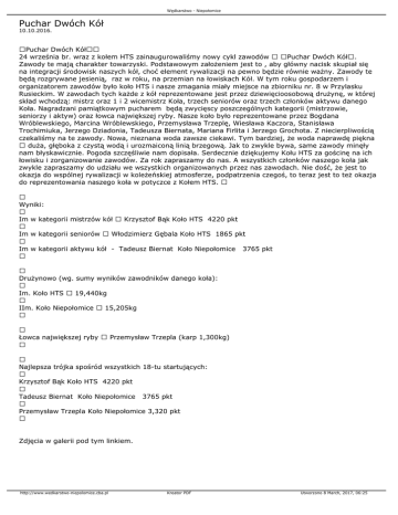 Wędkarstwo - Niepołomice Puchar Dwóch Kół 10.10.2016. Puchar Dwóch Kół 24 września br. wraz z kołem HTS zainaugurowaliśmy nowy cykl zawodów Puchar Dwóch Kół. Zawody te mają charakter towarzyski. Podstawowym założeniem jest to , aby główny nacisk skupiał się na integracji środowisk naszych kół, choć element rywalizacji na pewno będzie równie ważny. Zawody te będą rozgrywane jesienią, raz w roku, na przemian na łowiskach Kół. W tym roku gospodarzem i organizatorem zawodów było koło HTS i nasze zmagania miały miejsce na zbiorniku nr. 8 w Przylasku Rusieckim. W zawodach tych każde z kół reprezentowane jest przez dziewięcioosobową drużynę, w której skład wchodzą: mistrz oraz 1 i 2 wicemistrz Koła, trzech seniorów oraz trzech członków aktywu danego Koła. Nagradzani pamiątkowym pucharem będą zwycięscy poszczególnych kategorii (mistrzowie, seniorzy i aktyw) oraz łowca największej ryby. Nasze koło było reprezentowane przez Bogdana Wróblewskiego, Marcina Wróblewskiego, Przemysława Trzeplę, Wiesława Kaczora, Stanisława Trochimiuka, Jerzego Dziadonia, Tadeusza Biernata, Mariana Firlita i Jerzego Grochota. Z niecierpliwością czekaliśmy na te zawody. Nowa, nieznana woda zawsze ciekawi. Tym bardziej, że woda naprawdę piękna duża, głęboka z czystą wodą i urozmaiconą linią brzegową. Jak to zwykle bywa, same zawody minęły nam błyskawicznie. Pogoda szczęśliwie nam dopisała. Serdecznie dziękujemy Kołu HTS za gościnę na ich łowisku i zorganizowanie zawodów. Za rok zapraszamy do nas. A wszystkich członków naszego koła jak zwykle zapraszamy do udziału we wszystkich organizowanych przez nas zawodach. Nie dość, że jest to okazja do wspólnej rywalizacji w koleżeńskiej atmosferze, podpatrzenia czegoś, to teraz jest to też okazja do reprezentowania naszego koła w potyczce z Kołem HTS. Wyniki: Im w kategorii mistrzów kół Krzysztof Bąk Koło HTS 4220 pkt Im w kategorii seniorów Włodzimierz Gębala Koło HTS 1865 pkt Im w kategorii aktywu kół - Tadeusz Biernat Koło Niepołomice 3765 pkt Drużynowo (wg. sumy wyników zawodników danego koła): Im. Koło HTS 19,440kg IIm. Koło Niepołomice 15,205kg Łowca największej ryby Przemysław Trzepla (karp 1,300kg) Najlepsza trójka spośród wszystkich 18-tu startujących: Krzysztof Bąk Koło HTS 4220 pkt Tadeusz Biernat Koło Niepołomice 3765 pkt Przemysław Trzepla Koło Niepołomice 3,320 pkt Zdjęcia w galerii pod tym linkiem. http://www.wedkarstwo-niepolomice.cba.pl Kreator PDF Utworzono 8 March, 2017, 06:25