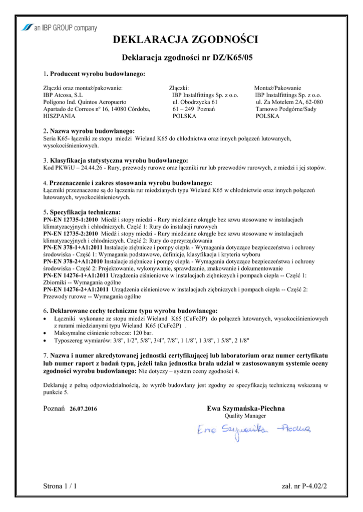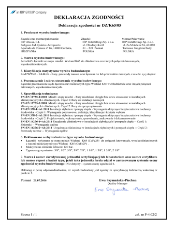 DEKLARACJA ZGODNOŚCI Deklaracja zgodności nr DZ/K65/05 1. Producent wyrobu budowlanego: Złączki oraz montaż/pakowanie: IBP Atcosa, S.L Polígono Ind. Quintos Aeropuerto Apartado de Correos nº 16, 14080 Córdoba, HISZPANIA Złączki: IBP Instalfittings Sp. z o.o. ul. Obodrzycka 61 61 – 249 Poznań POLSKA Montaż/Pakowanie IBP Instalfittings Sp. z o.o. ul. Za Motelem 2A, 62-080 Tarnowo Podgórne/Sady POLSKA 2. Nazwa wyrobu budowlanego: Seria K65- łączniki ze stopu miedzi Wieland K65 do chłodnictwa oraz innych połączeń lutowanych, wysokociśnieniowych. 3. Klasyfikacja statystyczna wyrobu budowlanego: Kod PKWiU – 24.44.26 - Rury, przewody rurowe oraz łączniki rur lub przewodów rurowych, z miedzi i jej stopów. 4. Przeznaczenie i zakres stosowania wyrobu budowlanego: Łączniki przeznaczone są do łączenia rur miedzianych typu Wieland K65 w chłodnictwie oraz innych połączeń lutowanych, wysokociśnieniowych. 5. Specyfikacja techniczna: PN-EN 12735-1:2010 Miedź i stopy miedzi - Rury miedziane okrągłe bez szwu stosowane w instalacjach klimatyzacyjnych i chłodniczych. Część 1: Rury do instalacji rurowych PN-EN 12735-2:2010 Miedź i stopy miedzi - Rury miedziane okrągłe bez szwu stosowane w instalacjach klimatyzacyjnych i chłodniczych. Część 2: Rury do oprzyrządowania PN-EN 378-1+A1:2011 Instalacje ziębnicze i pompy ciepła - Wymagania dotyczące bezpieczeństwa i ochrony środowiska - Część 1: Wymagania podstawowe, definicje, klasyfikacja i kryteria wyboru PN-EN 378-2+A1:2010 Instalacje ziębnicze i pompy ciepła - Wymagania dotyczące bezpieczeństwa i ochrony środowiska - Część 2: Projektowanie, wykonywanie, sprawdzanie, znakowanie i dokumentowanie PN-EN 14276-1+A1:2011 Urządzenia ciśnieniowe w instalacjach ziębniczych i pompach ciepła -- Część 1: Zbiorniki -- Wymagania ogólne PN-EN 14276-2+A1:2011 Urządzenia ciśnieniowe w instalacjach ziębniczych i pompach ciepła -- Część 2: Przewody rurowe -- Wymagania ogólne 6. Deklarowane cechy techniczne typu wyrobu budowlanego: Łączniki wykonane ze stopu miedzi Wieland K65 (CuFe2P) do połączeń lutowanych, wysokociśnieniowych z rurami miedzianymi typu Wieland K65 (CuFe2P) . Maksymalne ciśnienie robocze: 120 bar. Typoszereg wymiarów: 3/8", 1/2", 5/8”, 3/4”, 7/8”, 1 1/8”, 1 3/8", 1 5/8", 2 1/8" 7. Nazwa i numer akredytowanej jednostki certyfikującej lub laboratorium oraz numer certyfikatu lub numer raport z badań typu, jeżeli taka jednostka brała udział w zastosowanym systemie oceny zgodności wyrobu budowlanego: Nie dotyczy – system oceny zgodności 4. Deklaruję z pełną odpowiedzialnością, że wyrób budowlany jest zgodny ze specyfikacją techniczną wskazaną w punkcie 5. Poznań 26.07.2016 Ewa Szymańska-Piechna Quality Manager Strona 1 / 1 zał. nr P-4.02/2