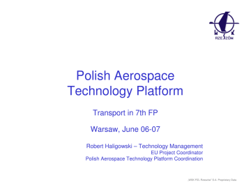 Polish Aerospace Technology Platform Transport in 7th FP Warsaw, June 06-07 Robert Haligowski – Technology Management EU Project Coordinator Polish Aerospace Technology Platform Coordination „WSK PZL Rzeszów” S.A. Proprietary Data Innovation in aero sector „WSK PZL Rzeszów” S.A. Proprietary Data Innovation in aero sector „WSK PZL Rzeszów” S.A. Proprietary Data Targets vs. solutions Power plant Loads & Flow Control New Aircraft Configurations Low weight Aircraft Energy Management Mission & Trajectory Management External noise reduction Power Plant Mission & Trajectory Management Configurations Rotorcraft Noise Reduction "Ecolonomic" life cycle Aircraft Life Cycle Reduced fuel consumption (CO2 & NOx reduction) „WSK PZL Rzeszów” S.A. Proprietary Data Innovation in aero sector „WSK PZL Rzeszów” S.A. Proprietary Data “Policy and strategic aspects for a sustainable transport” (CR & JTI) FP7 - Polish Perspective Robert Haligowski, Apr 07 2006, Brussels „WSK PZL Rzeszów” S.A. Proprietary Data Polish objectives • Have a modern, innovative industry well supported with Academia & R&T Establishment • Set up a strong position on the EU / global market • Develop supporting structure – Industrial clusters – Building international relationships – Technology platform – Exploring funding opportunities • Become reliable partner within new FP „WSK PZL Rzeszów” S.A. Proprietary Data Polish aerospace industry transformation • • • • 15 years of democratic reforms Restructuring and privatisation Reaching world class manufacturing Getting ready for R&D and international participation Trends in FP participation • Facing challenges 100% 80% % per sector – Technology gap – Understanding of EU rules and tools – Existing paradigms New Industry 60% Academia 40% R&D Organisations Industry (Tradition) 20% 0% FP5 FP6-1&2 C- FP6-3 Call l „WSK PZL Rzeszów” S.A. Proprietary Data Polish aerospace industry transformation „WSK PZL Rzeszów” S.A. Proprietary Data Polish aerospace industry transformation „WSK PZL Rzeszów” S.A. Proprietary Data Polish aerospace industry transformation „WSK PZL Rzeszów” S.A. Proprietary Data Polish aerospace industry transformation „WSK PZL Rzeszów” S.A. Proprietary Data Polish aerospace industrial cluster – Aviation Valley 100 Years of aviation history 70 years of history in the aircraft industry 90% 90% of Polish aerospace aerospace industry output Cost effective work force and production costs Over 16,000 16,000 experienced and dedicated employees University of Technology with a strong Aerospace Engineering Faculty Investor friendly environment Centrally located international airport „WSK PZL Rzeszów” S.A. Proprietary Data Polish Aerospace Technology Platform • • • • • • • • • • • Creation of strategy for Polish aviation Active participation in structures of ACARE Active participation in establishing and implementation of European SRA Active participation in EU Frame Programs Preparation of ambitious strategic national research program meeting the needs of the sector, which could become a part of National Frame Program Cooperation with other branch platforms Integration of key industrial and science partners Consolidation of Polish aviation sector Mobilization of significant private and public resources Efficient use of structural funds (NPR 2004-2006, NPR 2007-2013), in order to increase economy competitiveness, Promotion and lobbing of aviation development Polish Aviation Technology Platform CZT Aeronet = Aviation Valley + 6 Universities Industrial Cluster „Aviation Valley” „WSK PZL Rzeszów” S.A. Proprietary Data Polish Aerospace Technology Platform - Calendar • 26.04 2004 - First Platforms Anounced – MOU on PATP between Avation Valley, RUT, NCP signed at MofE&S • 10.02.2005 - First Conference of TP – Aeronautics Research area of National FP proposed • 15.03.2005 – Conference of TP coordinators – Steering Committee (SC) of all platforms established • • • • • • Chairman – company president Marek Darecki prof. Andrzej Babuchowski company president Waldemar Sielski Gen. Bogusław Smólski company president Elżbieta Syrda prof. Zbigniew Śmieszek „WSK PZL Rzeszów” S.A. Proprietary Data Polish Aerospace Technology Platform Secretary Office SC @ NCP (all platforms) • General Secretary - dr Andrzej Siemaszko • Secretary - dr Andrzej Slawinski • Secretary - Renata Rycerz Sub-committees: • Economic • Infrastructure • NFP 2007-13 • Industrial POLISH AEROSPACE TECHNOLOGY PLATFORM Coordination Office @ WSK PZL-Rzeszów S.A. Robert Haligowski „WSK PZL Rzeszów” S.A. Proprietary Data Research area of National Frame Program Proposal of research area of National Frame Program • New materials and technologies for aviation • Development of manufacturing technologies in the area of cutting and forming, shaping, chemical and erosion machining, heat and heatchemical treatment, and associated modern NDT computer methods. • Technologies for composite materials • Development of design processes techniques and production process organization with utilization of IT tools. • Development of repair technologies - engine and airframe components • New, environment friendly processes • Design, testing and certification of light airplanes, light and medium helicopters, and its subsystems • Design, testing and certification of aviation gearboxes and engines • Structural components for space propulsion • Education and training programs for future aviation industry employees „WSK PZL Rzeszów” S.A. Proprietary Data Polish Aerospace Technology PATP Platform comprises representation from four groupings: Airframe Airframe PZL Mielec PZL Mielec PZL Swidnik PZL Swidnik Grupa Bielska Grupa Bielska Goodrich Krosno Goodrich Krosno .... .... Rzeszów UT Rzeszów UT Warsaw UT Warsaw UT IMP – Gdańsk IMP – Gdańsk IoA Warsaw Io