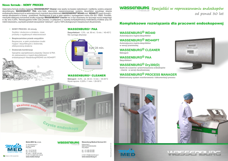 Nowa formuła - NOWY PROCES Optymalna formuła środka myjącego WASSENBURG® Cleaner oraz oparty na kwasie nadoctowym i nadtlenku wodoru preparat dezynfekcyjny WASSENBURG® PAA umożliwiły stworzenie zaawansowanego systemu dezynfekcji wysokiego stopnia endoskopów elastycznych w automatycznych myjniach dezynfektorach WASSENBURG® WD440 oraz WD440 PT (pass through) wersja wbudowana w ścianę - przelotowa. Rozwiązanie to jest w pełni zgodne z wymaganiami normy EN ISO 15883. Ponadto, niezwykle efektywny koncentrat środka myjącego WASSENBURG® Cleaner może być stosowany do ręcznego mycia wstępnego w stężeniu 0,25%. Niewiarygodnie krótki czas procesu, w połączeniu z wysoką kompatybilnością materiałową środków przy ich niskim dozowaniu, czynią ten produkt rzeczywiście "zielonym", czyli w 100% ekologicznym i bezpiecznym dla personelu. Specjaliści w reprocesowaniu endoskopów od ponad 30 lat Kompleksowe rozwiązania dla pracowni endoskopowej WASSENBURG® PAA + NOWY PROCES: 24 minuty Szybkie i skuteczne w działaniu, nowe produkty o wyjątkowych właściwościach Dezynfektant - 1,5% - ok. 90 ml. / 5 min. / 40-45°C Nie wymaga aktywacji + Bezpieczeństwo przede wszystkim WASSENBURG® WD440 Automatyczna myjnia-dezynfektor WASSENBURG® WD440PT Bezpieczne, w pełni przebadane środki myjące i dezynfekcyjne z doskonałą efektywnością działania Automatyczna myjnia-dezynfektor w wersji przelotowej Cykl 24 min. + Doskonała kombinacja WASSENBURG® CLEANER Detergent Specjalnie zaprojektowane preparaty Cleaner & PAA do zastosowania w myjach-dezynfektorach endoskopowych Wassenburg®WD440 ora WD440PT WASSENBURG® PAA Dezynfektant WASSENBURG® Dry300(D) Szafa do suszenia i przechowywania endoskopów - również w wersji dwudrzwiowej WASSENBURG® PROCESS MANAGER WASSENBURG® CLEANER Elektroniczny system monitorowania i dokumentacji procesu Detergent - 0,5% - ok. 30 ml. / 3 min. / 40-45°C Mycie ręczne - 0,25% / 1 min. / 20-35°C Skażone endos ko py zdrowie to radość życia Printed on 100% recycled fibre yste endoskopy Media-MED Sp. z o.o. Wassenburg Medical Devices B.V. ul. Promienistych 7 31-481 Kraków POLSKA Edisonring 9 6669 NA DODEWAARD HOLANDIA tel.: 12 413 94 90 fax: 12 378 35 02 tel. kom. + 48 697 915 953 e-mail: [email protected] tel.: +31 488 453 686 fax: +31 488 453 685 www.media-med.pl www.wassenburg.nl e-mail: [email protected] Wassenburg 201511-03 Cz zdrowie to radość życia Automatyczne myjnie - dezynfektory do endoskopów elastycznych WASSENBURG® WD440 Automatyczna myjnia-dezynfektor Automatyczna szafa do suszenia i przechowywania endoskopów + Zadbaj o swoje endoskopy + Myjnia na 2 endoskopy Dwie niezależne komory umożliwiają asynchroniczne mycie i dezynfekcję 2 endoskopów Bezpieczne suszenie oraz przechowywanie 10 endoskopów w kontrolowanych warunkach nawet do 28 dni WASSENBURG®DRY300 Szafa do suszenia i przechowywania endoskopów elastycznych w kontrolowanych warunkach + Endoskopy zawsze gotowe do użycia + Innowacyjne rozwiązania firmy Wassenburg Kolorowy ekran dotykowy w technologii LED Intuicyjna i łatwa obsługa urządzenia Identyfikacja użytkowników oraz endoskpów Bezdotykowe otwieranie komory pedałem nożnym Kontrola niezależnie w każdym kanale endoskopu: podłączenia, szczelności, przepływu, ciśnienia, zatorów + Wydajny proces Specjalna konstrukcja spiralnej tuby, w której umieszczana jest część diagnostyczna endoskopu, wymusza silną cyrkulację płynów gwarantując efektywność mycia i dezynfekcji Właściwe warunki przechowywania endoskopów zapobiegają ponownej kontaminacji i wzrostowi bakterii po procesie mycia i dezynfekcji wysokiego stopnia Spełnia wymagania normy EN 16442 + Urządzenie również w wersji dwudrzwiowej do zabudowy i wbudowanym kompresorem Szafa Wassenburg® DRY300 występuje w wersji przelotowej do zabudowy w ścianę, co umożliwia wbudowanie urządzenia pomiędzy strefę skażoną i czystą. W przypadku braku instalacji sprężonego powietrzna występuje wersja z kompresorem + Kontrola obiegu endoskopów System Wassenburg® PROCESS MANAGER pozwala na pełną kontrolę zarówno faz cyklu mycia,dezynfekcji oraz przechowywania endoskopów, jak również ich miejsca pobytu + Maksimum bezpieczeństwa Unikatowa technologia firmy Wassenburg: indywidualne podłączenie każdego kanału zapewniające rzeczywistą separację kanałów oraz pełną kontrolę procesu WASSENBURG® WD440PT Automatyczna myjnia-dezynfektor w wersji przelotowej + Zgodność z EN ISO 15883-1/-4 Rozwiązania spełniające wymagania norm w pełnym zakresie, z dodatkowym systemem IMS (Niezależny System Monitorowania) dającym podwójną kontrolę krytycznych parametrów procesu + Optymalne rozwiązanie - minimum ryzyka Rewolucyjna konstrukcja wersji przelotowej myjni endoskopowej Wassenburg® WD440PT, pozwala na wbudowanie jej w ścianę, dzięki czemu możliwe jest fizyczne wydzielenie stref skażonej i czystej. + Zgodność z dyrektywą 93/42 EWG i normą EN 16442 Szafa Wassenburg® DRY300 jest wyrobem medycznym klasy I i spełnia wszystkie wymagania opisane w dyrektywie o wyrobach medycznych oraz normie EN 16442 + Uniwersalność rozwiązania Szafa Wassenburg® DRY300, pozwala na przechowywanie endoskopów każdego producenta. Duży wybór uchwytów oraz przyłączy endoskopowych pozwala na właściwe, pionowe i optymalne zawieszenie aparatów + Potwierdzona jakość Wbudowany skaner kodów kreskowych ułatwia wprowadzanie danych użytkownika oraz endoskopu. Zintegrowana drukarka drukuje raport dokumentujący właściwe warunki przechowywania WASSENBURG® PROCESS MANAGER Elektroniczny system monitorowania i dokumentacji procesu + Prosta instalacja oraz intuicyjna obsługa + Monitorowanie i komputerowa archiwizacja parametrów cyklu na www.media-med.pl każdym etapie procesu mycia, dezynfekcji, suszenia i przechowywania + Monitorowanie endoskopów oraz personelu + Alarmy i powiadomienia + Analiza danych, kalkulacja kosztów, rapo